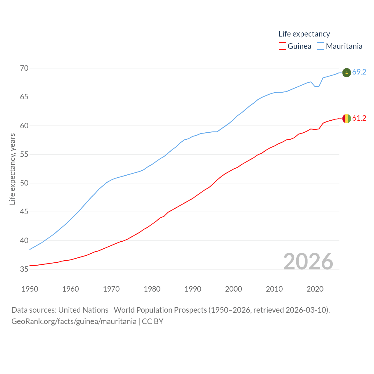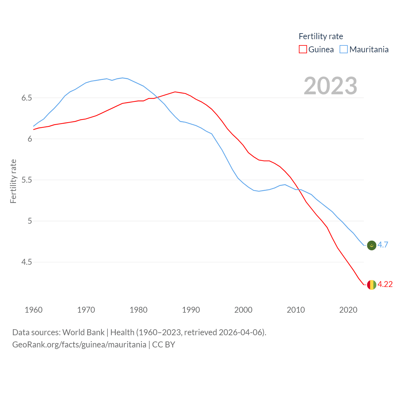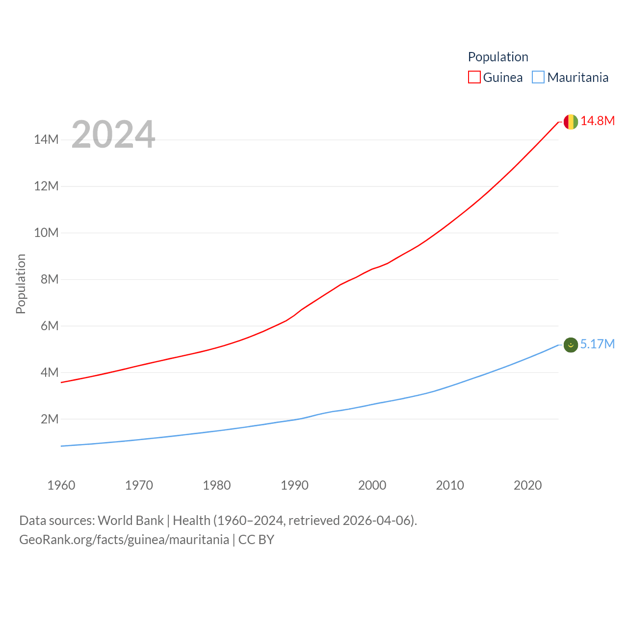 Guinea has a population of 14.8M (ranked 75/197), compared with 5.17M in Mauritania (ranked 125/197). Guinea's land area is 94,873 sq mi versus 397,955 sq mi for Mauritania (ranked 77th vs. 28th).