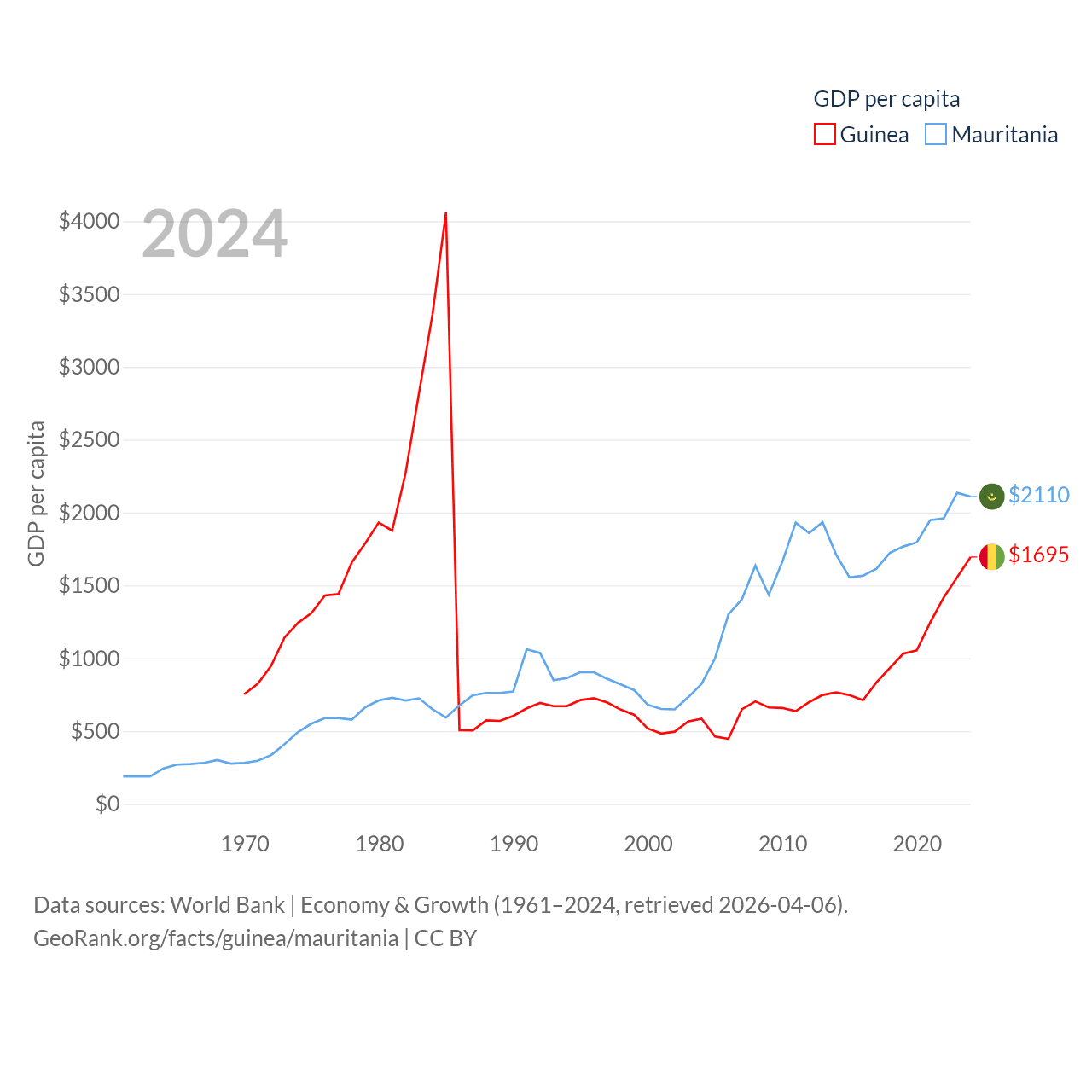 By GDP, Guinea ranks 118/197 ($25B) and Mauritania ranks 153/197 ($10.9B). By GDP per capita, Guinea ranks 160/197 ($1,695), while Mauritania ranks 156/197 ($2,110).