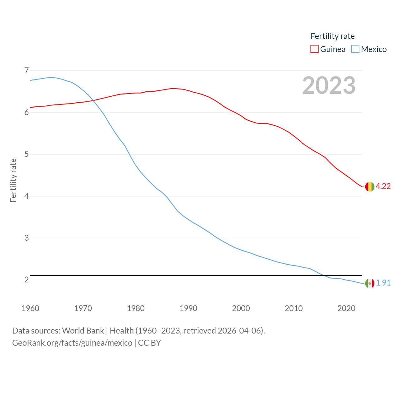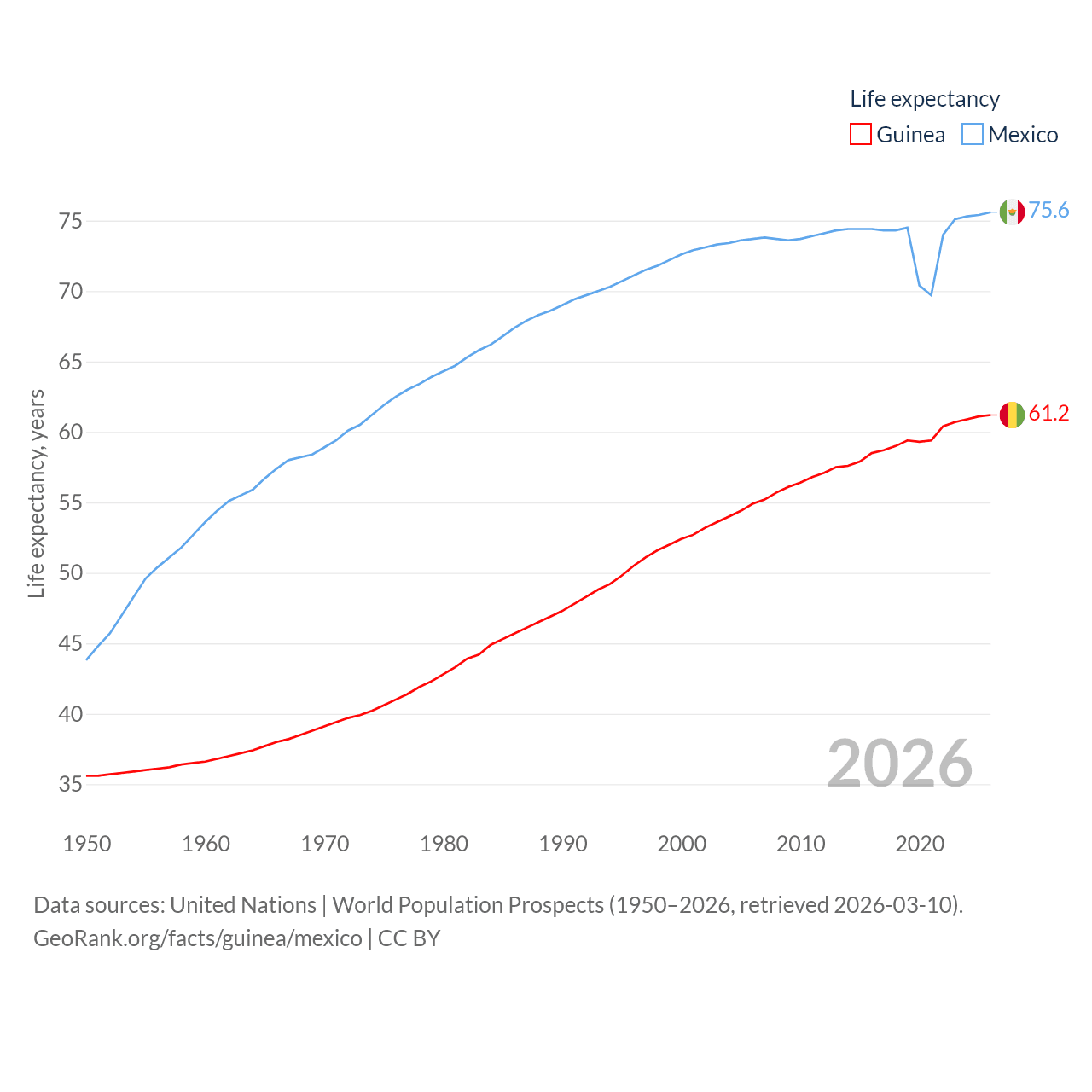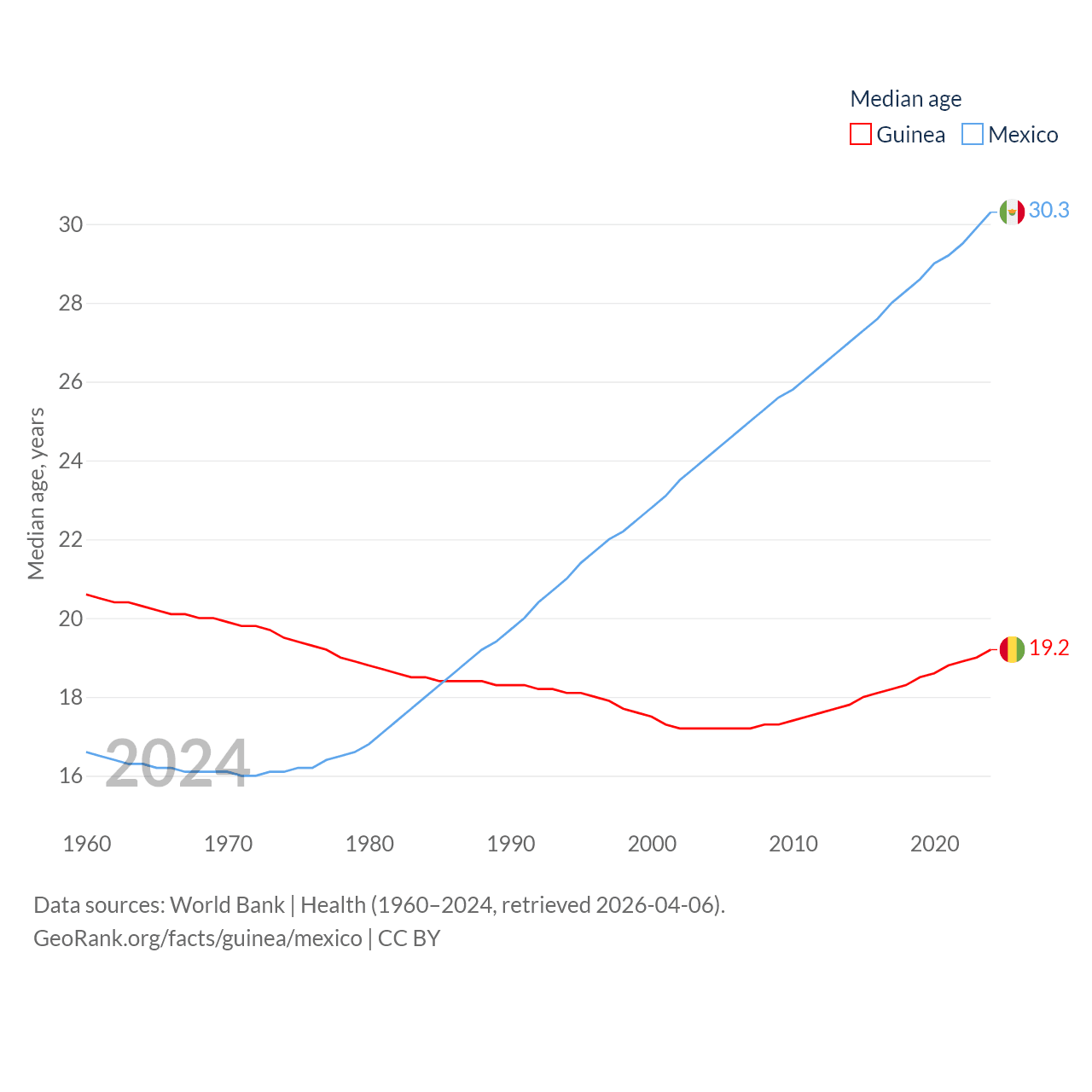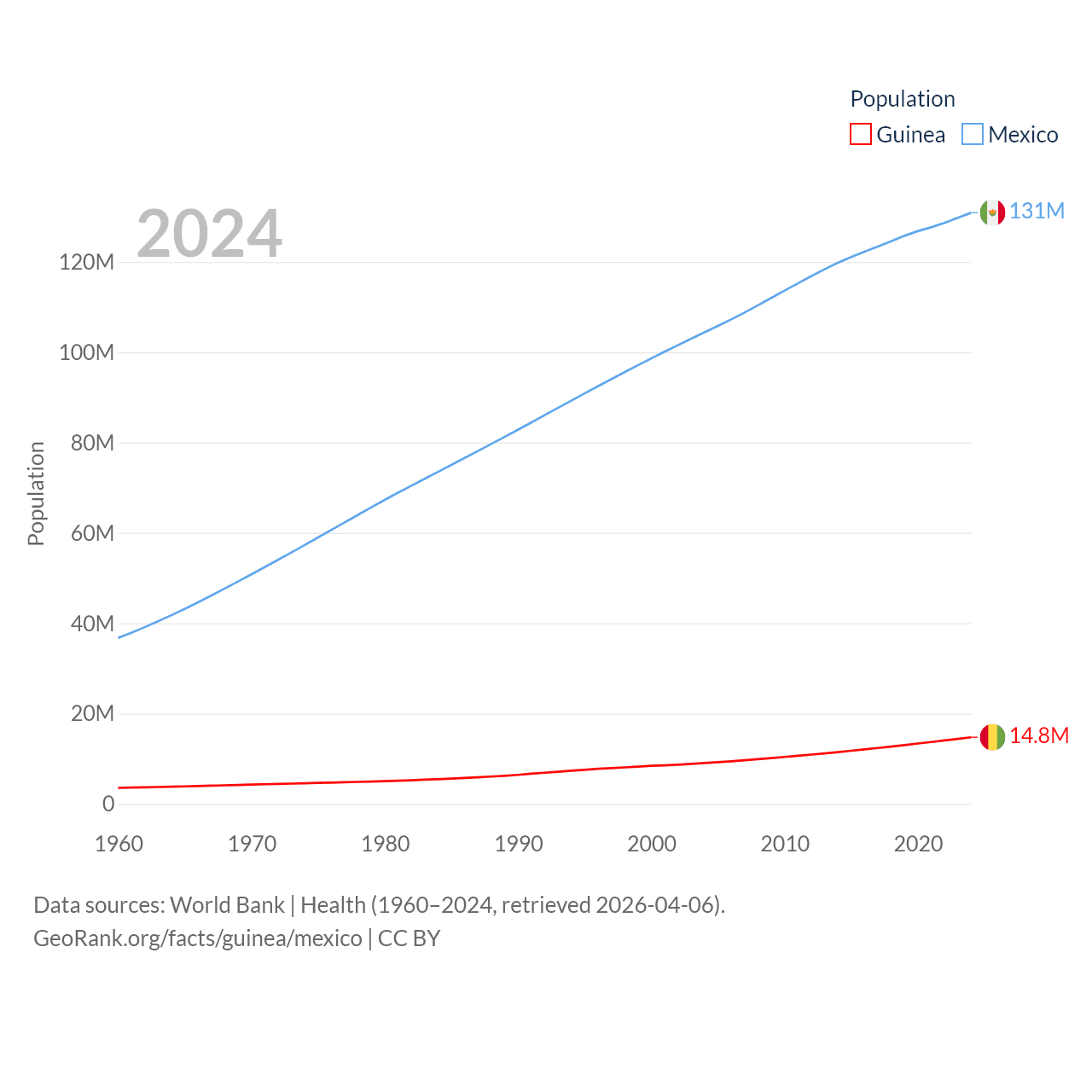 Guinea has a population of 14.8M (ranked 75/197), compared with 131M in Mexico (ranked 11/197). Guinea's land area is 94,873 sq mi versus 750,563 sq mi for Mexico (ranked 77th vs. 13th).
