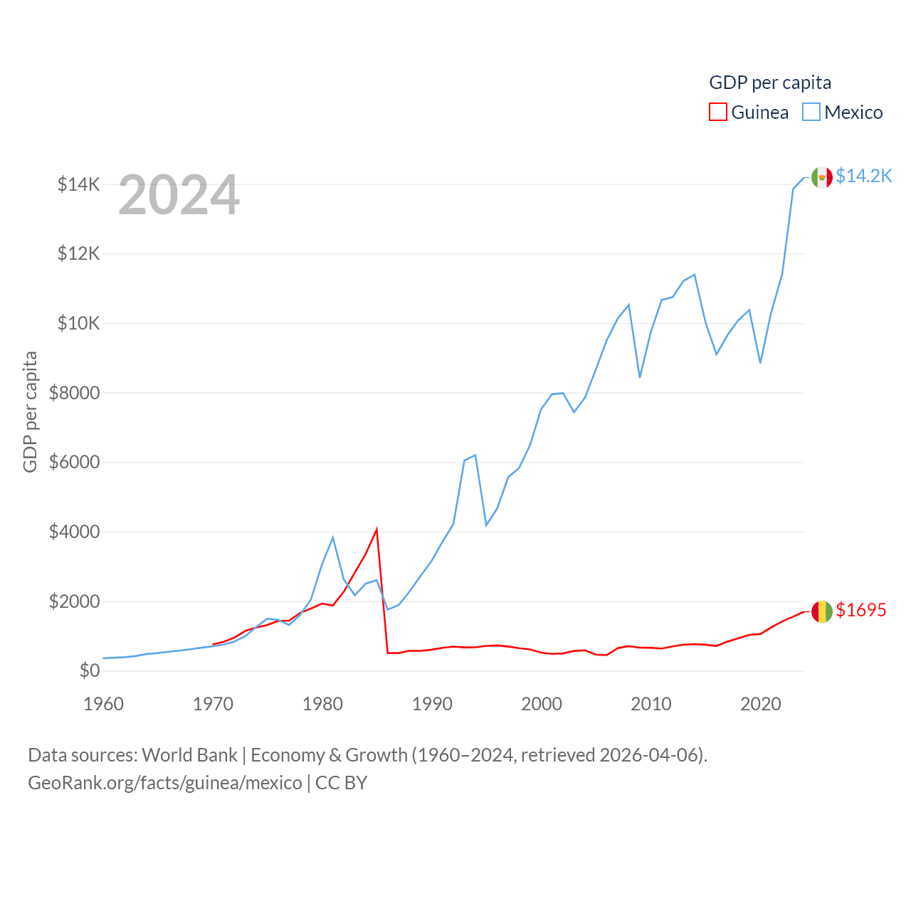 By GDP, Guinea ranks 118/197 ($25B) and Mexico ranks 13/197 ($1.86T). By GDP per capita, Guinea ranks 160/197 ($1,695), while Mexico ranks 69/197 ($14,186).