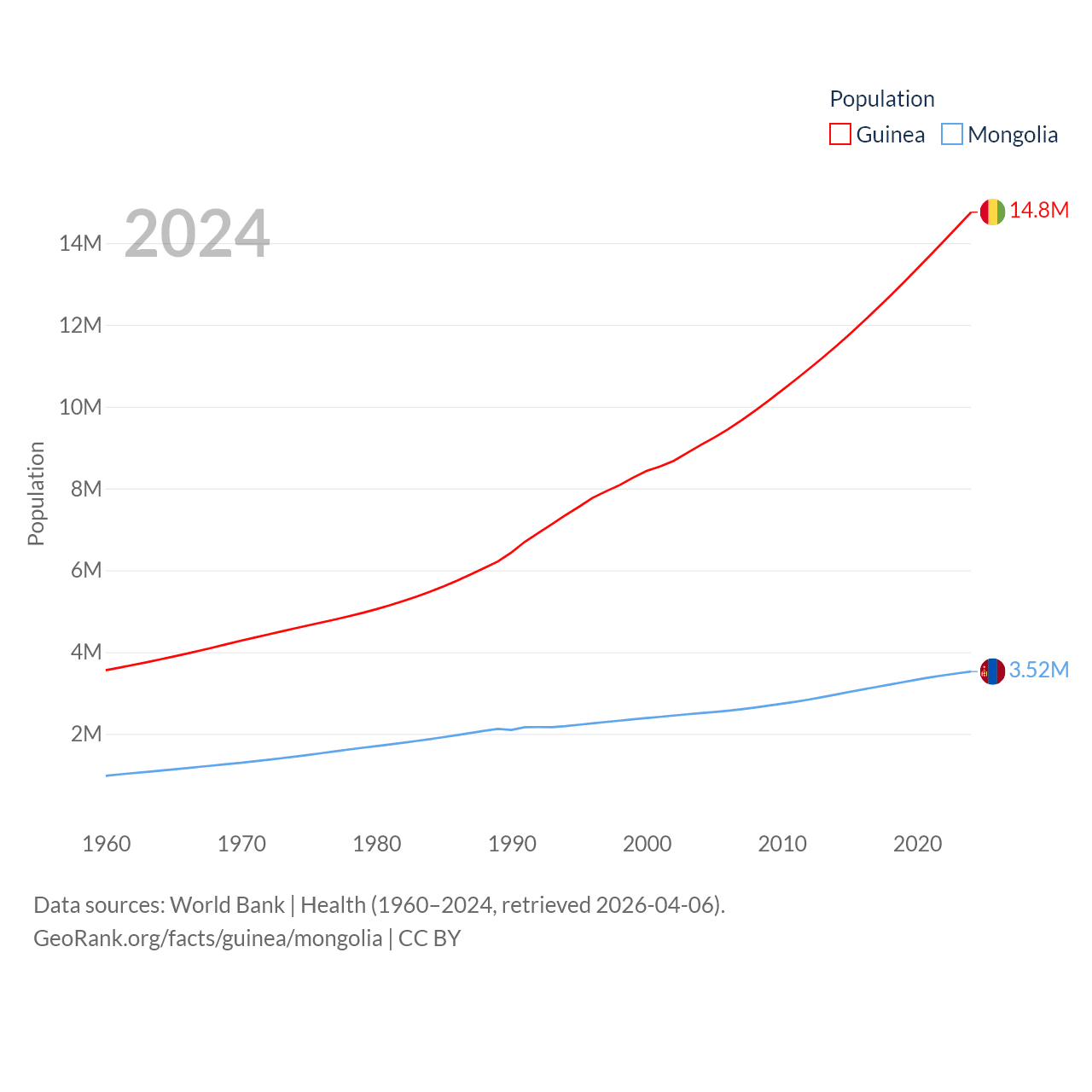 Guinea has a population of 14.8M (ranked 75/197), compared with 3.52M in Mongolia (ranked 132/197). Guinea's land area is 94,873 sq mi versus 601,740 sq mi for Mongolia (ranked 77th vs. 18th).