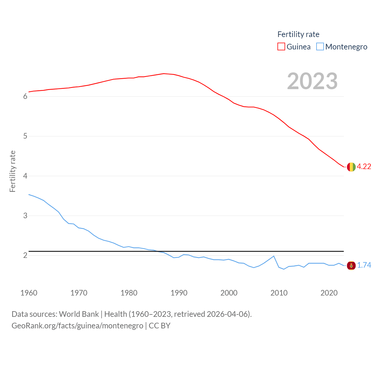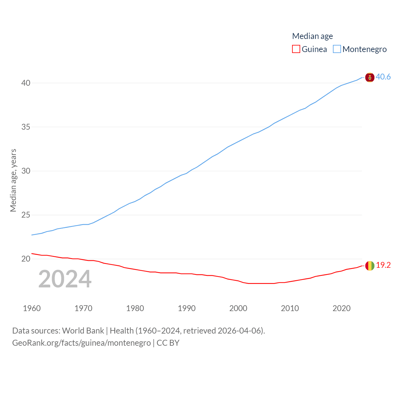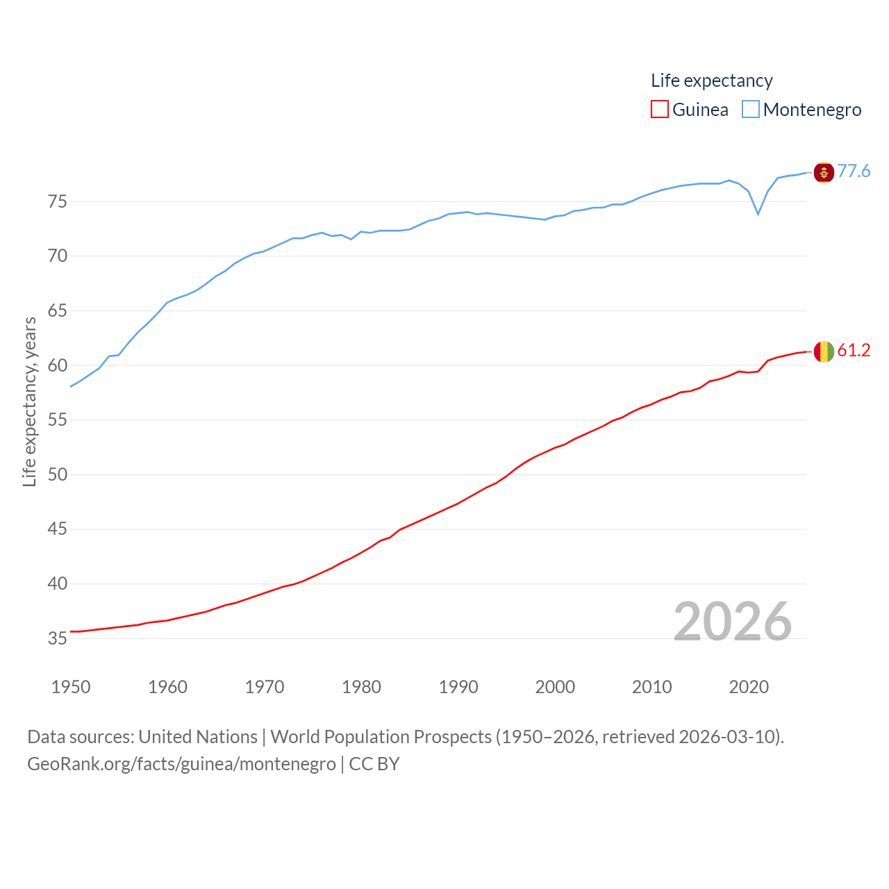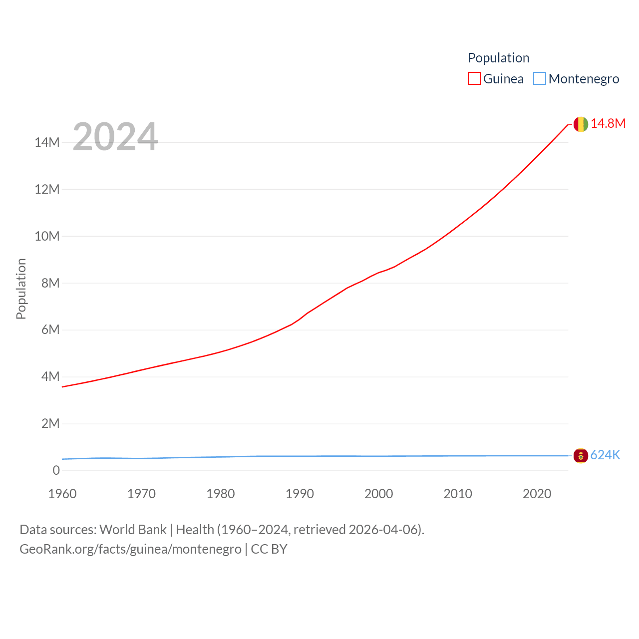 Guinea has a population of 14.8M (ranked 75/197), compared with 624K in Montenegro (ranked 166/197). Guinea's land area is 94,873 sq mi versus 5,193 sq mi for Montenegro (ranked 77th vs. 156th).