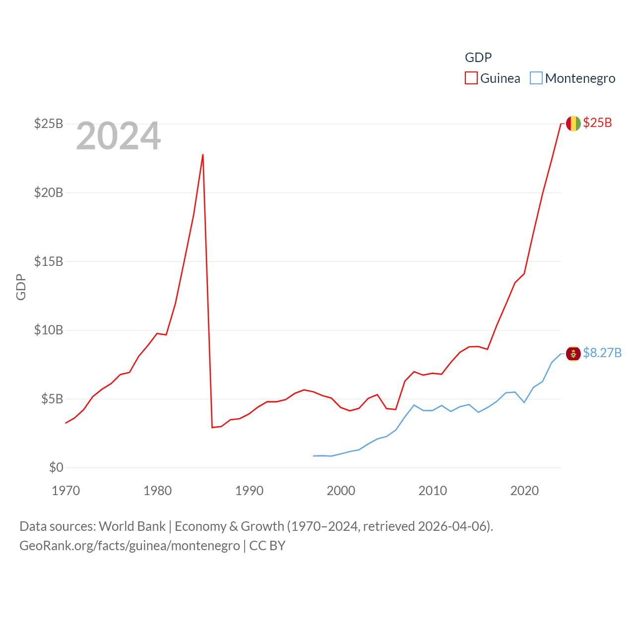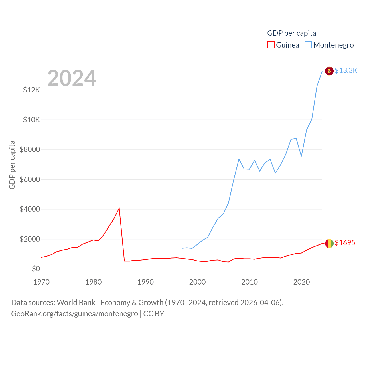 By GDP, Guinea ranks 118/197 ($25B) and Montenegro ranks 155/197 ($8.27B). By GDP per capita, Guinea ranks 160/197 ($1,695), while Montenegro ranks 77/197 ($13,263).