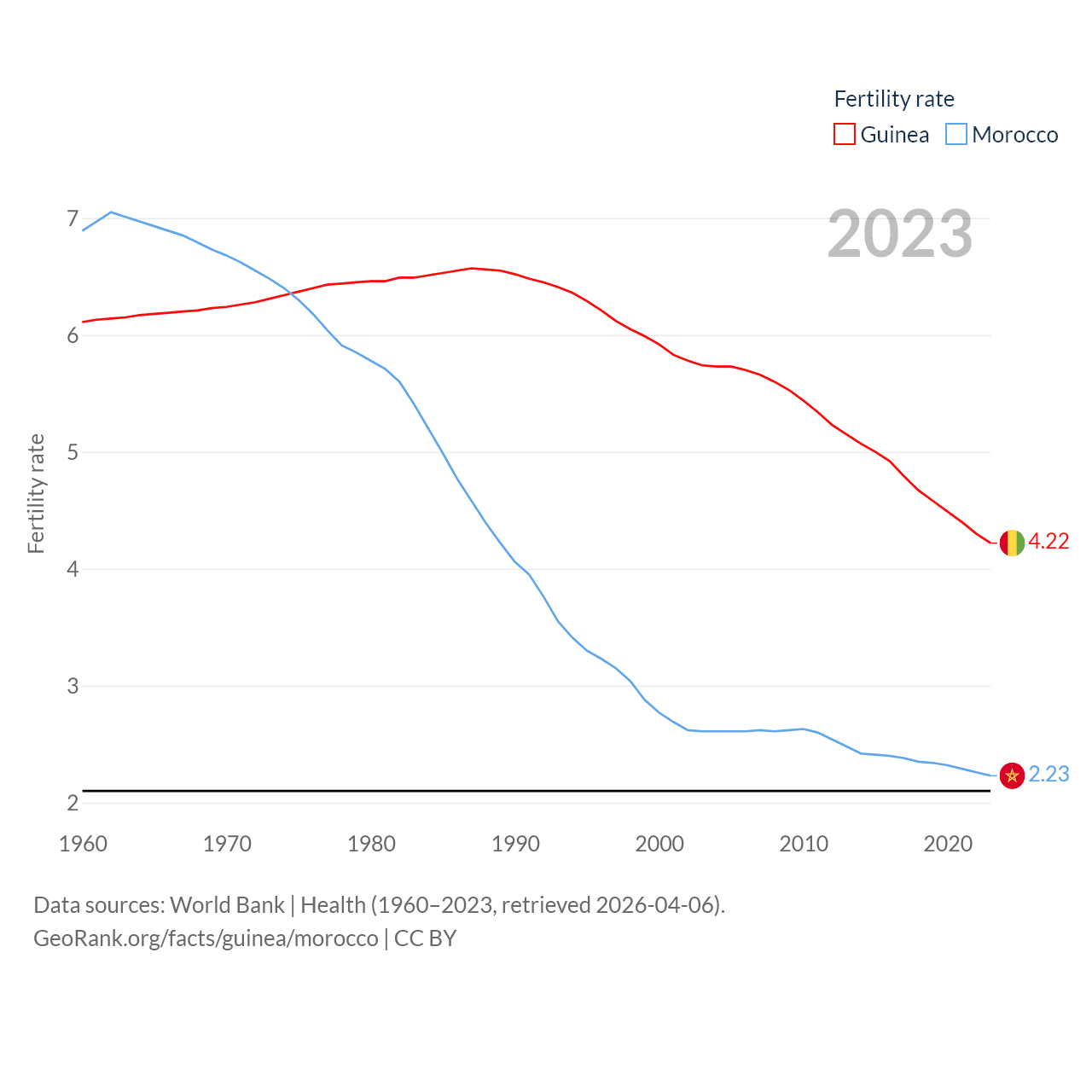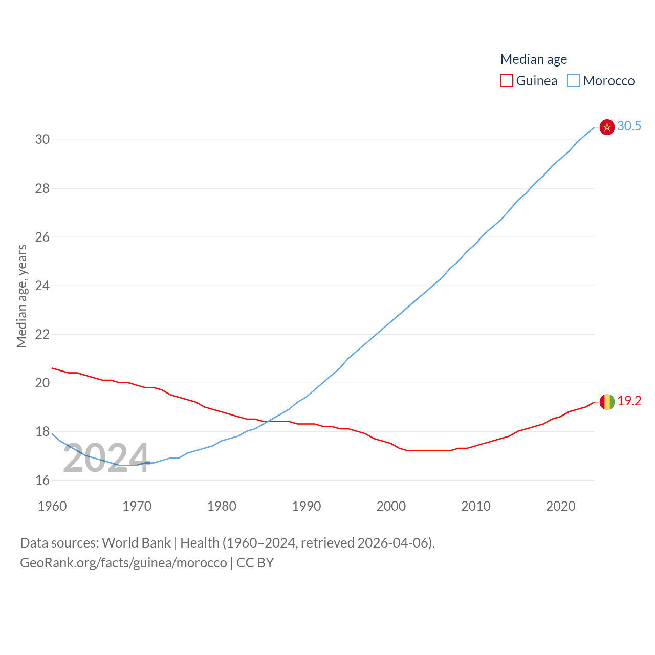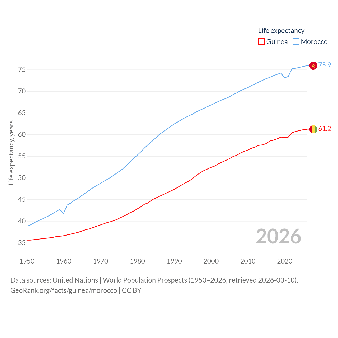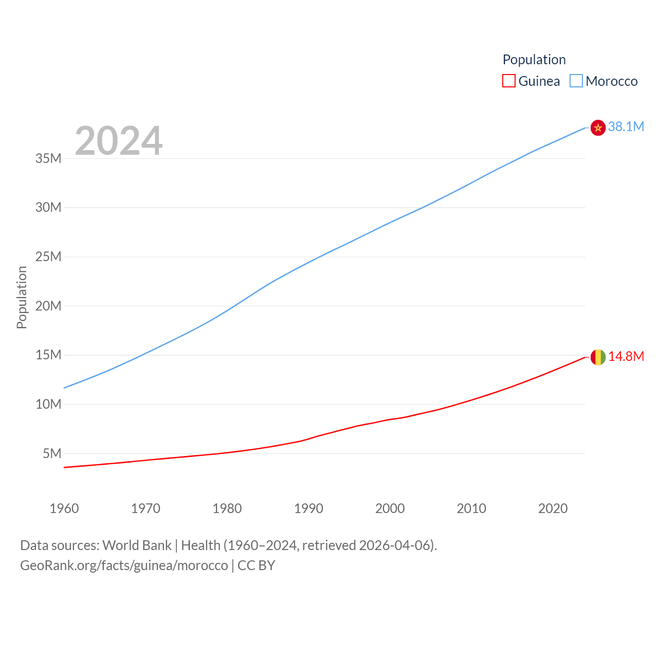 Guinea has a population of 14.8M (ranked 75/197), compared with 38.1M in Morocco (ranked 39/197). Guinea's land area is 94,873 sq mi versus 172,317 sq mi for Morocco (ranked 77th vs. 55th).
