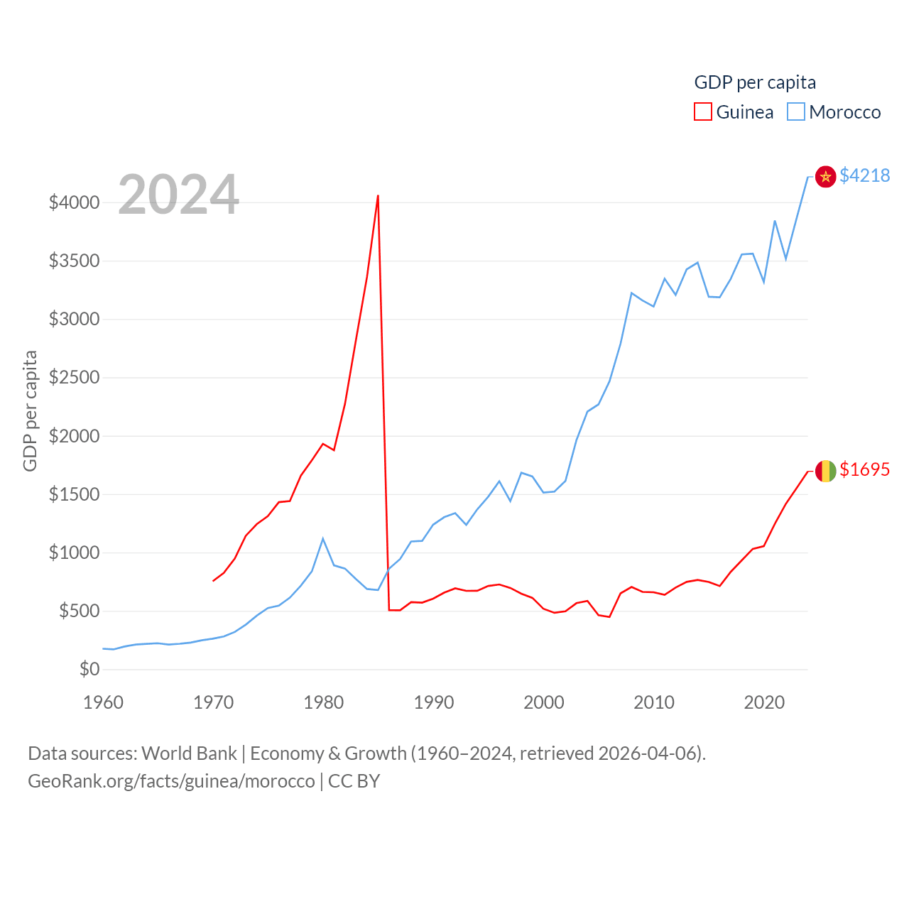 By GDP, Guinea ranks 118/197 ($25B) and Morocco ranks 58/197 ($161B). By GDP per capita, Guinea ranks 160/197 ($1,695), while Morocco ranks 127/197 ($4,218).