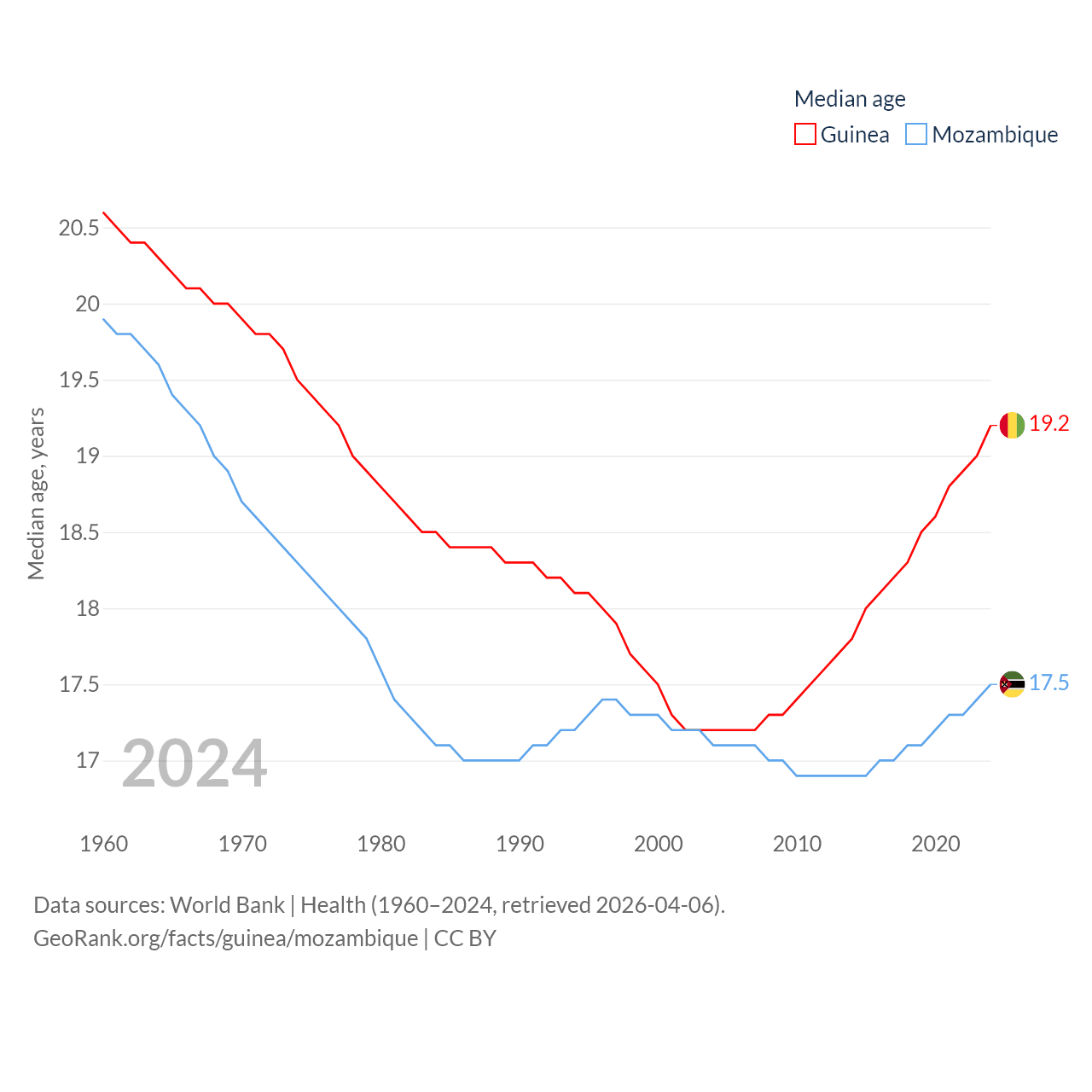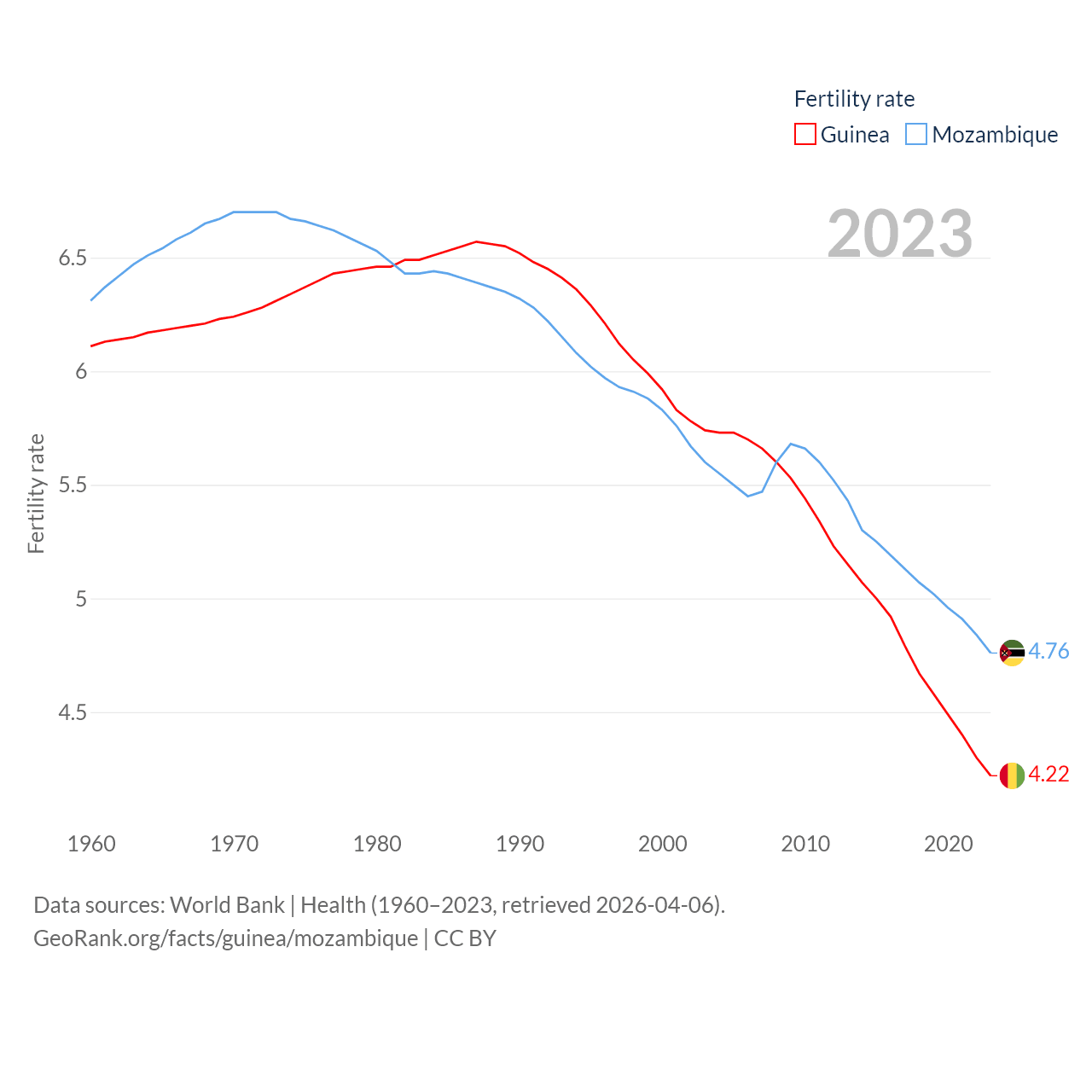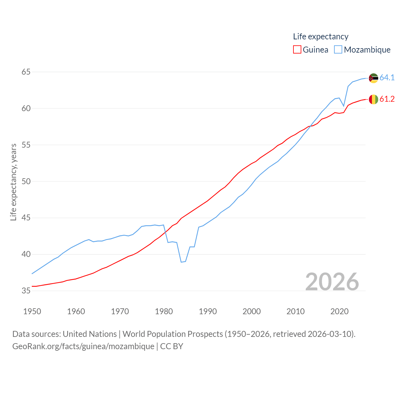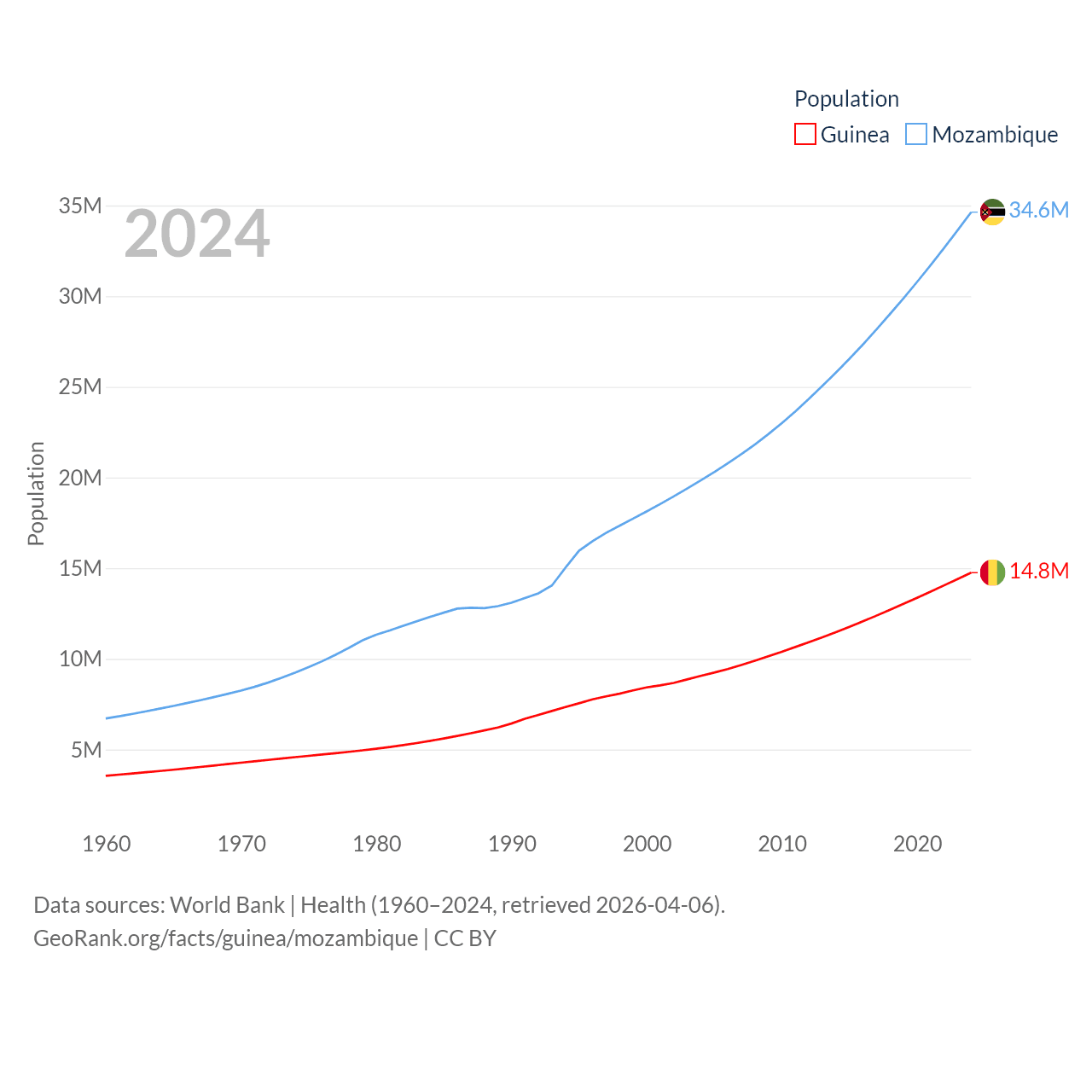 Guinea has a population of 14.8M (ranked 75/197), compared with 34.6M in Mozambique (ranked 46/197). Guinea's land area is 94,873 sq mi versus 303,623 sq mi for Mozambique (ranked 77th vs. 34th).