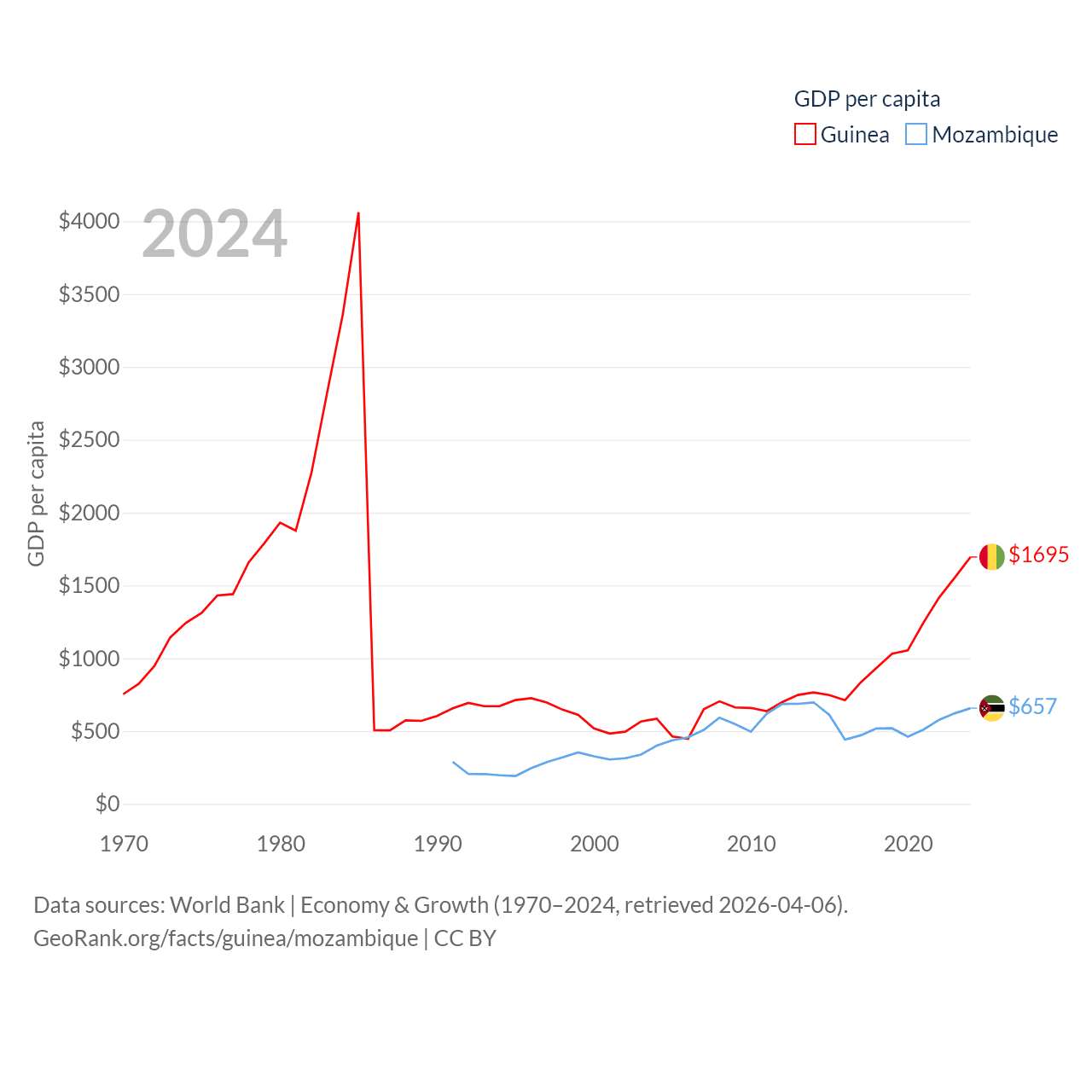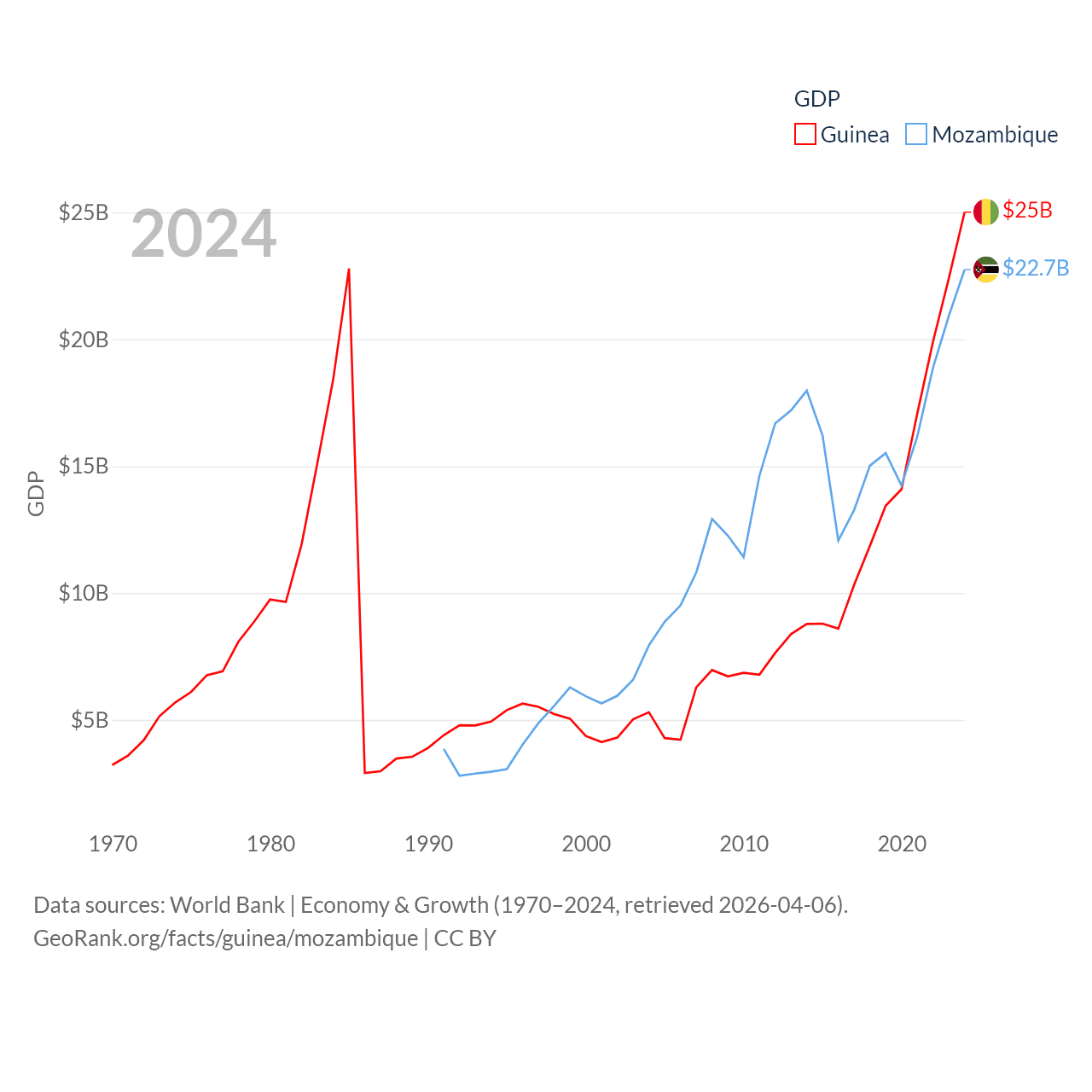 By GDP, Guinea ranks 118/197 ($25B) and Mozambique ranks 123/197 ($22.7B). By GDP per capita, Guinea ranks 160/197 ($1,695), while Mozambique ranks 189/197 ($657).