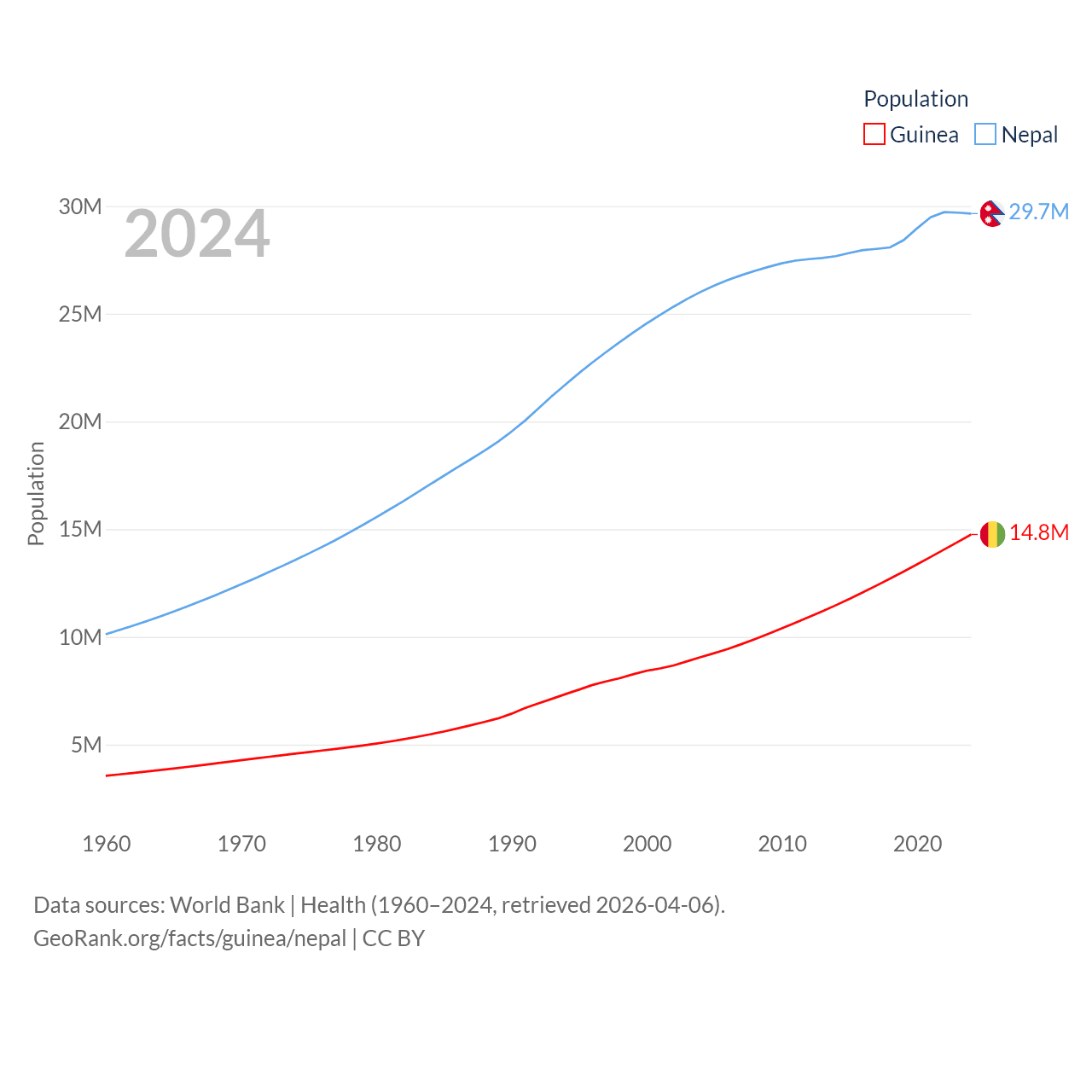 Guinea has a population of 14.8M (ranked 75/197), compared with 29.7M in Nepal (ranked 51/197). Guinea's land area is 94,873 sq mi versus 55,348 sq mi for Nepal (ranked 77th vs. 92nd).