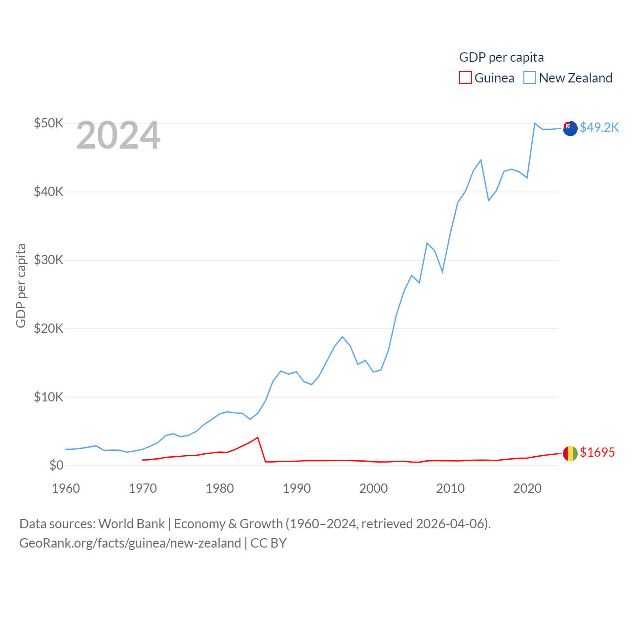 By GDP, Guinea ranks 118/197 ($25B) and New Zealand ranks 52/197 ($260B). By GDP per capita, Guinea ranks 160/197 ($1,695), while New Zealand ranks 26/197 ($49,205).