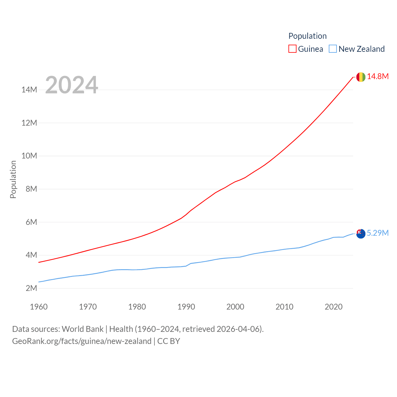 Guinea has a population of 14.8M (ranked 75/197), compared with 5.29M in New Zealand (ranked 123/197). Guinea's land area is 94,873 sq mi versus 101,665 sq mi for New Zealand (ranked 77th vs. 74th).