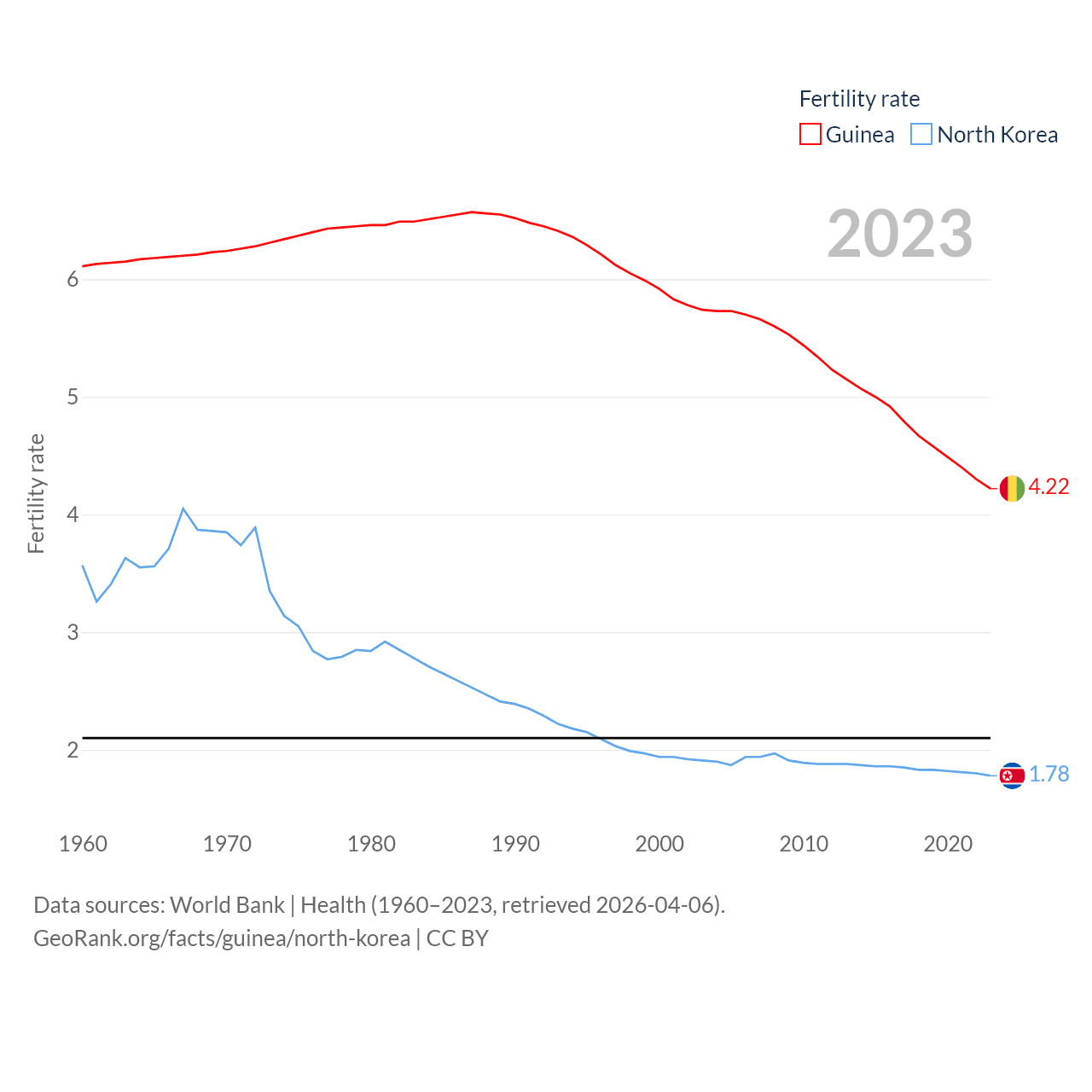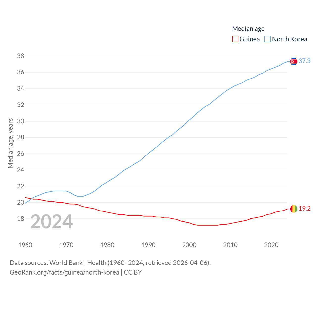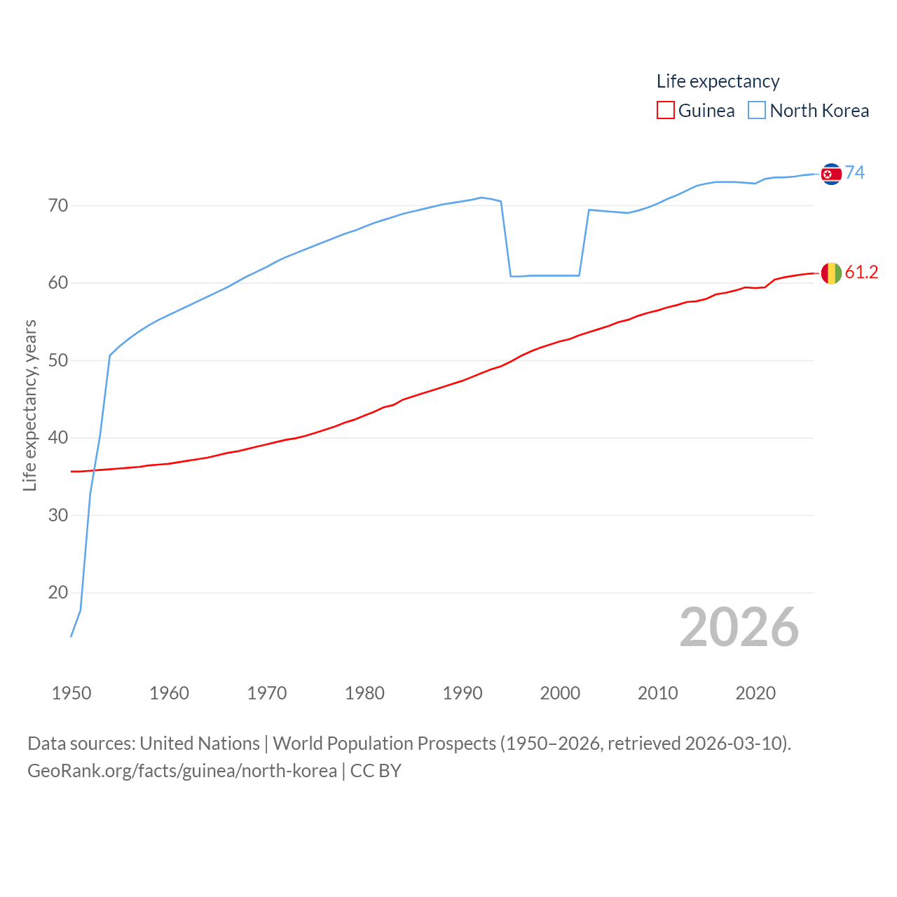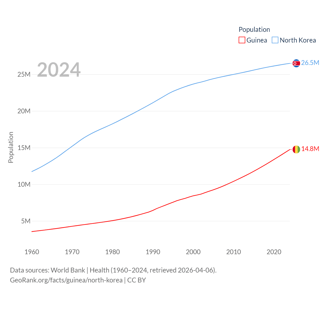 Guinea has a population of 14.8M (ranked 75/197), compared with 26.5M in North Korea (ranked 56/197). Guinea's land area is 94,873 sq mi versus 46,491 sq mi for North Korea (ranked 77th vs. 97th).