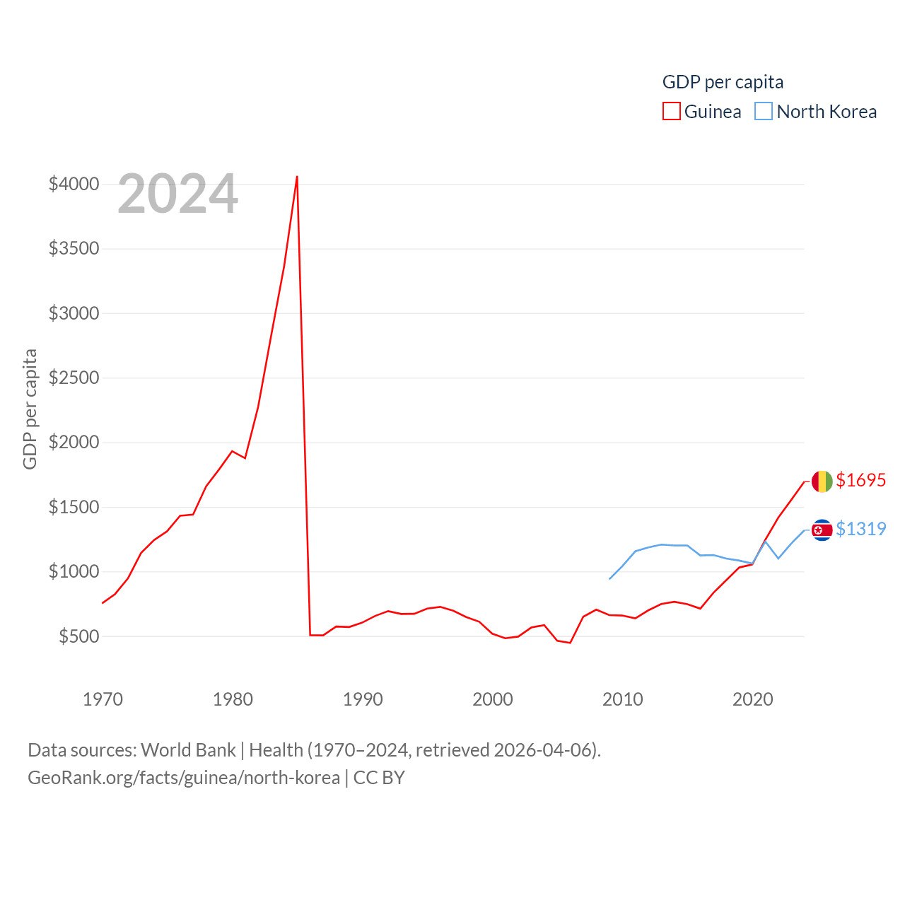 By GDP, Guinea ranks 118/197 ($25B) and North Korea ranks 106/197 ($34.9B). By GDP per capita, Guinea ranks 160/197 ($1,695), while North Korea ranks 168/197 ($1,319).