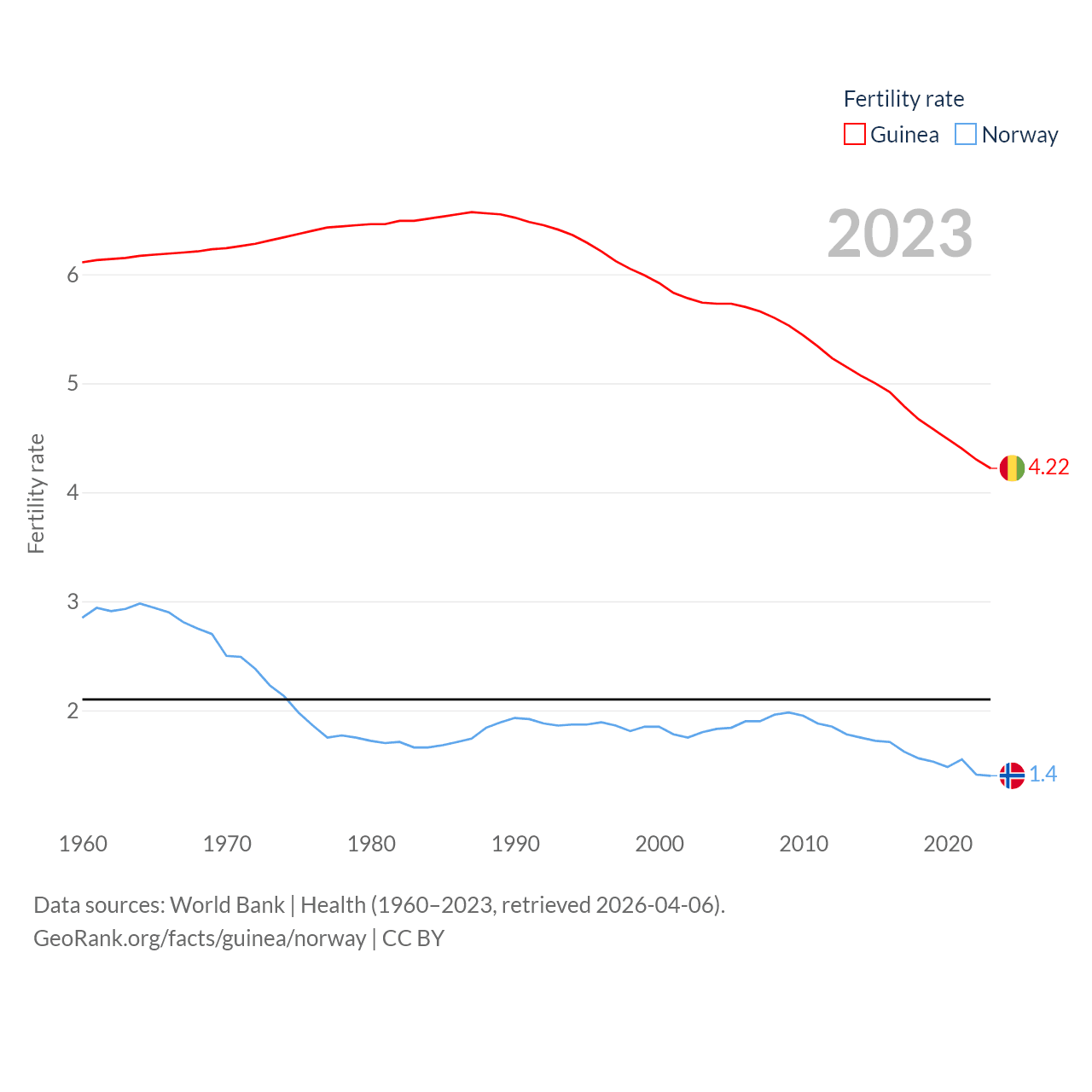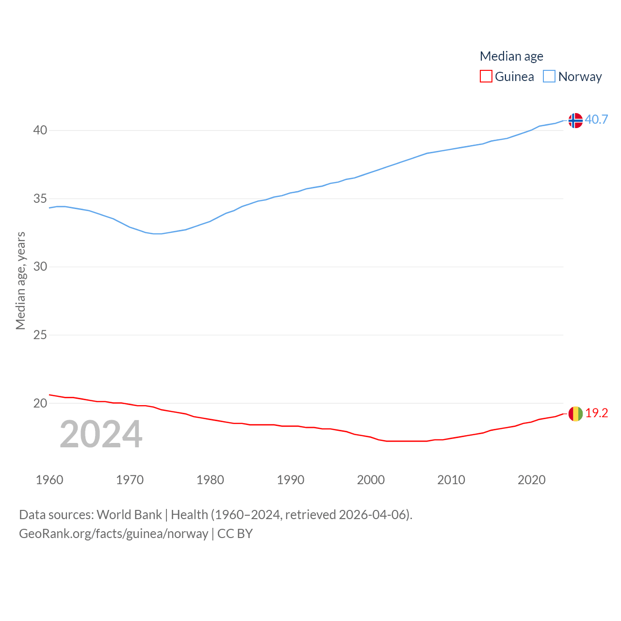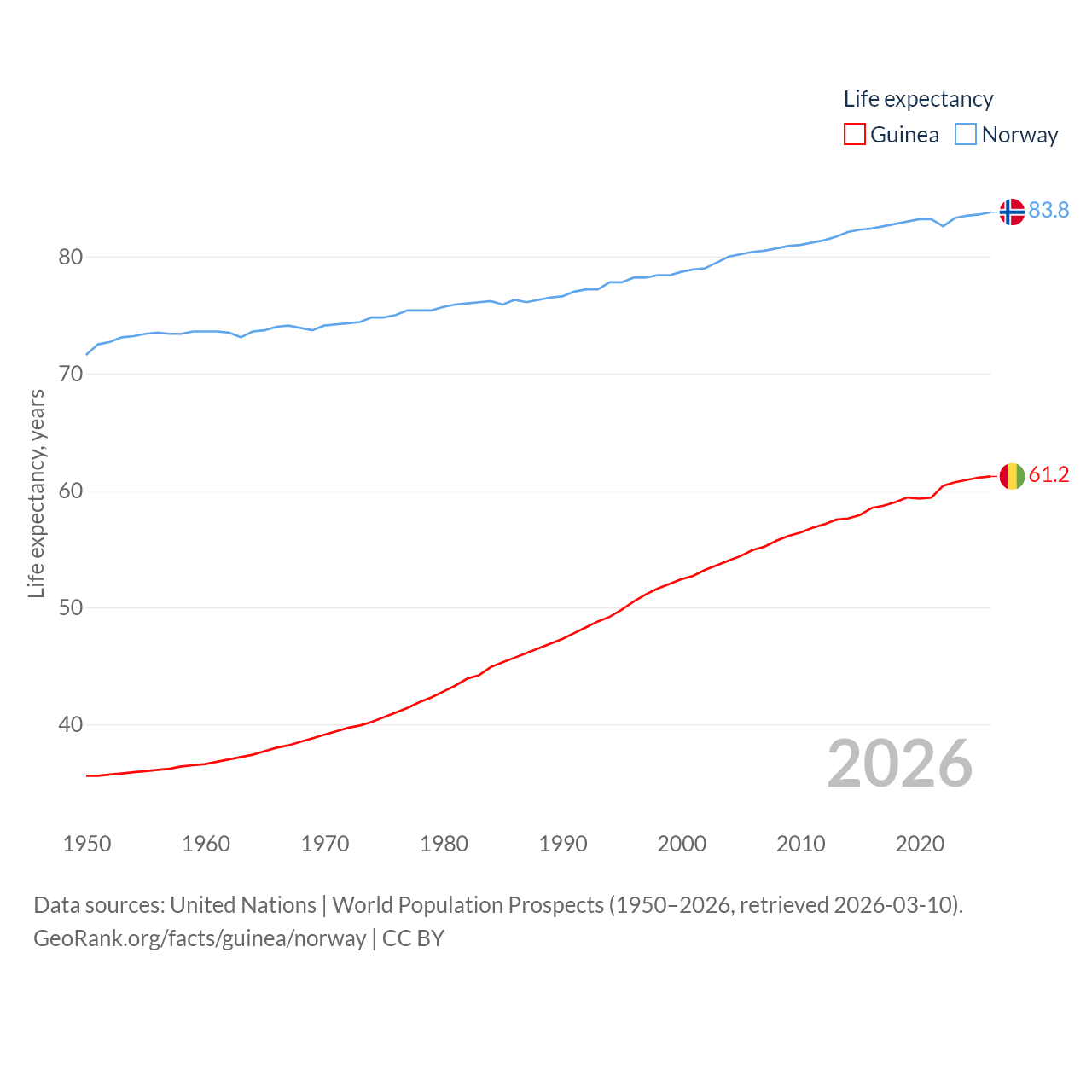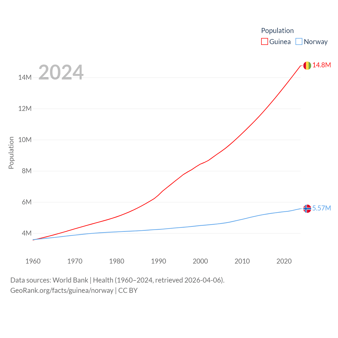 Guinea has a population of 14.8M (ranked 75/197), compared with 5.57M in Norway (ranked 118/197). Guinea's land area is 94,873 sq mi versus 140,645 sq mi for Norway (ranked 77th vs. 62nd).