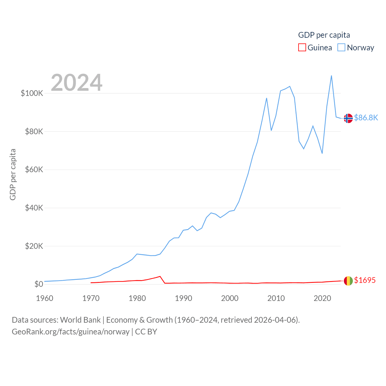 By GDP, Guinea ranks 118/197 ($25B) and Norway ranks 32/197 ($484B). By GDP per capita, Guinea ranks 160/197 ($1,695), while Norway ranks 8/197 ($86,785).