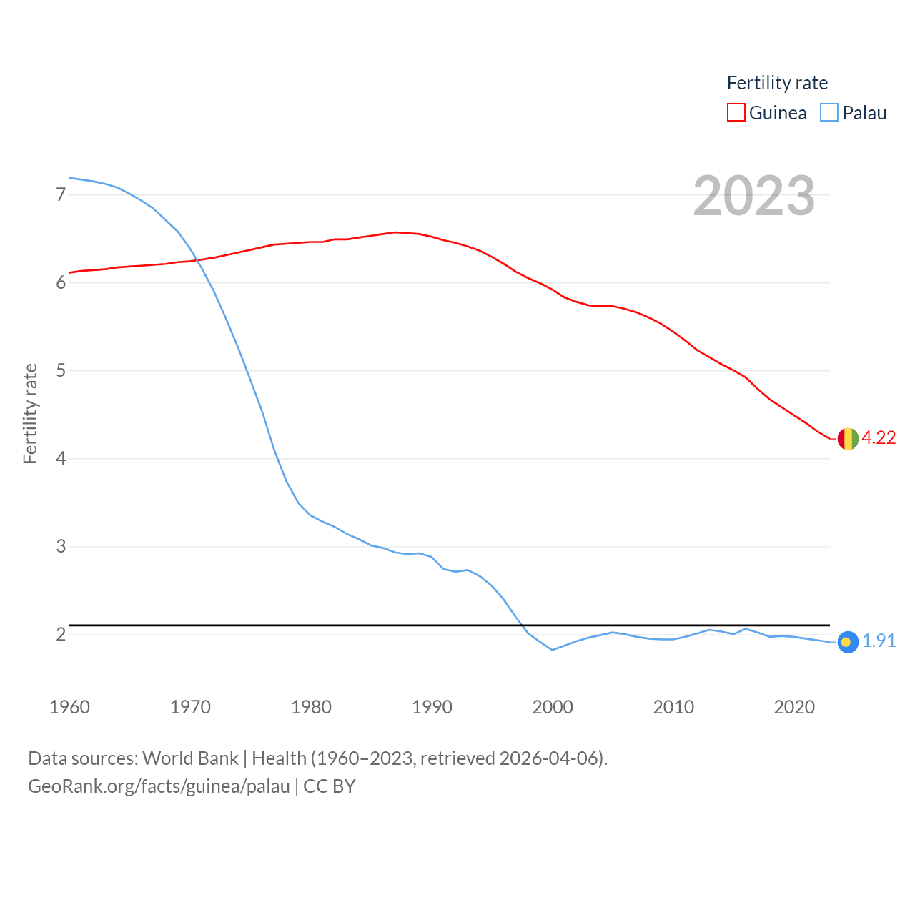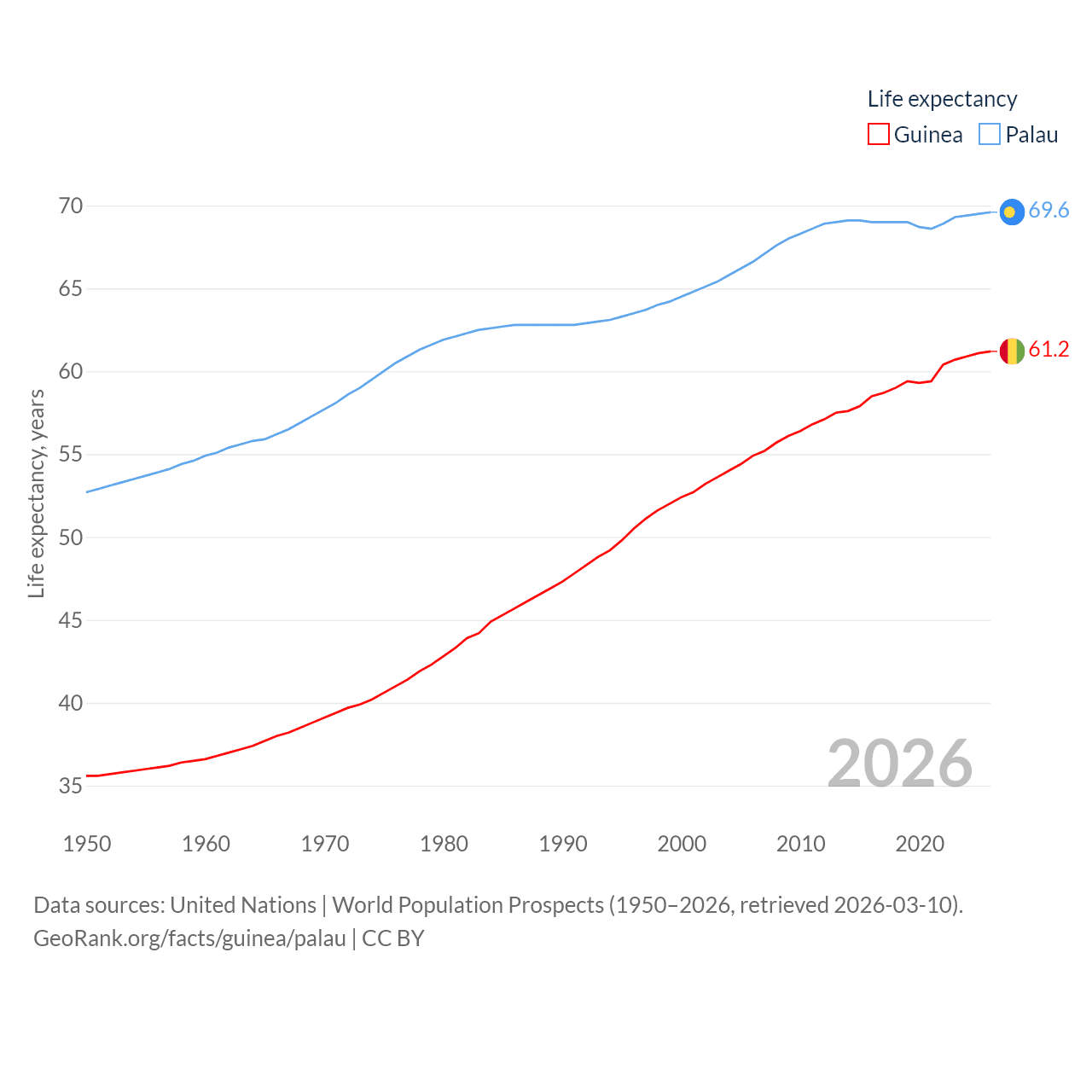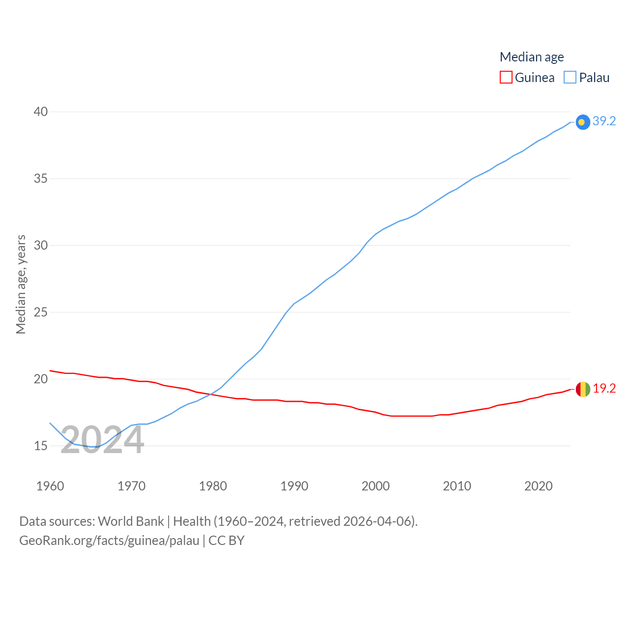 Guinea has a population of 14.8M (ranked 75/197), compared with 17.7K in Palau (ranked 194/197). Guinea's land area is 94,873 sq mi versus 177.6 sq mi for Palau (ranked 77th vs. 180th).