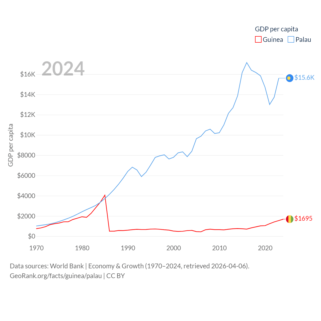 By GDP, Guinea ranks 118/197 ($25B) and Palau ranks 194/197 ($277M). By GDP per capita, Guinea ranks 160/197 ($1,695), while Palau ranks 67/197 ($15,611).