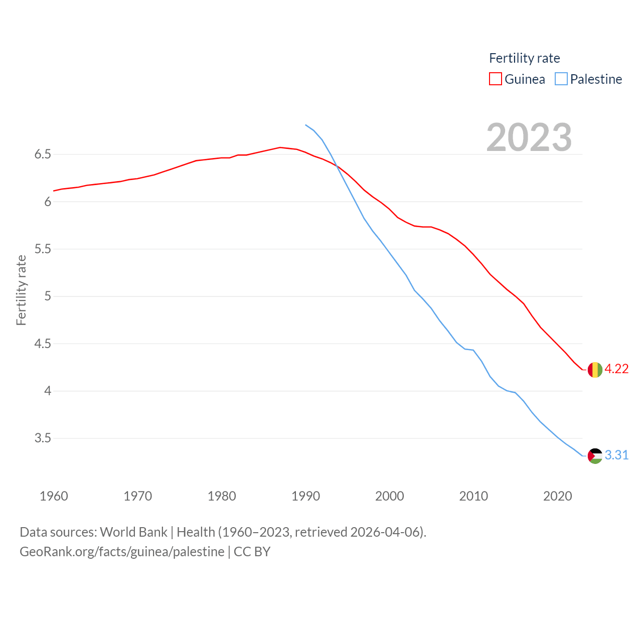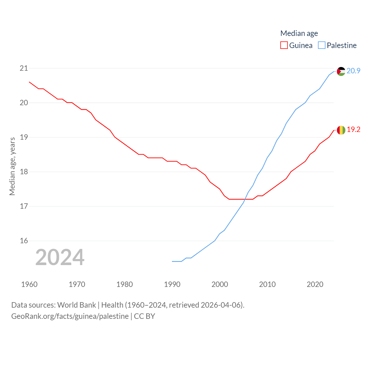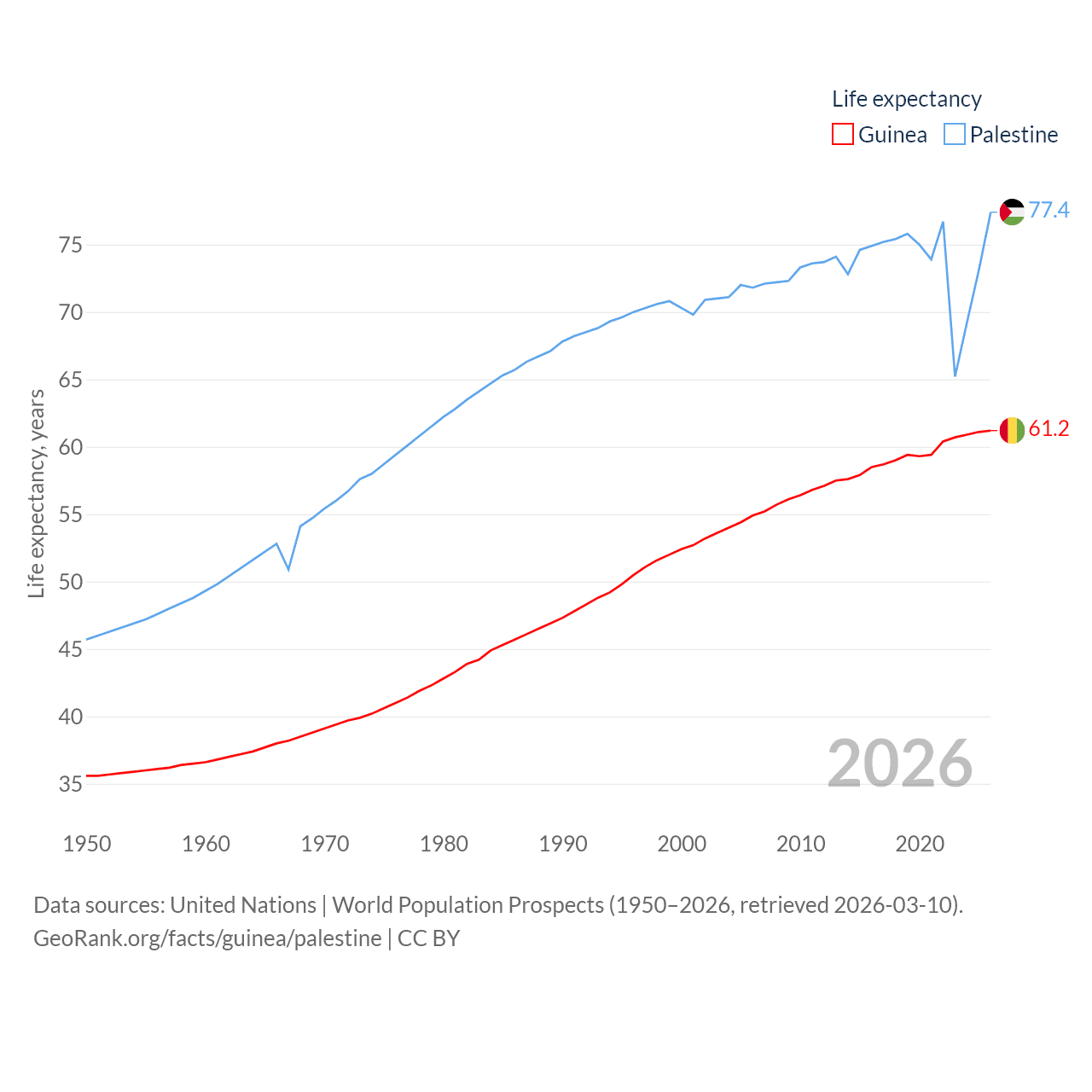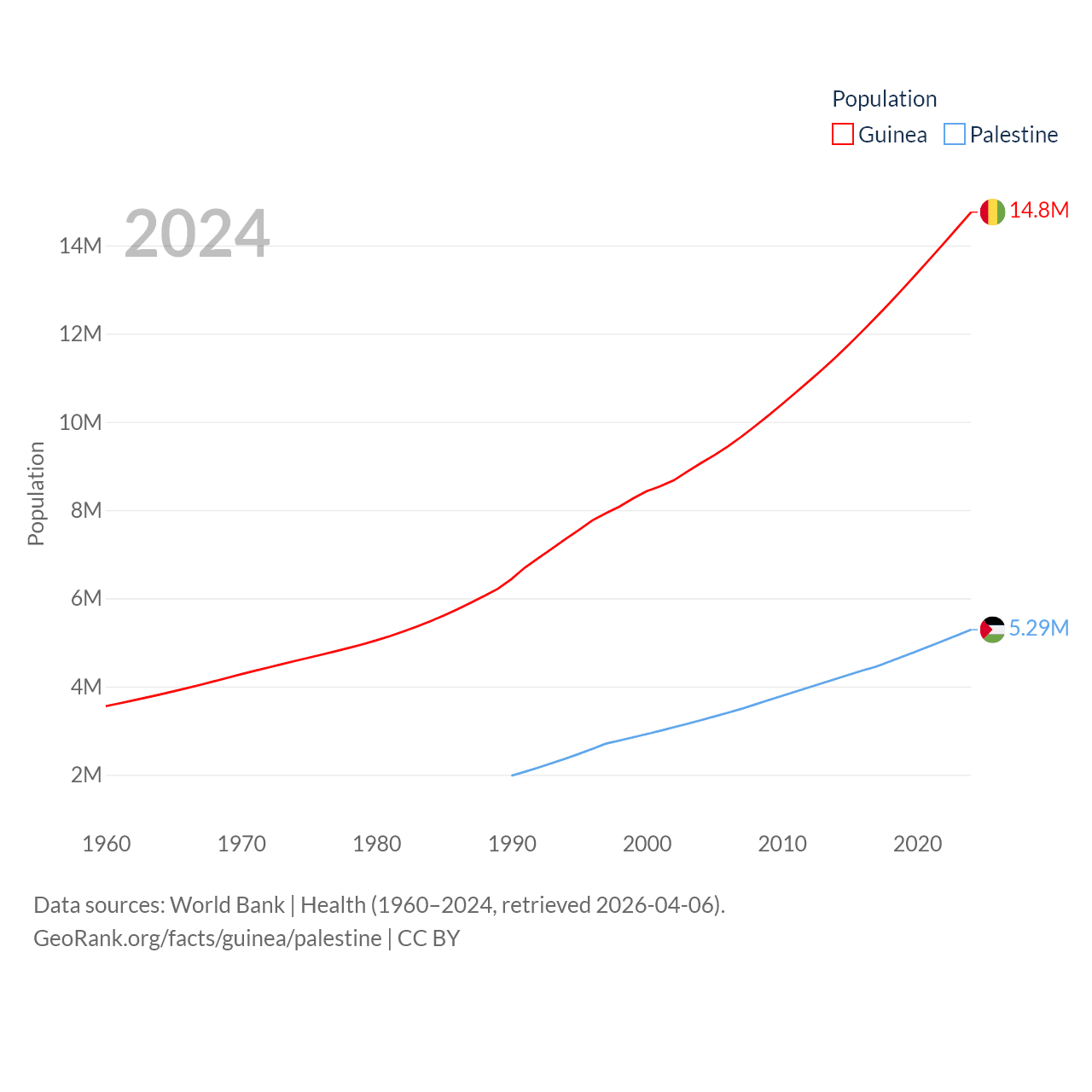 Guinea has a population of 14.8M (ranked 75/197), compared with 5.29M in Palestine (ranked 122/197). Guinea's land area is 94,873 sq mi versus 2,326 sq mi for Palestine (ranked 77th vs. 164th).