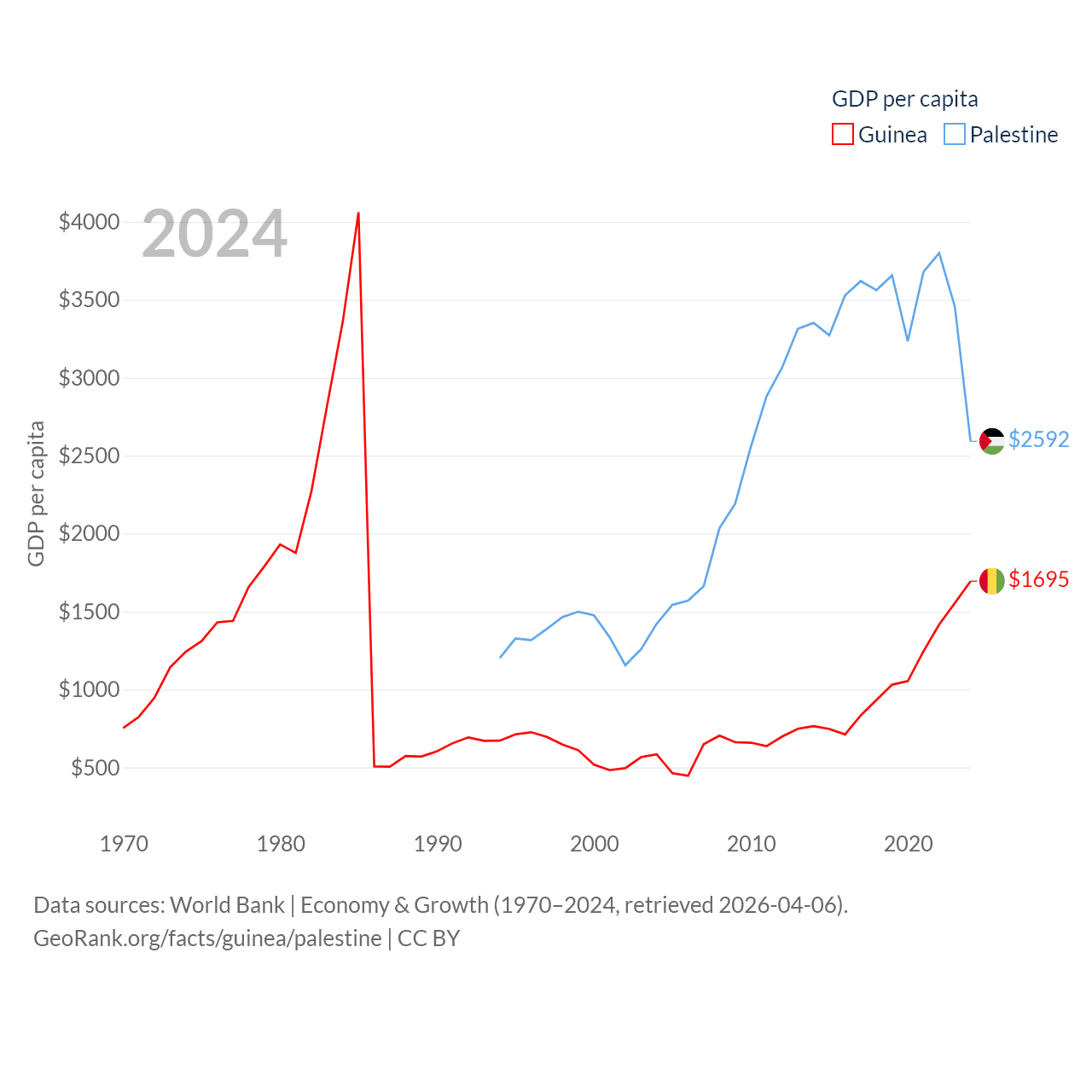By GDP, Guinea ranks 118/197 ($25B) and Palestine ranks 146/197 ($13.7B). By GDP per capita, Guinea ranks 160/197 ($1,695), while Palestine ranks 147/197 ($2,592).