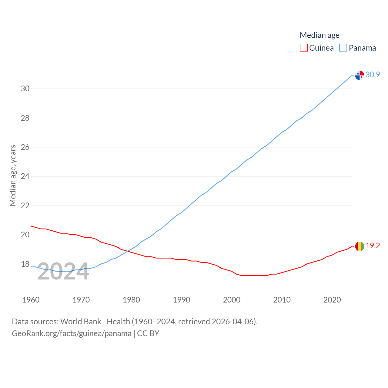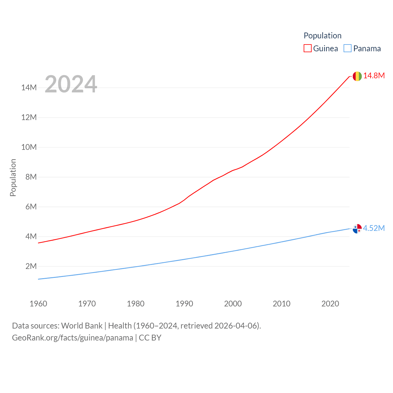 Guinea has a population of 14.8M (ranked 75/197), compared with 4.52M in Panama (ranked 128/197). Guinea's land area is 94,873 sq mi versus 28,641 sq mi for Panama (ranked 77th vs. 115th).