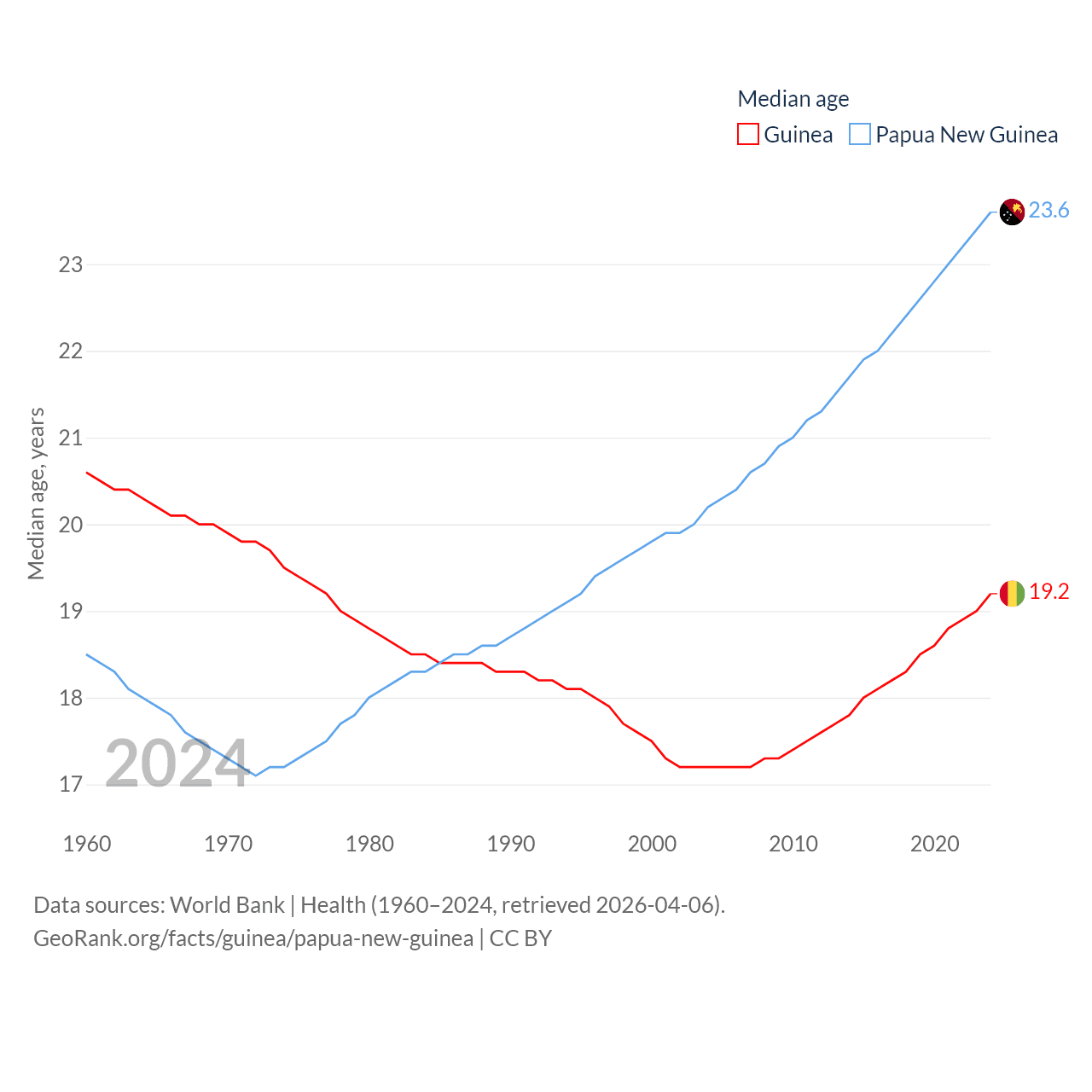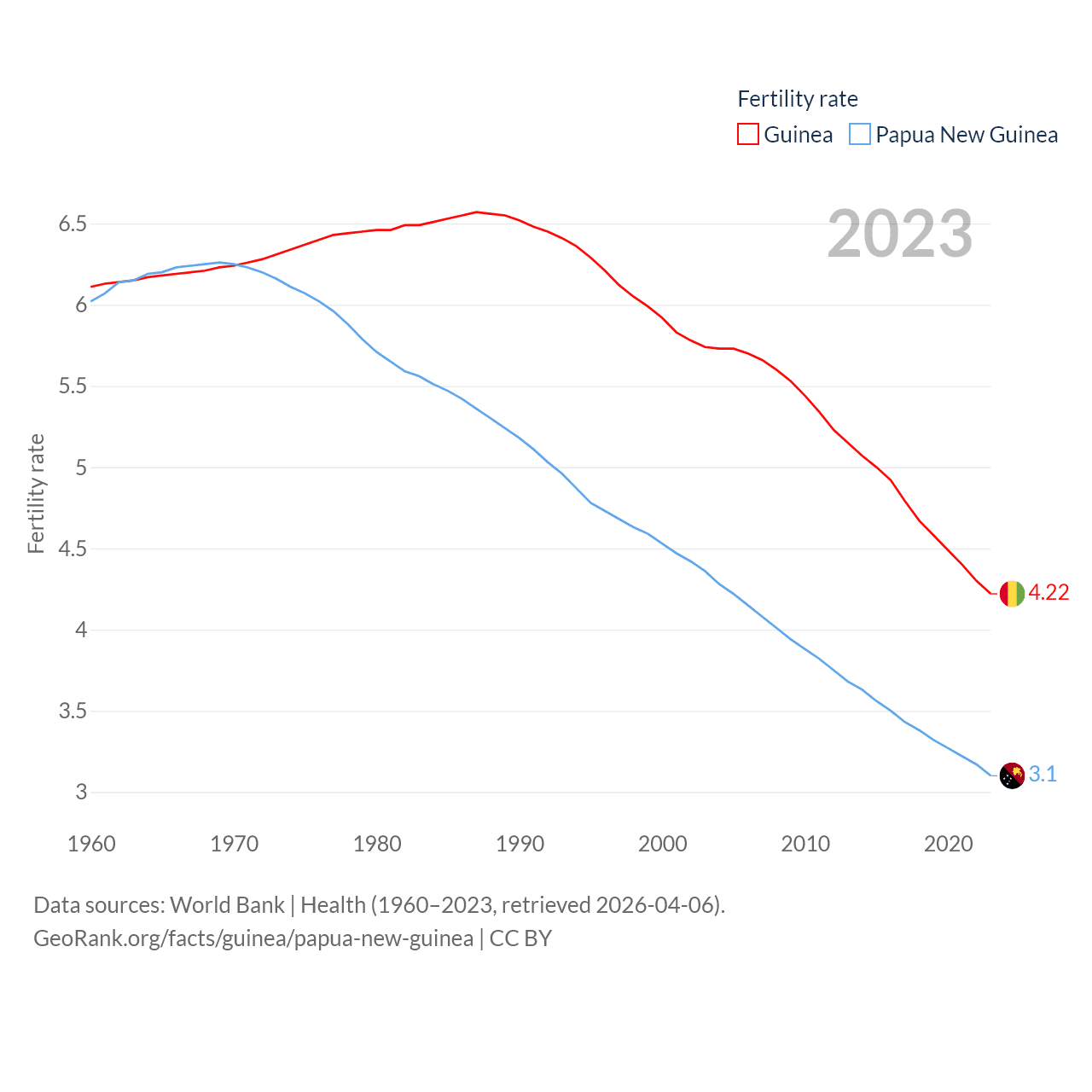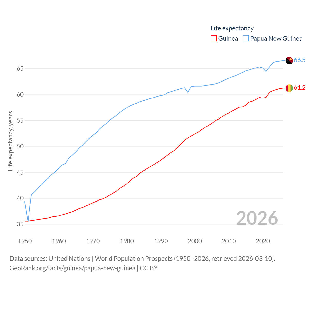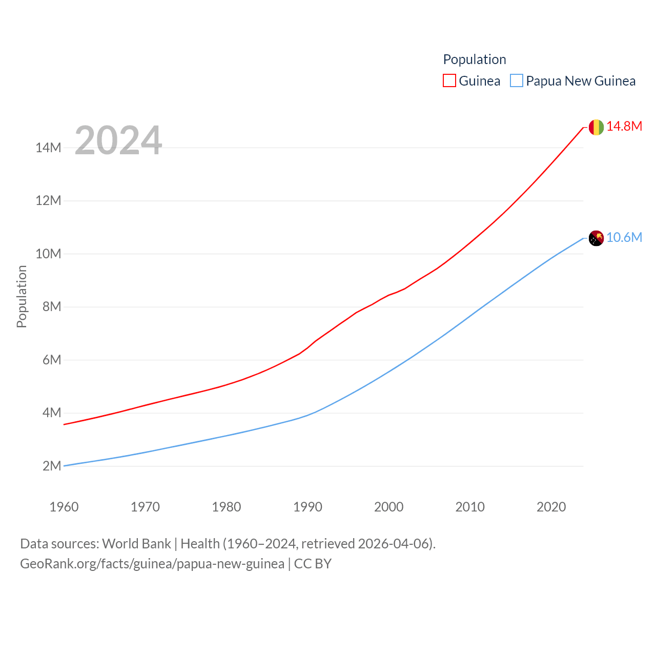 Guinea has a population of 14.8M (ranked 75/197), compared with 10.6M in Papua New Guinea (ranked 92/197). Guinea's land area is 94,873 sq mi versus 174,850 sq mi for Papua New Guinea (ranked 77th vs. 54th).