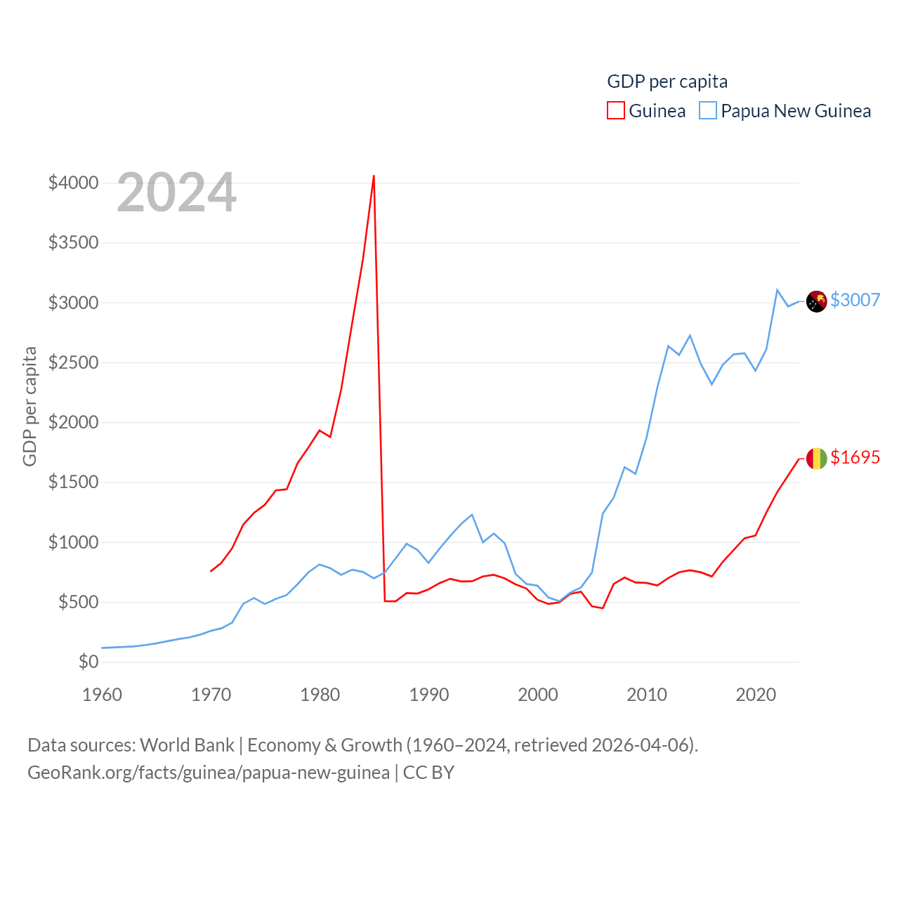 By GDP, Guinea ranks 118/197 ($25B) and Papua New Guinea ranks 110/197 ($31.8B). By GDP per capita, Guinea ranks 160/197 ($1,695), while Papua New Guinea ranks 140/197 ($3,007).