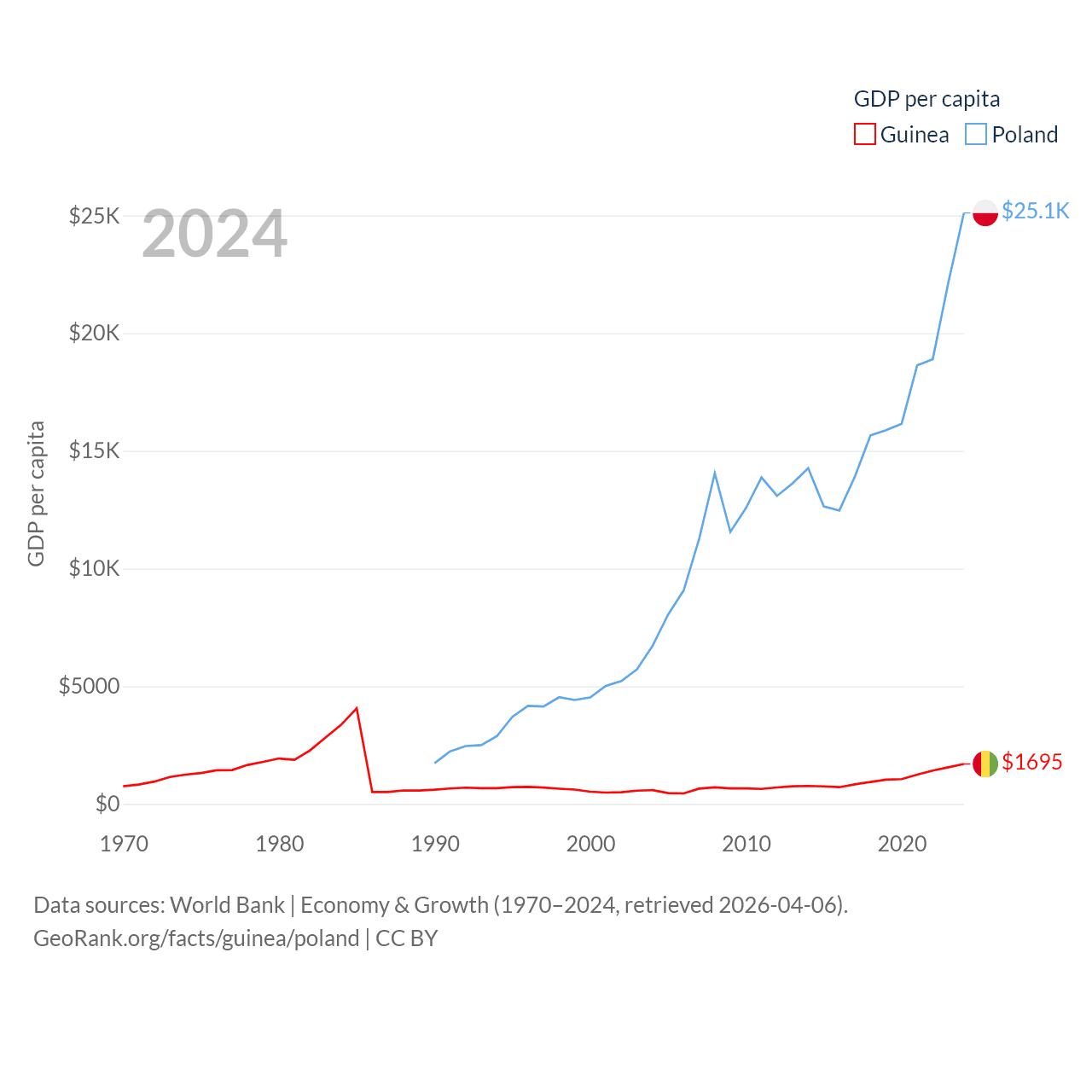 By GDP, Guinea ranks 118/197 ($25B) and Poland ranks 21/197 ($918B). By GDP per capita, Guinea ranks 160/197 ($1,695), while Poland ranks 48/197 ($25,104).