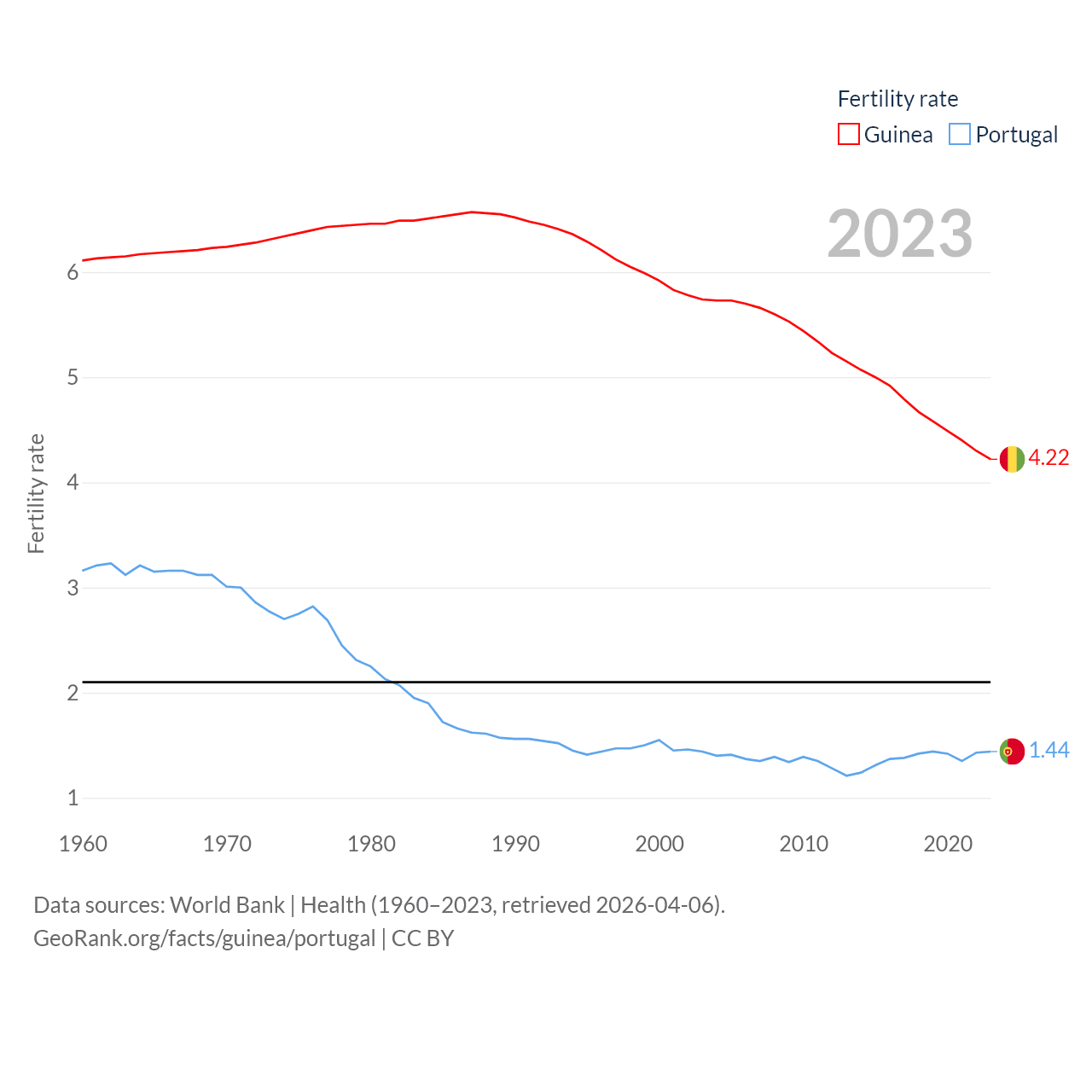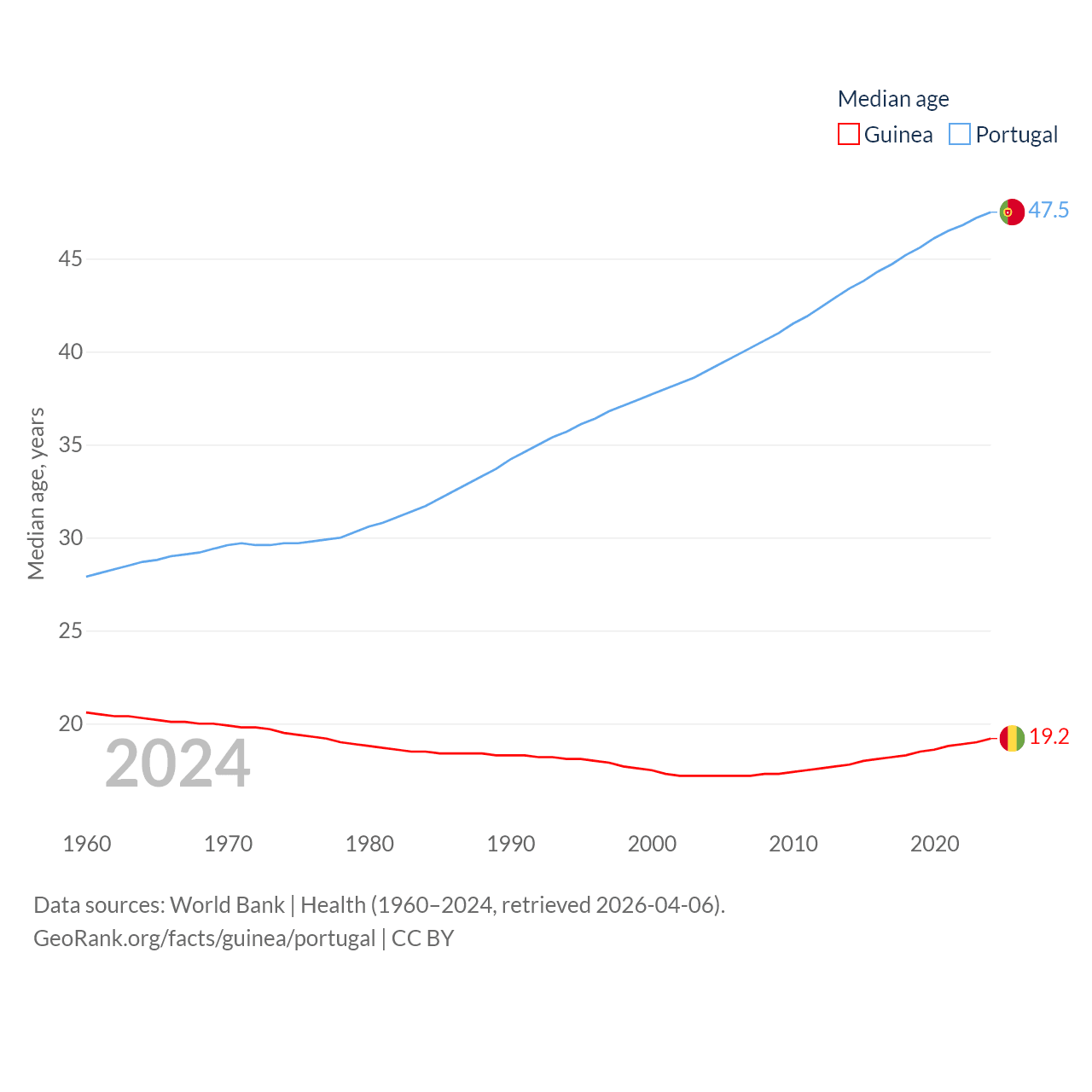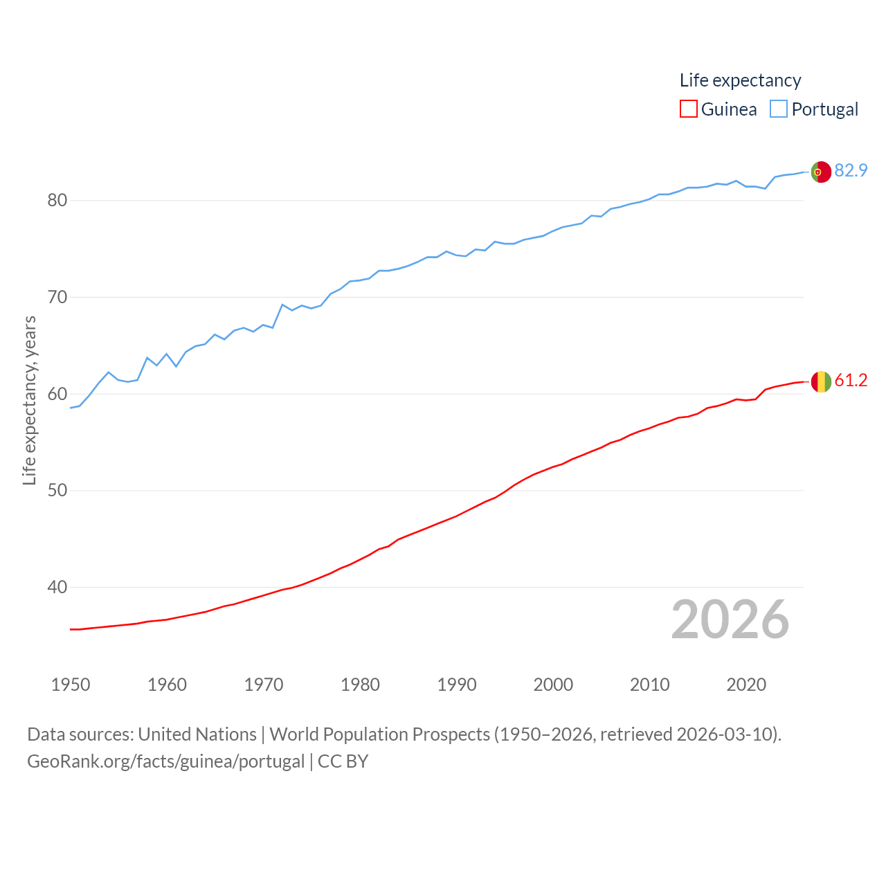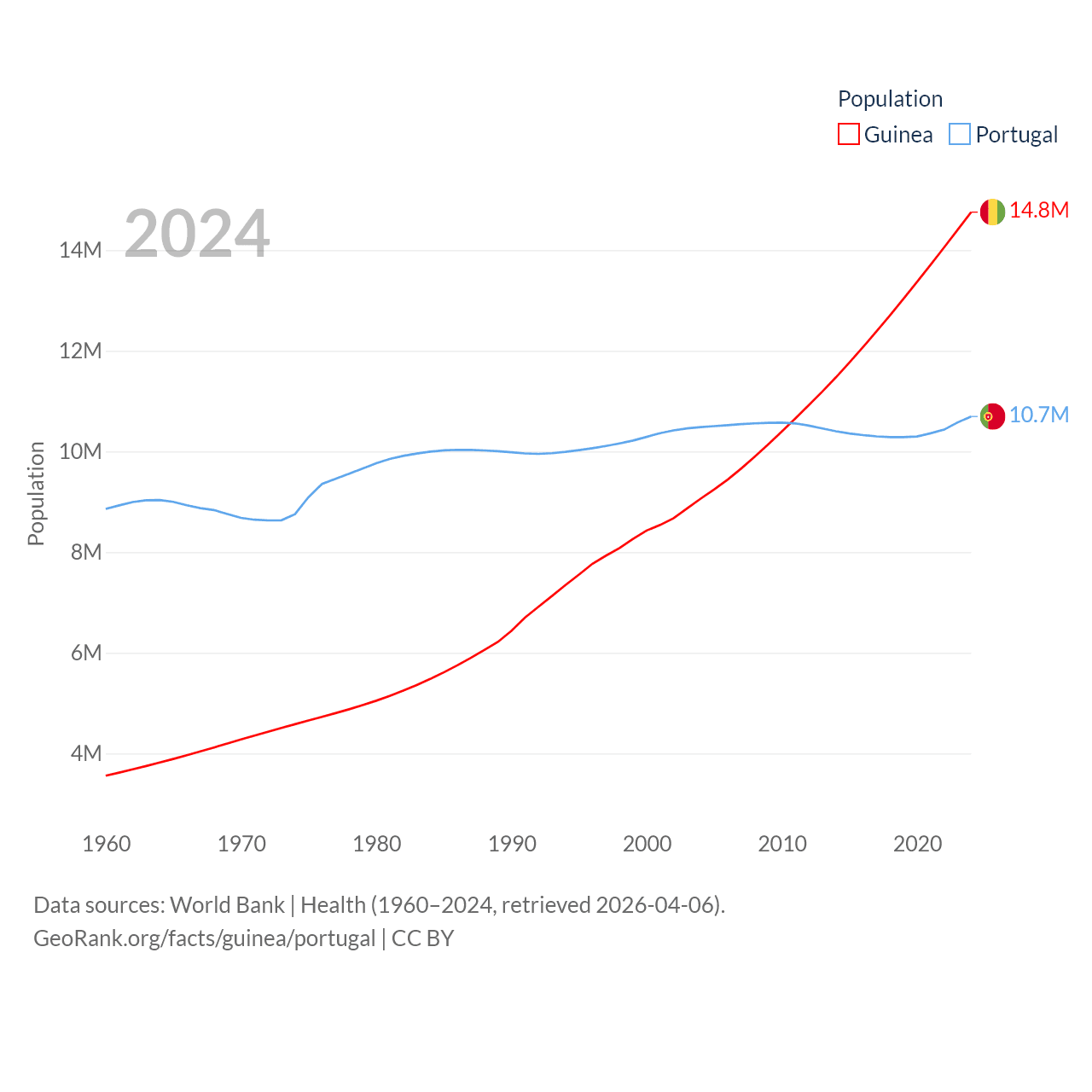 Guinea has a population of 14.8M (ranked 75/197), compared with 10.7M in Portugal (ranked 90/197). Guinea's land area is 94,873 sq mi versus 35,369 sq mi for Portugal (ranked 77th vs. 108th).