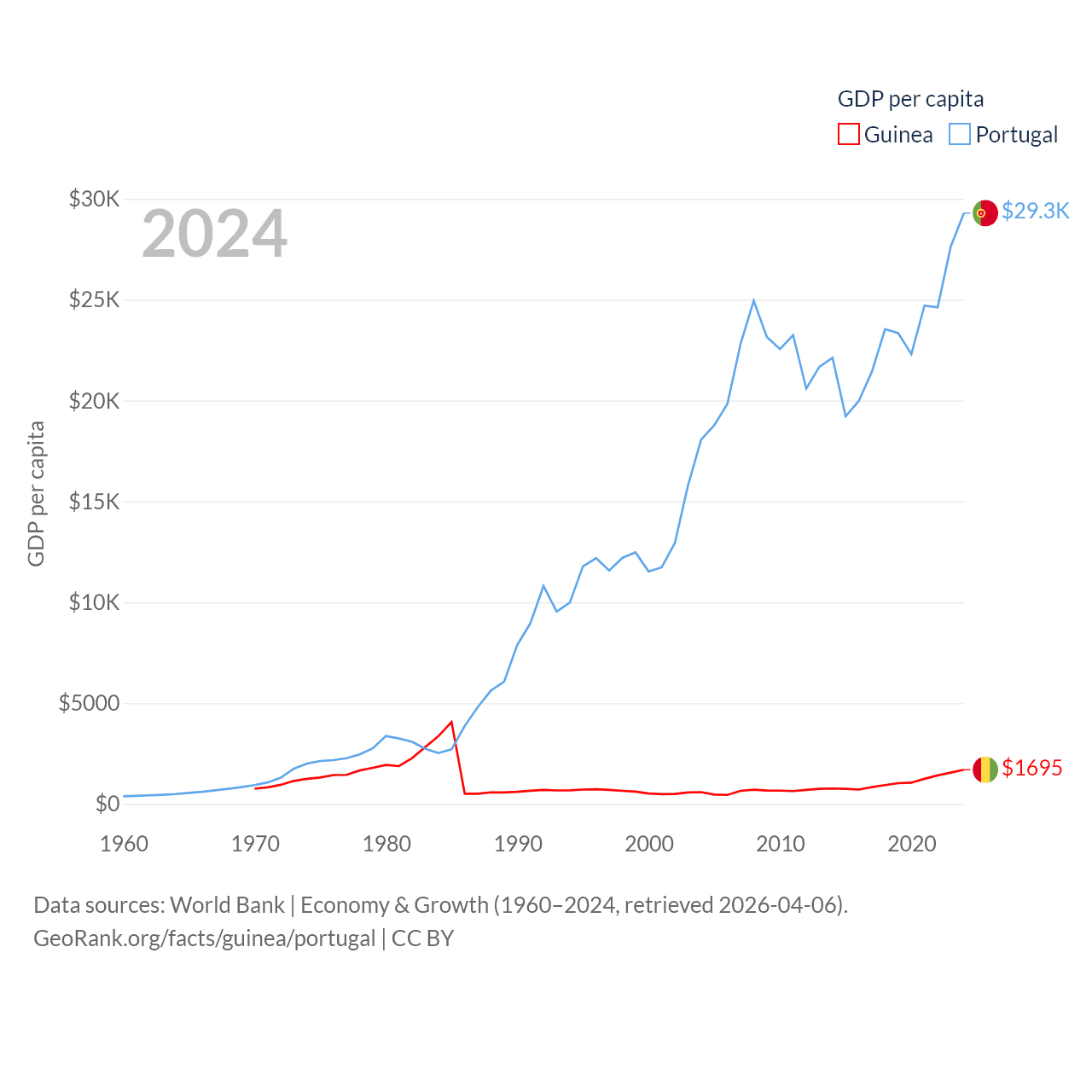 By GDP, Guinea ranks 118/197 ($25B) and Portugal ranks 46/197 ($313B). By GDP per capita, Guinea ranks 160/197 ($1,695), while Portugal ranks 44/197 ($29,292).