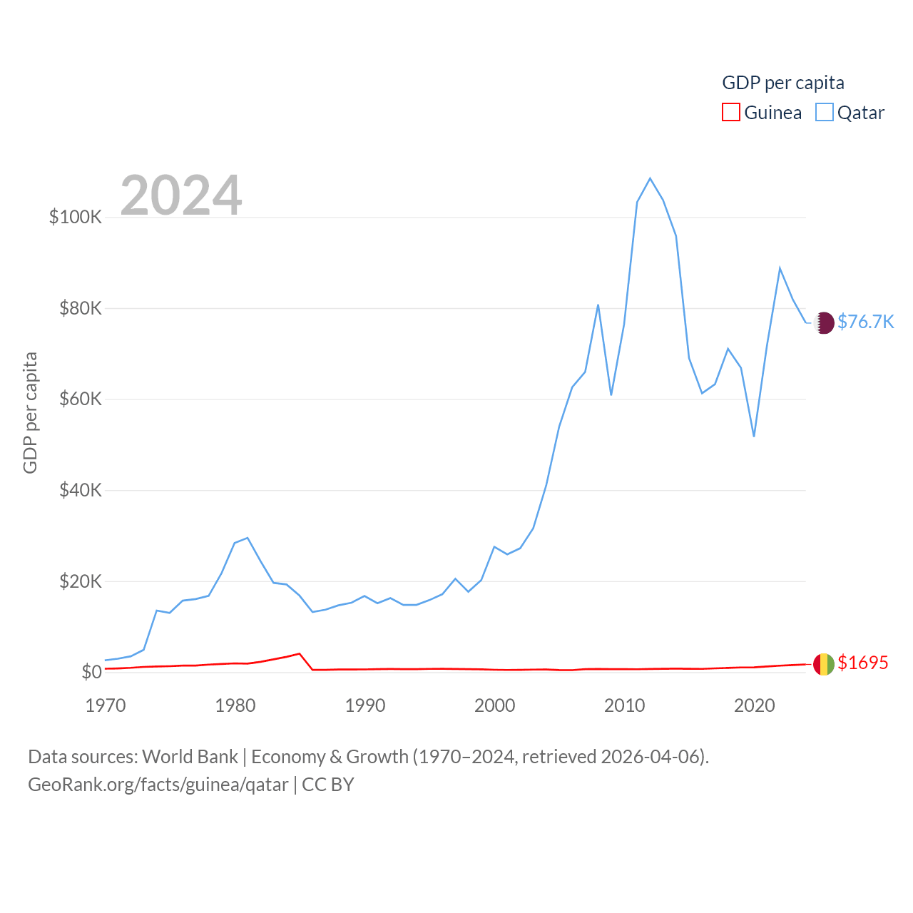 By GDP, Guinea ranks 118/197 ($25B) and Qatar ranks 56/197 ($219B). By GDP per capita, Guinea ranks 160/197 ($1,695), while Qatar ranks 11/197 ($76,689).