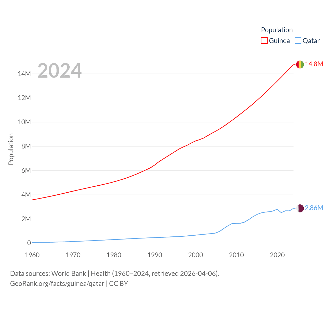 Guinea has a population of 14.8M (ranked 75/197), compared with 2.86M in Qatar (ranked 138/197). Guinea's land area is 94,873 sq mi versus 4,436 sq mi for Qatar (ranked 77th vs. 158th).