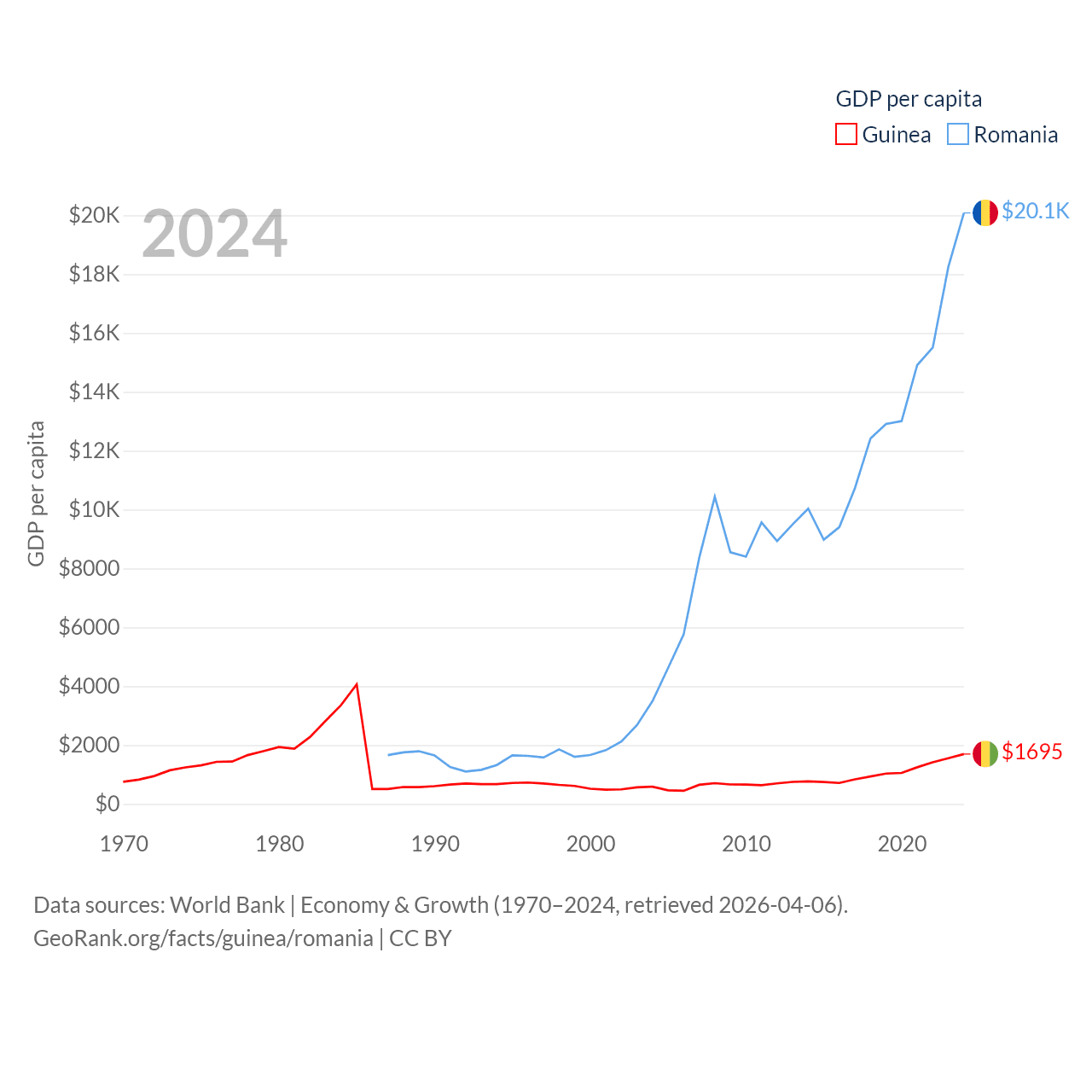 By GDP, Guinea ranks 118/197 ($25B) and Romania ranks 42/197 ($383B). By GDP per capita, Guinea ranks 160/197 ($1,695), while Romania ranks 58/197 ($20,080).
