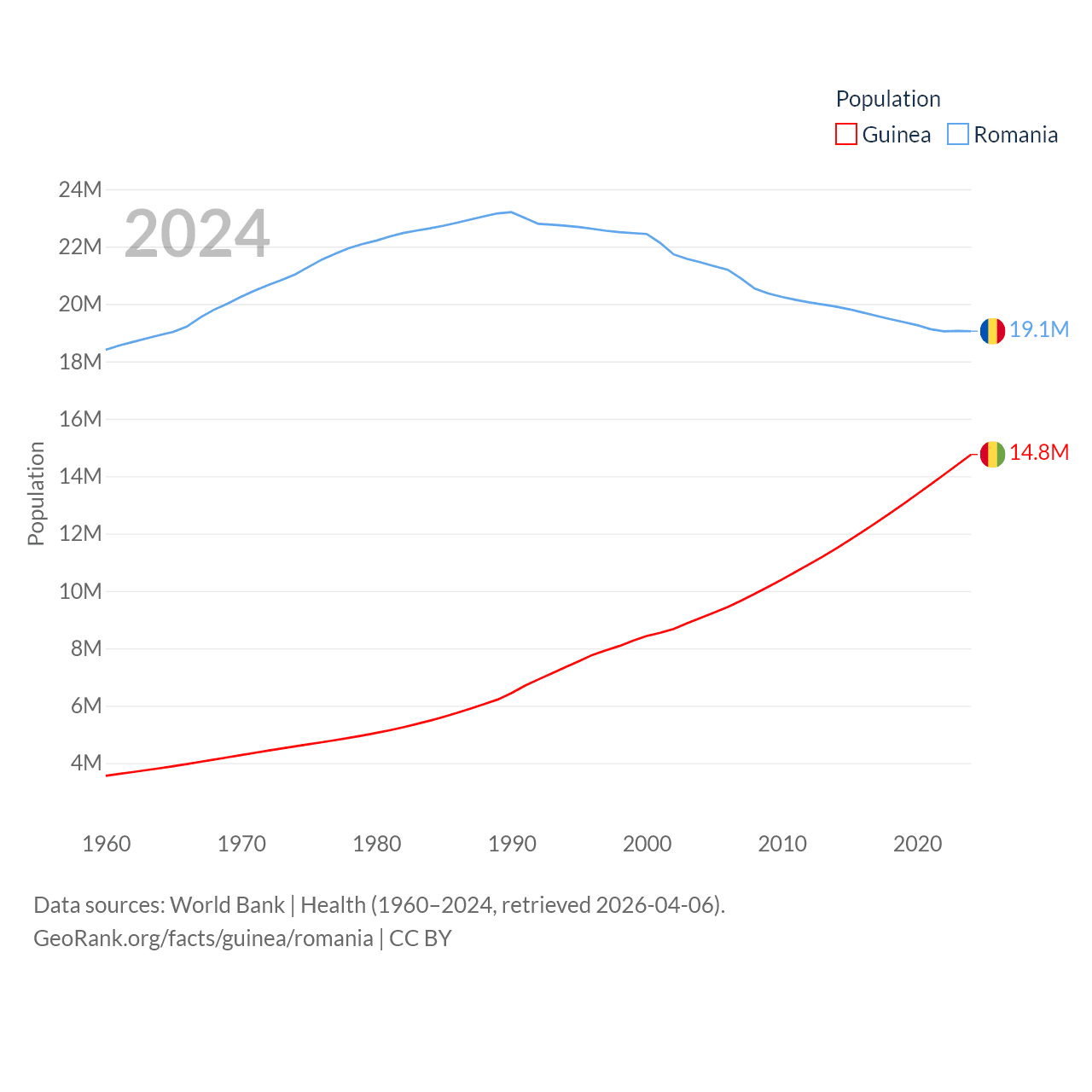 Guinea has a population of 14.8M (ranked 75/197), compared with 19.1M in Romania (ranked 67/197). Guinea's land area is 94,873 sq mi versus 88,834 sq mi for Romania (ranked 77th vs. 80th).