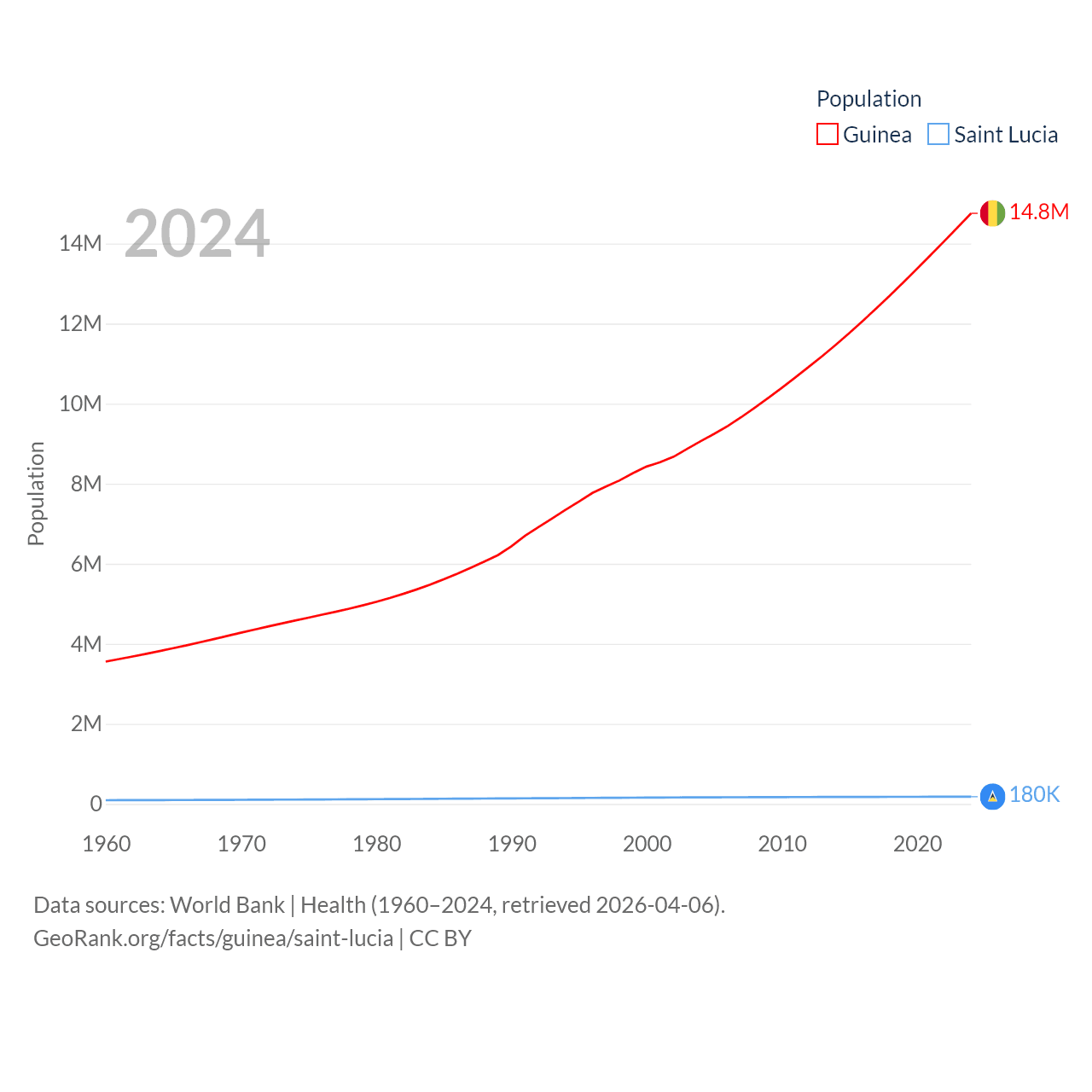 Guinea has a population of 14.8M (ranked 75/197), compared with 180K in Saint Lucia (ranked 178/197). Guinea's land area is 94,873 sq mi versus 235.5 sq mi for Saint Lucia (ranked 77th vs. 178th).