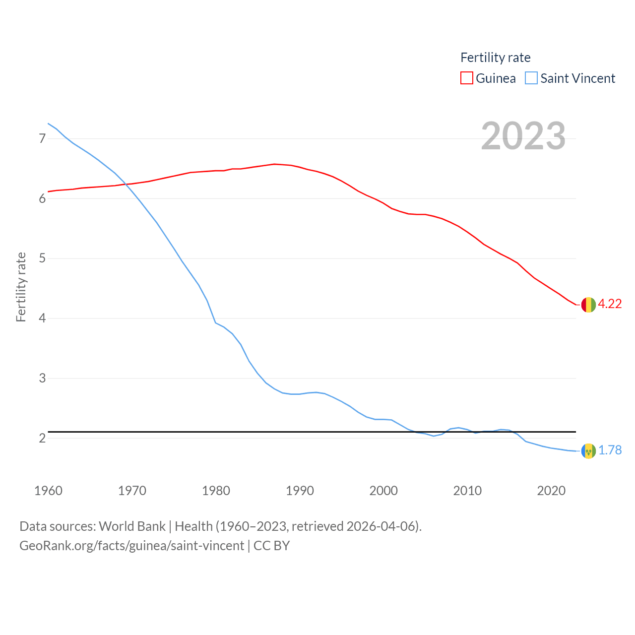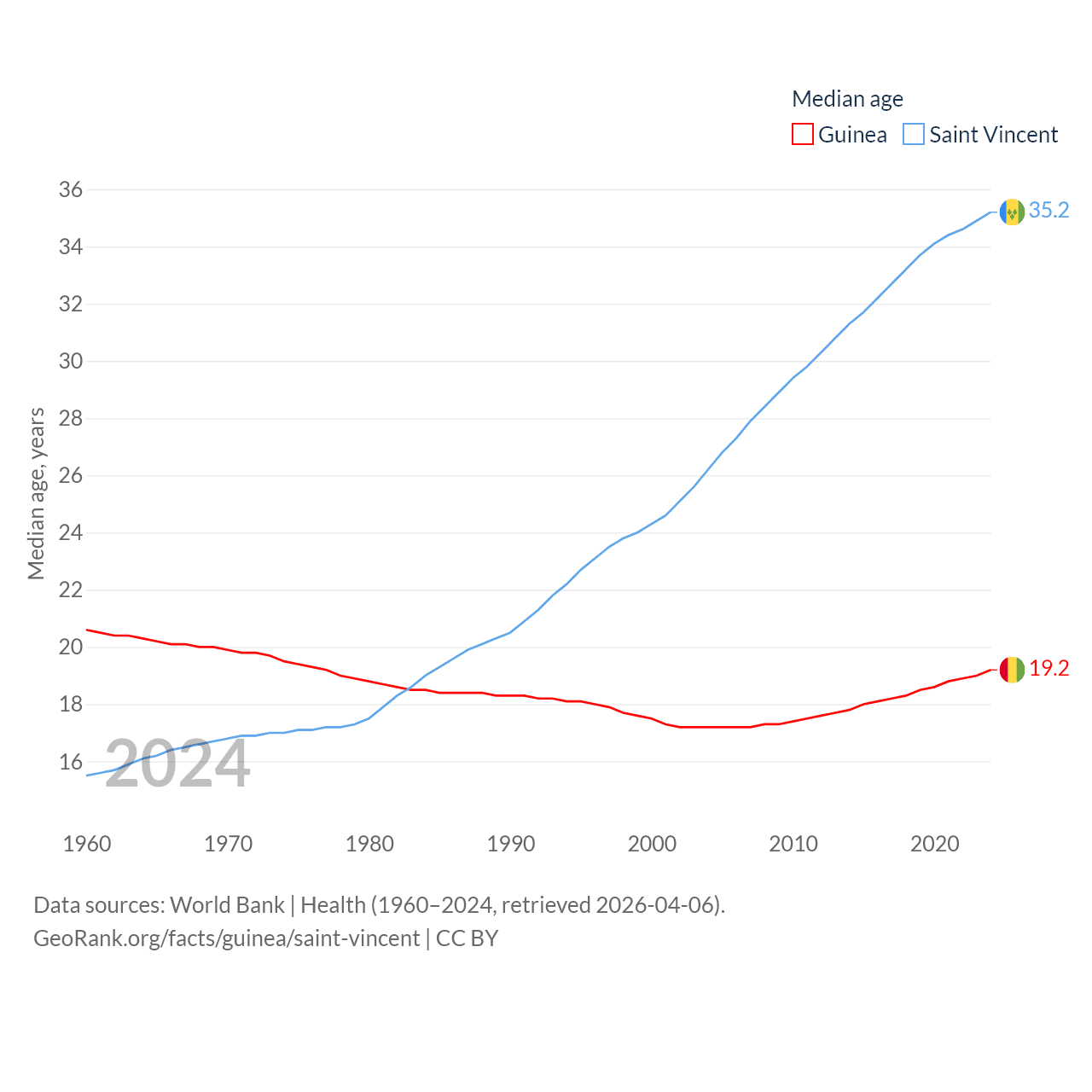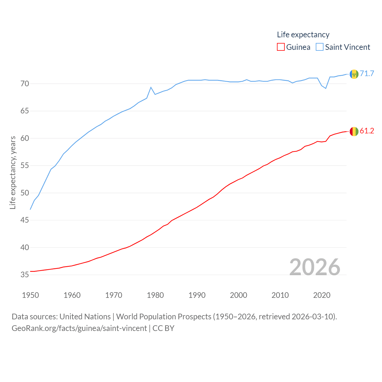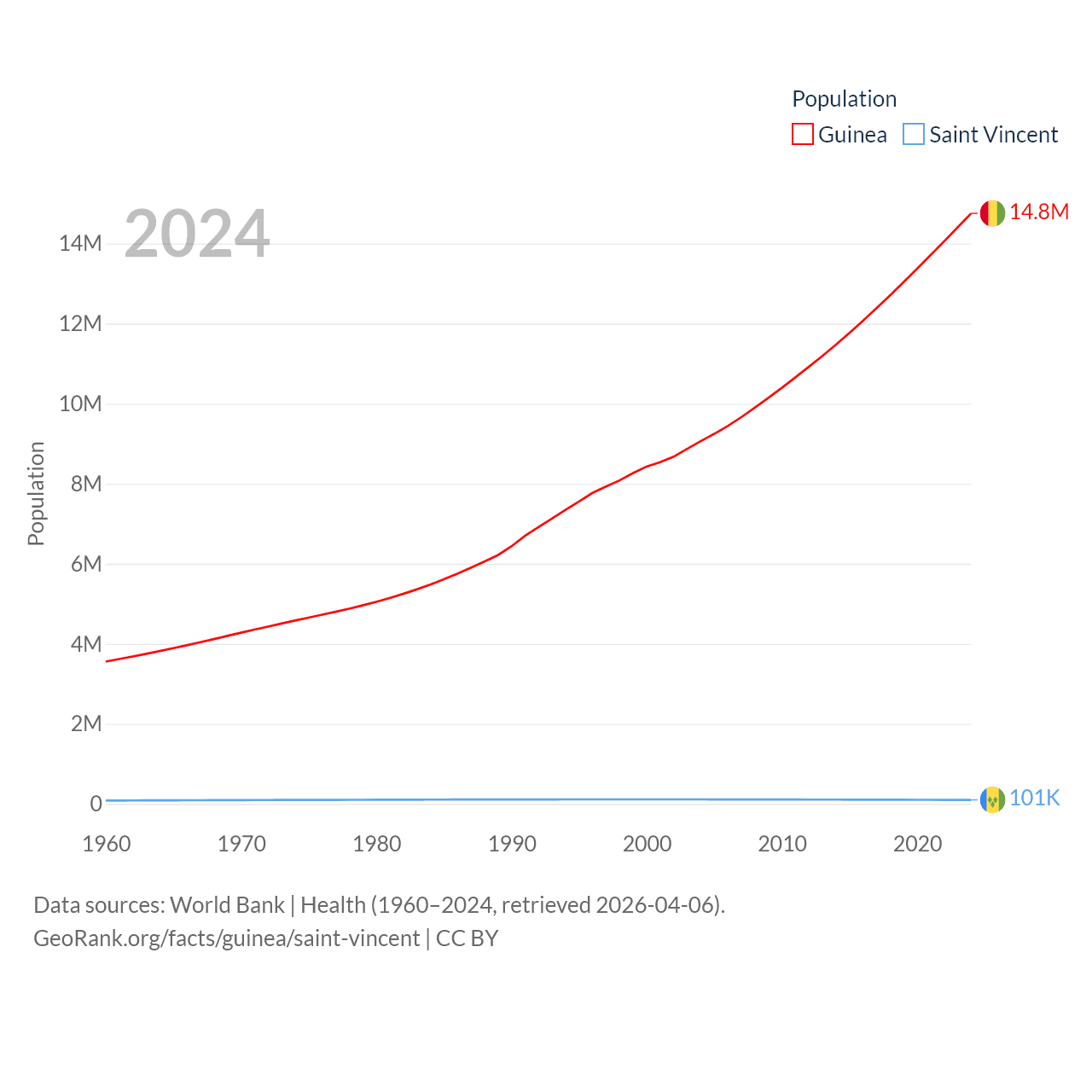 Guinea has a population of 14.8M (ranked 75/197), compared with 101K in Saint Vincent (ranked 184/197). Guinea's land area is 94,873 sq mi versus 150.6 sq mi for Saint Vincent (ranked 77th vs. 185th).