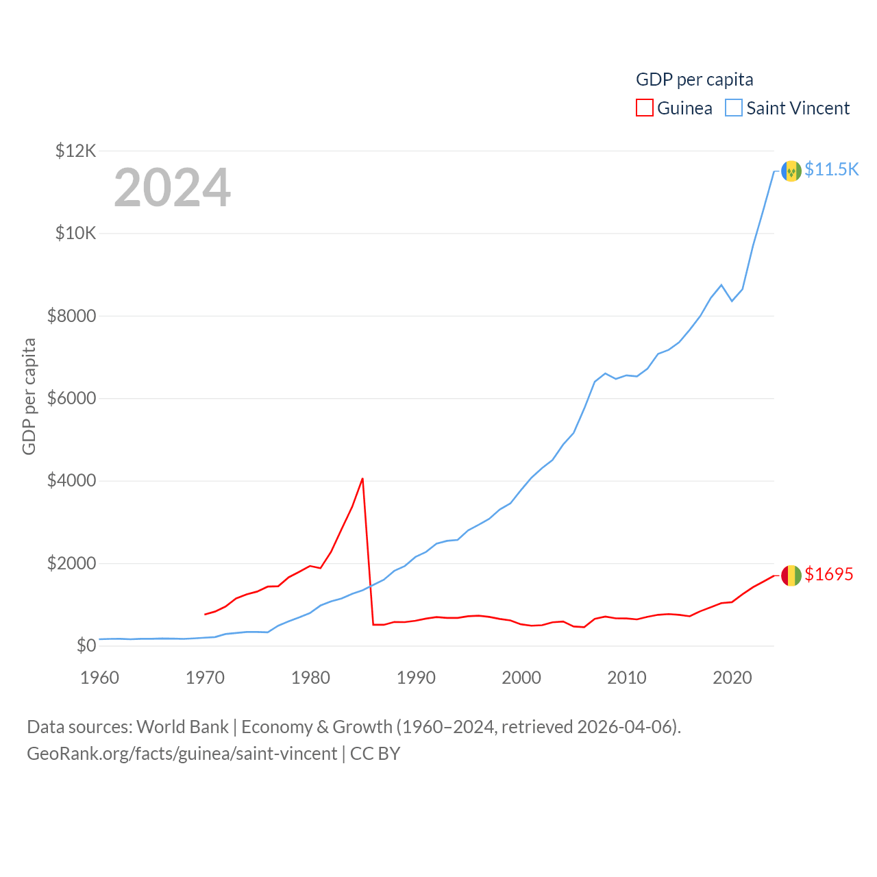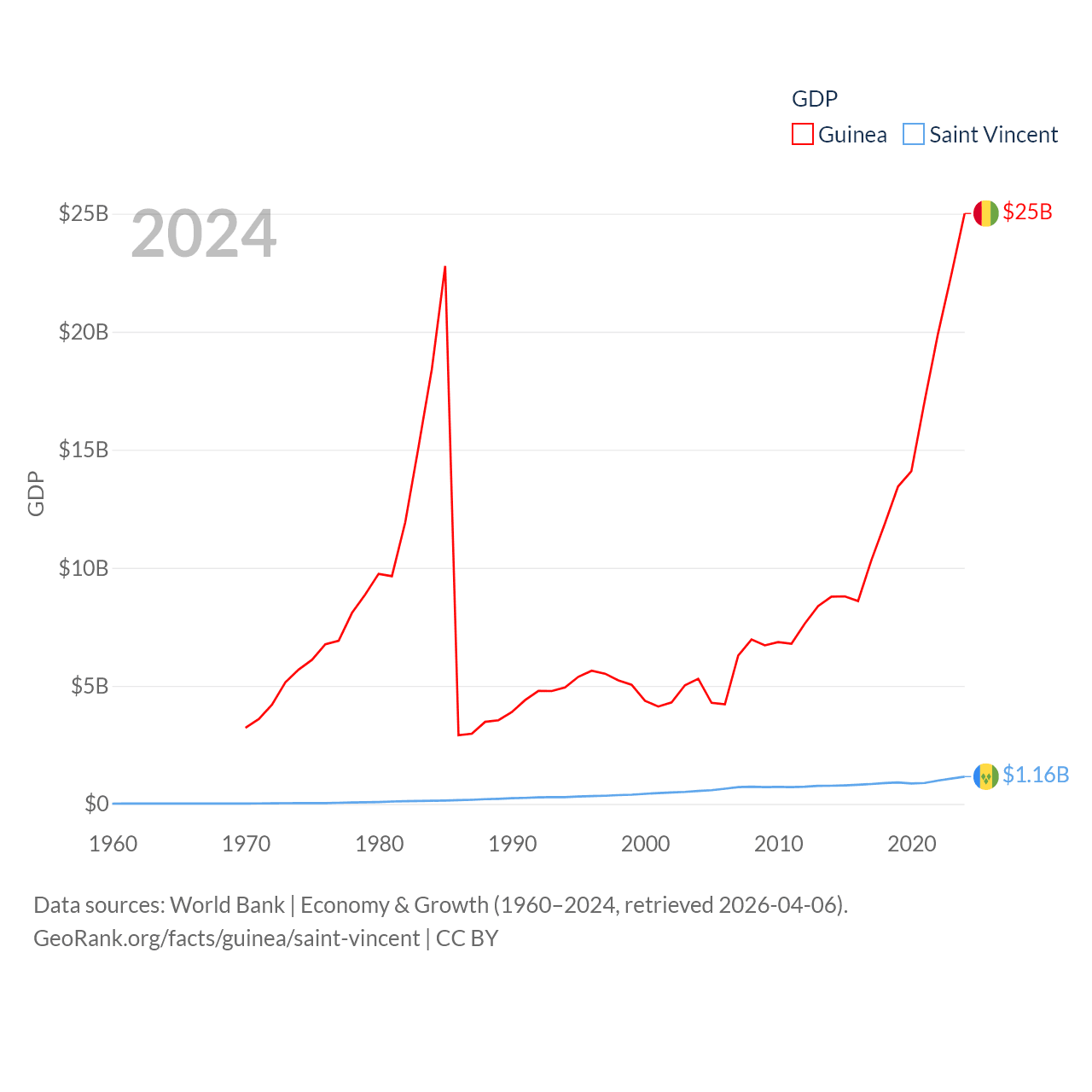 By GDP, Guinea ranks 118/197 ($25B) and Saint Vincent ranks 186/197 ($1.16B). By GDP per capita, Guinea ranks 160/197 ($1,695), while Saint Vincent ranks 81/197 ($11,501).