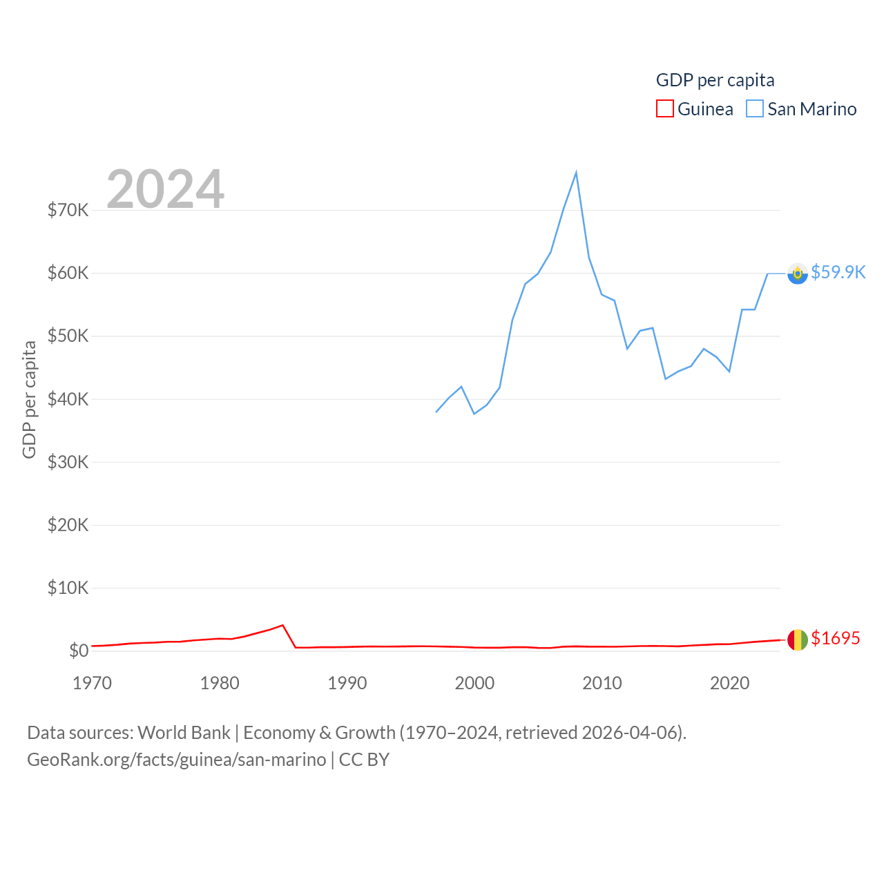 By GDP, Guinea ranks 118/197 ($25B) and San Marino ranks 180/197 ($2.03B). By GDP per capita, Guinea ranks 160/197 ($1,695), while San Marino ranks 15/197 ($59,880).