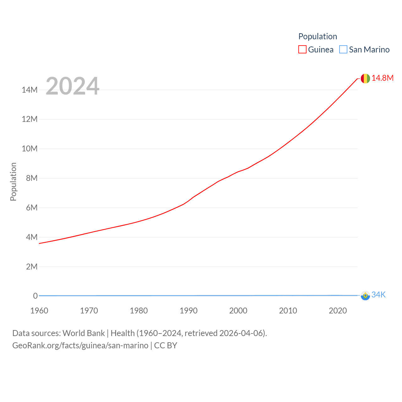 Guinea has a population of 14.8M (ranked 75/197), compared with 34K in San Marino (ranked 193/197). Guinea's land area is 94,873 sq mi versus 23.2 sq mi for San Marino (ranked 77th vs. 193rd).