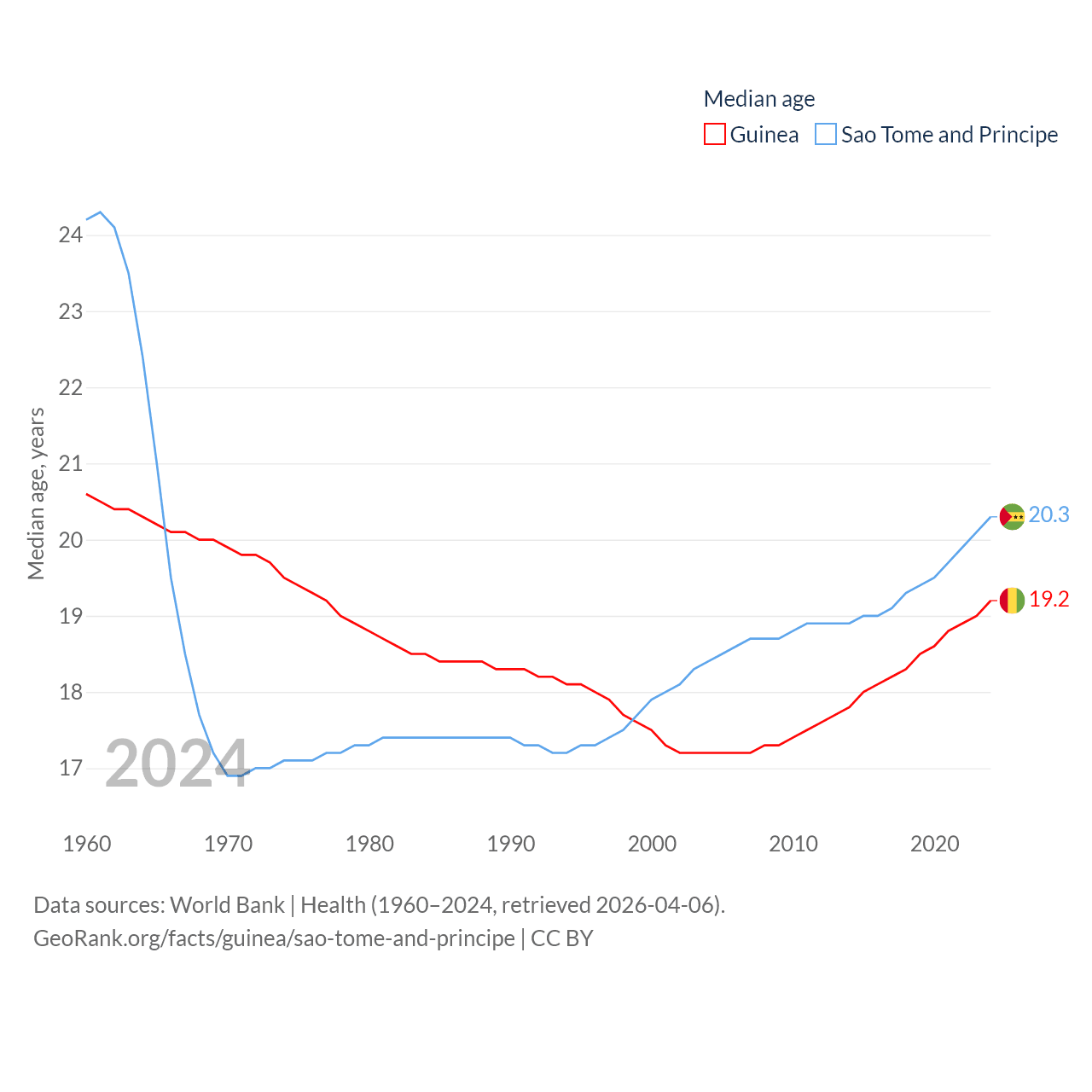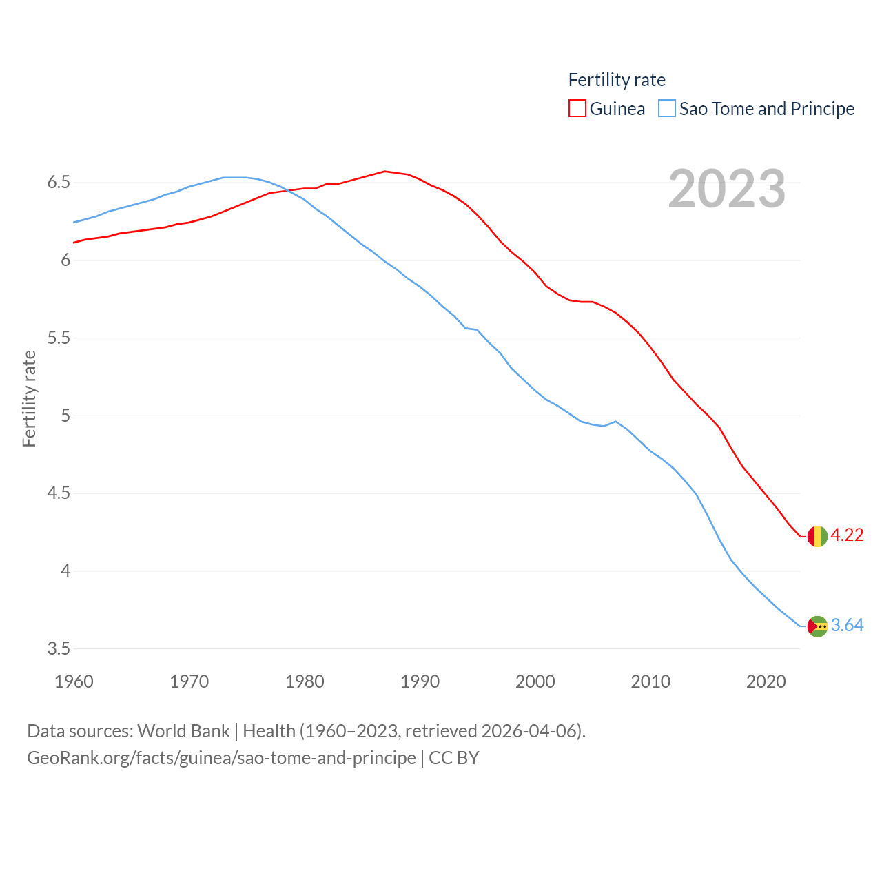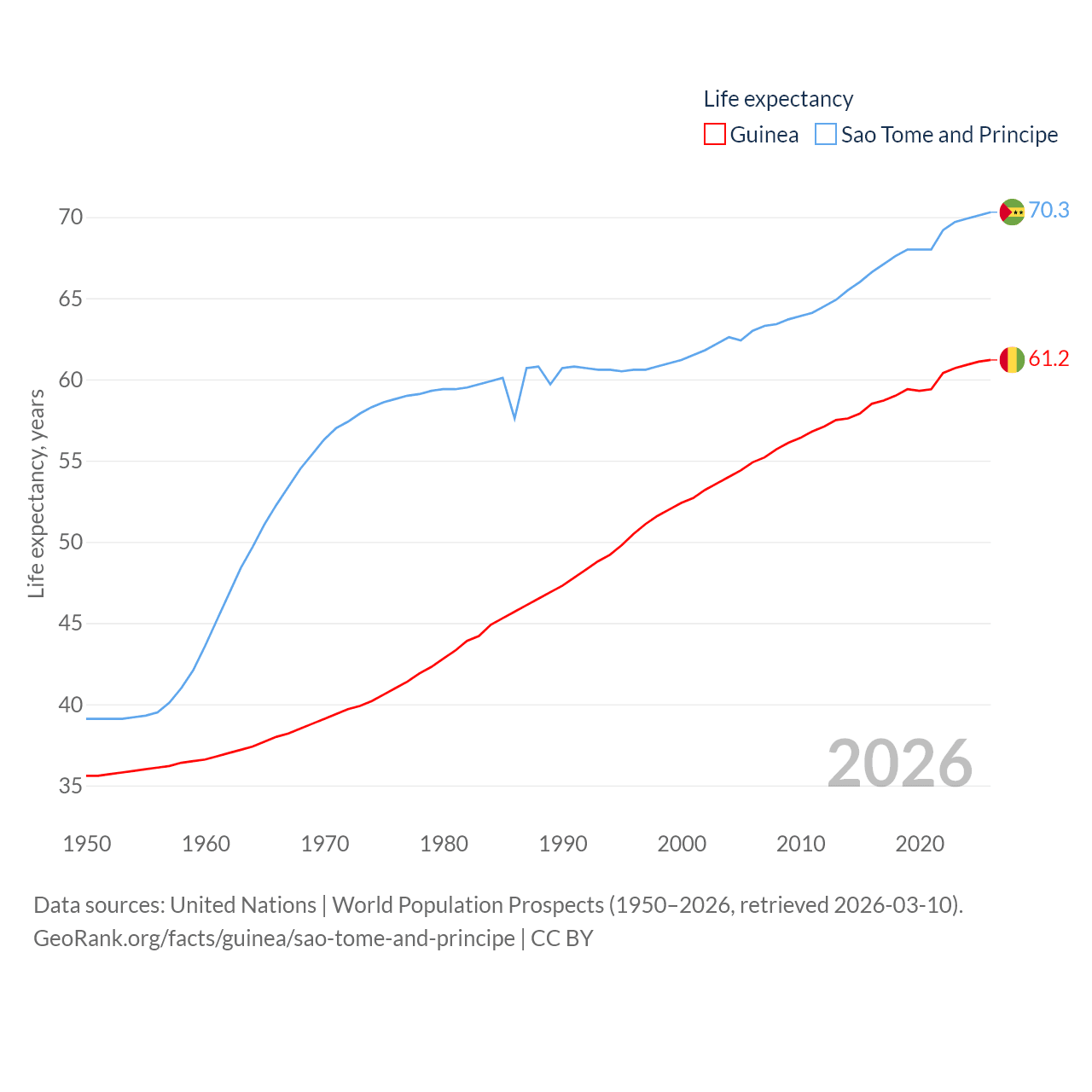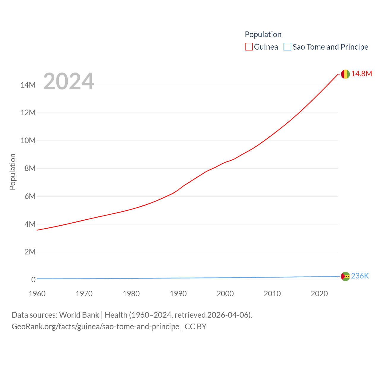 Guinea has a population of 14.8M (ranked 75/197), compared with 236K in Sao Tome and Principe (ranked 176/197). Guinea's land area is 94,873 sq mi versus 371 sq mi for Sao Tome and Principe (ranked 77th vs. 172nd).