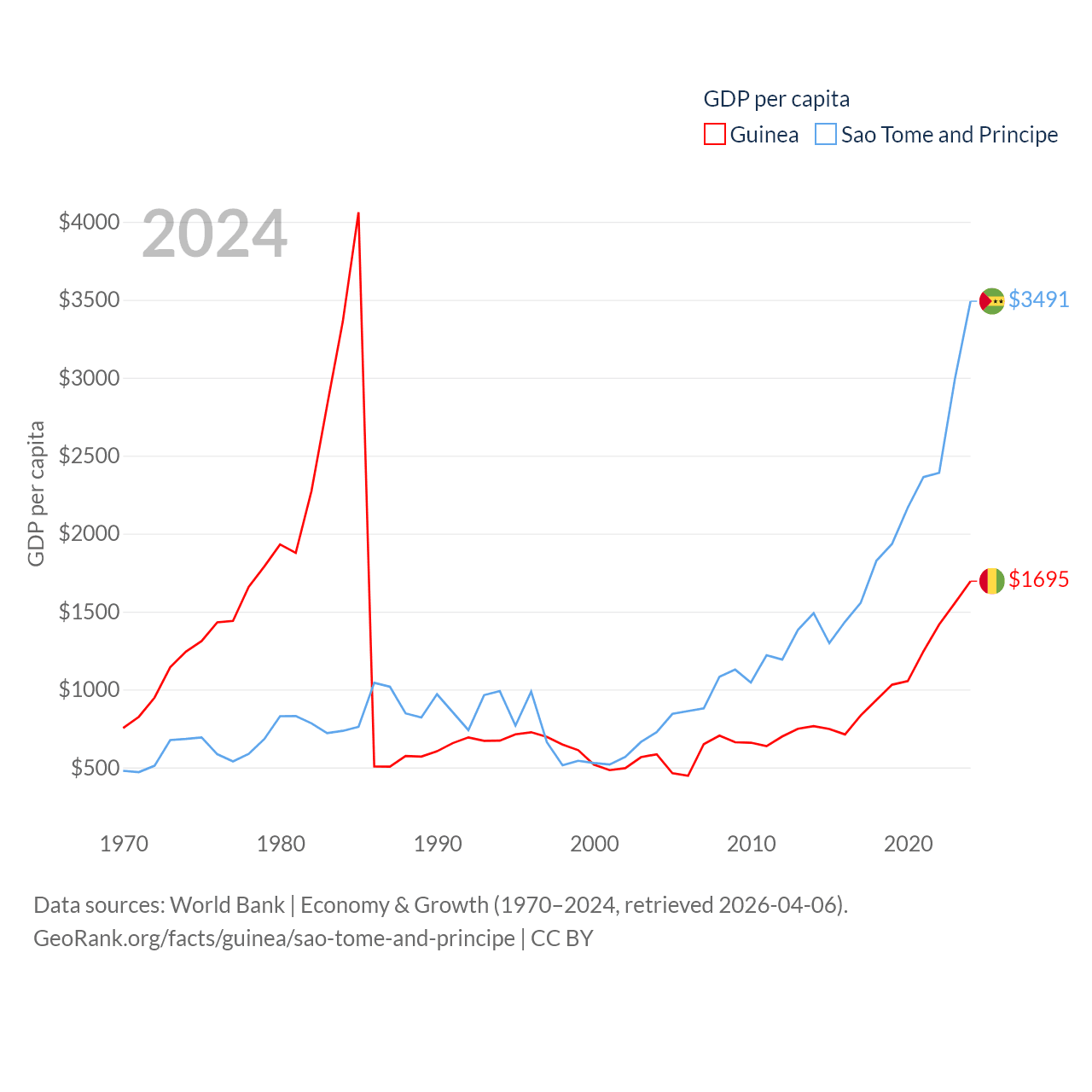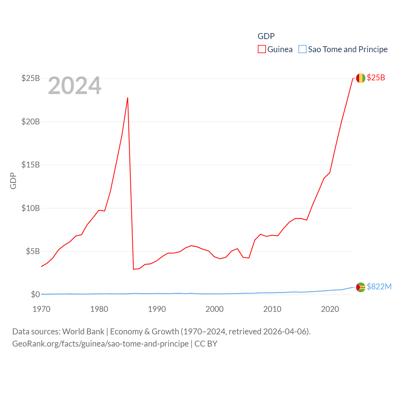 By GDP, Guinea ranks 118/197 ($25B) and Sao Tome and Principe ranks 189/197 ($822M). By GDP per capita, Guinea ranks 160/197 ($1,695), while Sao Tome and Principe ranks 134/197 ($3,491).