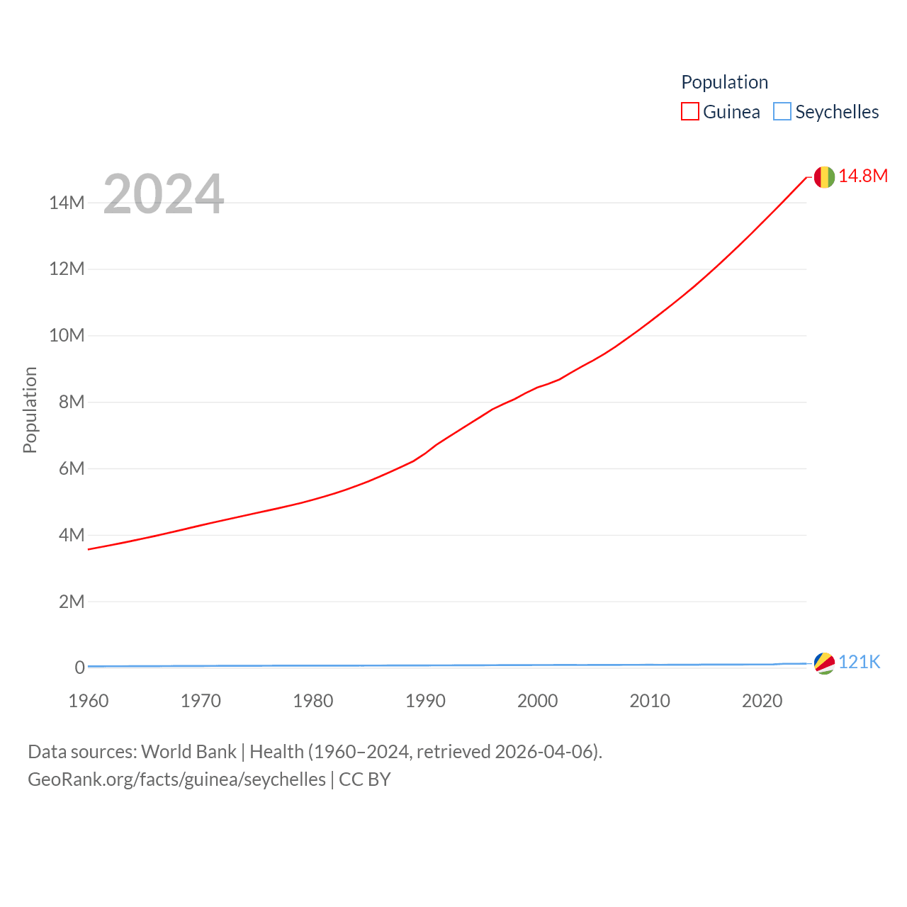 Guinea has a population of 14.8M (ranked 75/197), compared with 121K in The Seychelles (ranked 181/197). Guinea's land area is 94,873 sq mi versus 177.6 sq mi for The Seychelles (ranked 77th vs. 181st).