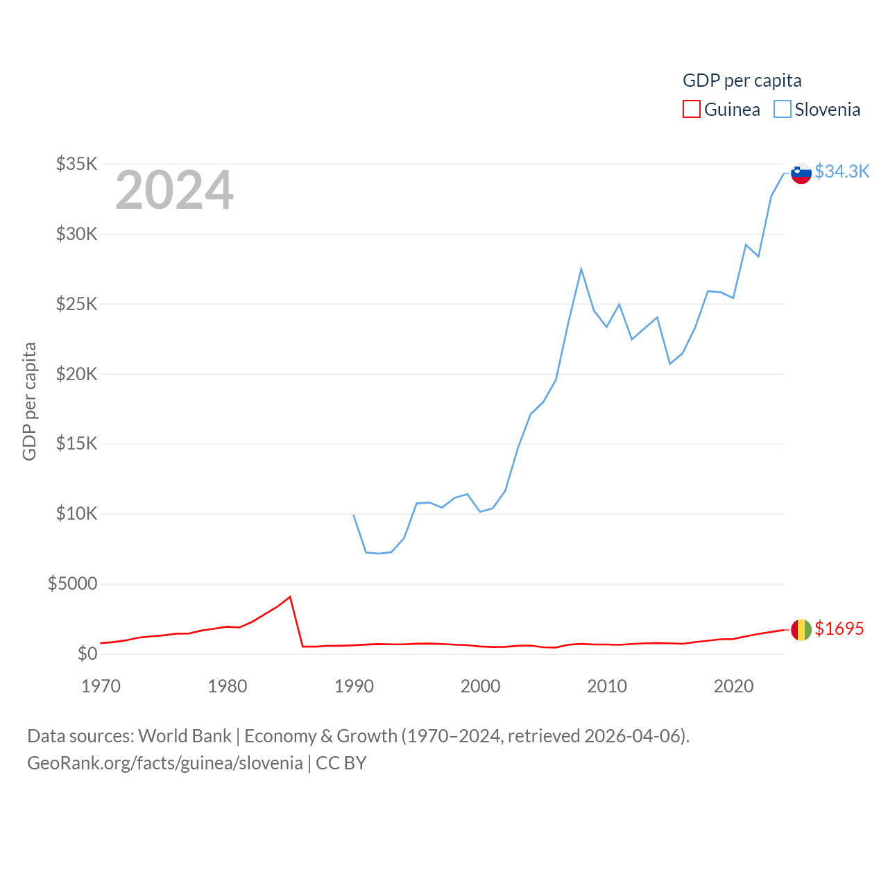 By GDP, Guinea ranks 118/197 ($25B) and Slovenia ranks 86/197 ($73B). By GDP per capita, Guinea ranks 160/197 ($1,695), while Slovenia ranks 34/197 ($34,301).