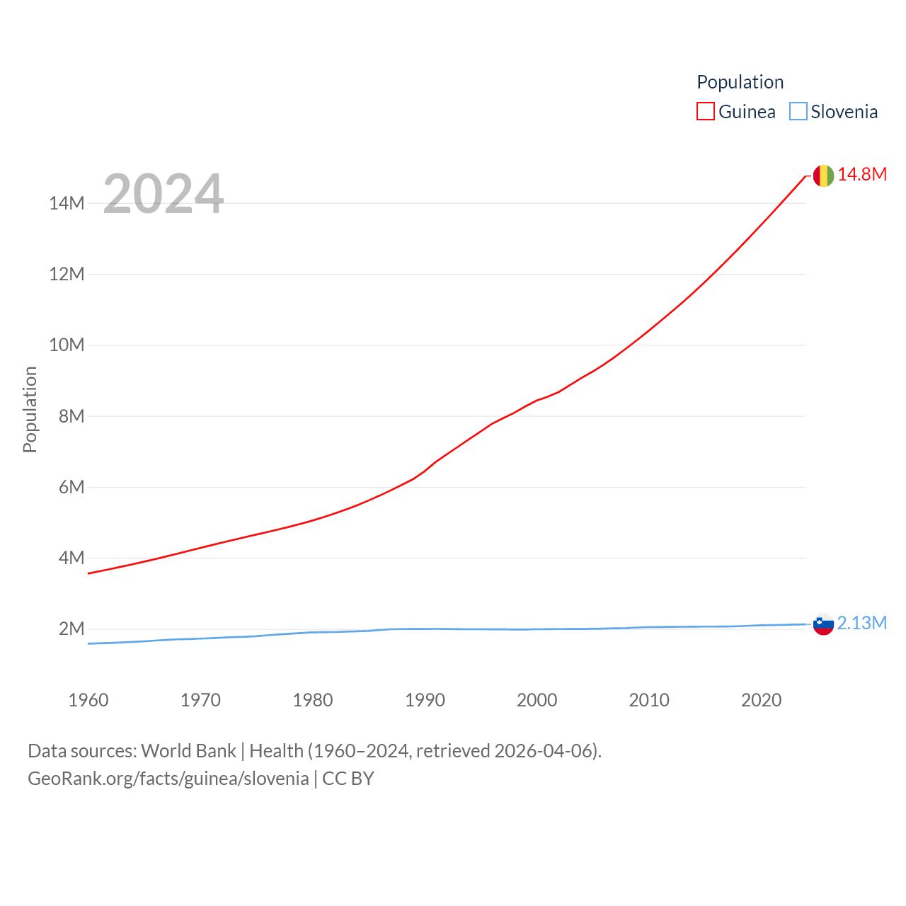 Guinea has a population of 14.8M (ranked 75/197), compared with 2.13M in Slovenia (ranked 147/197). Guinea's land area is 94,873 sq mi versus 7,774 sq mi for Slovenia (ranked 77th vs. 151st).