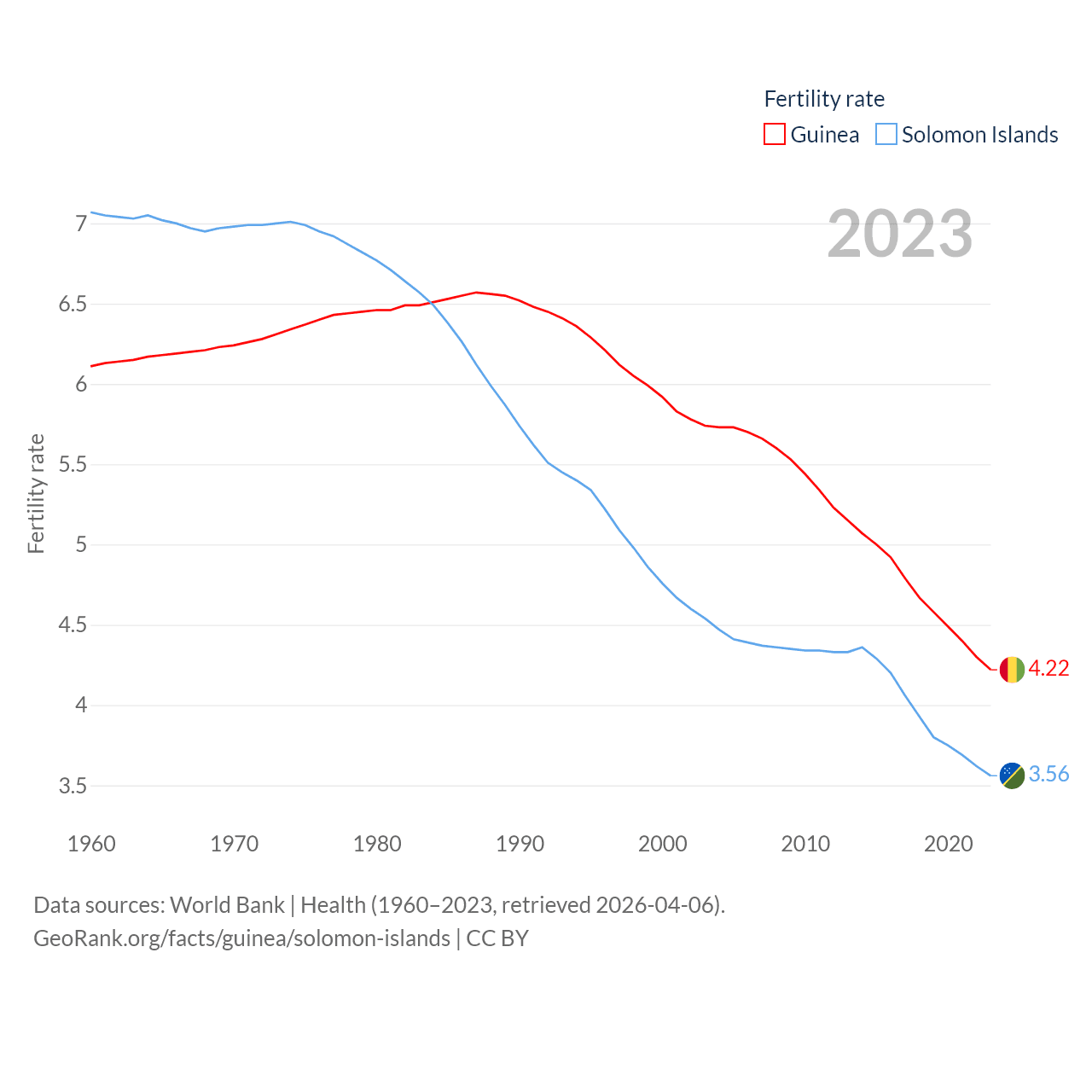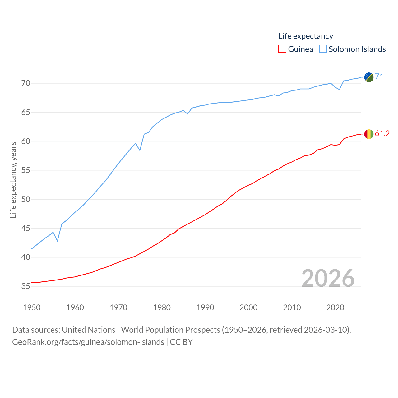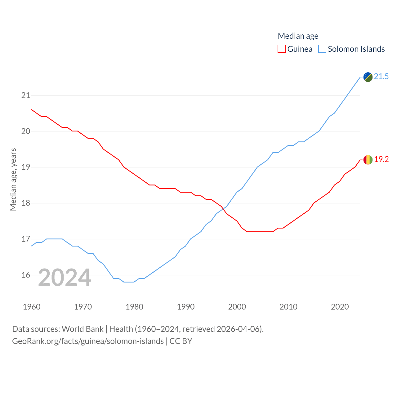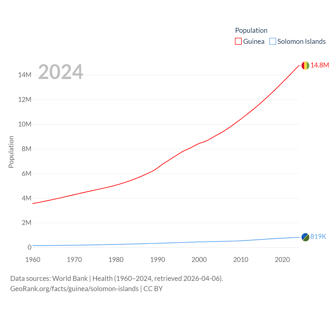 Guinea has a population of 14.8M (ranked 75/197), compared with 819K in The Solomon Islands (ranked 162/197). Guinea's land area is 94,873 sq mi versus 10,807 sq mi for The Solomon Islands (ranked 77th vs. 141st).