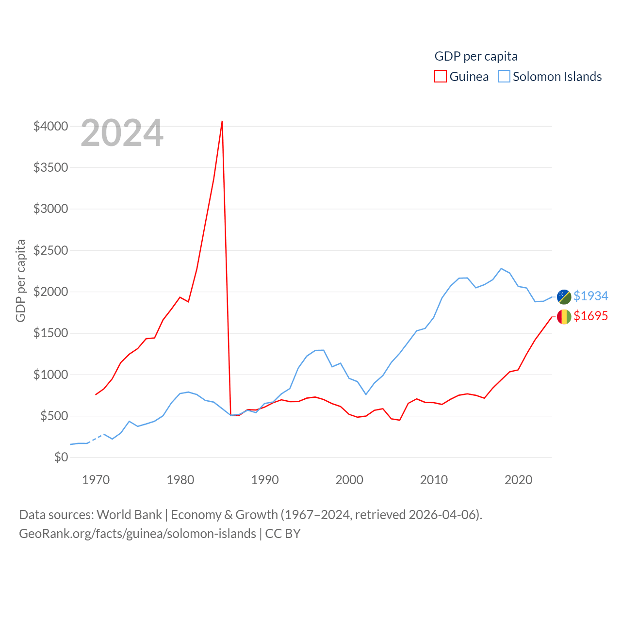 By GDP, Guinea ranks 118/197 ($25B) and The Solomon Islands ranks 182/197 ($1.58B). By GDP per capita, Guinea ranks 160/197 ($1,695), while The Solomon Islands ranks 157/197 ($1,934).