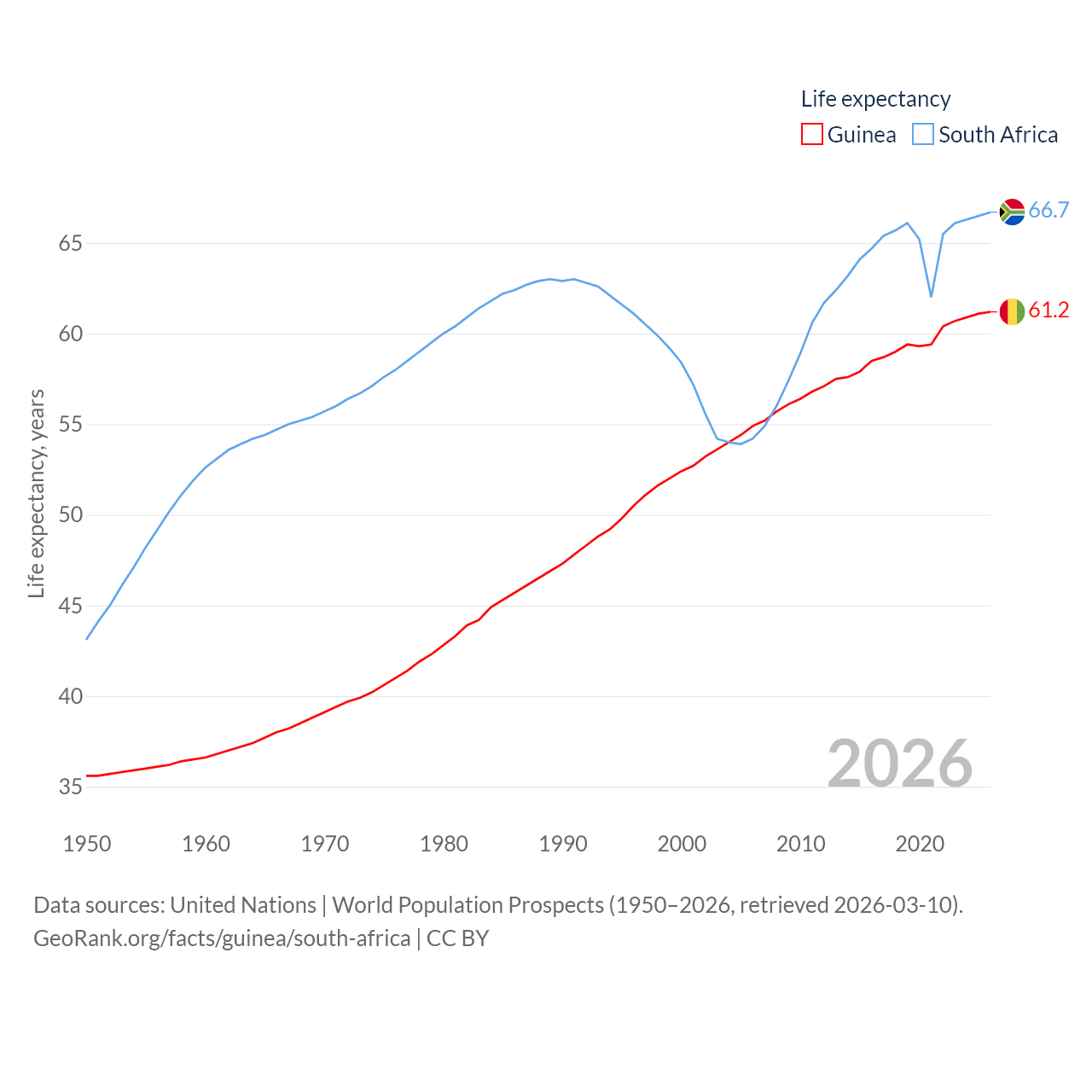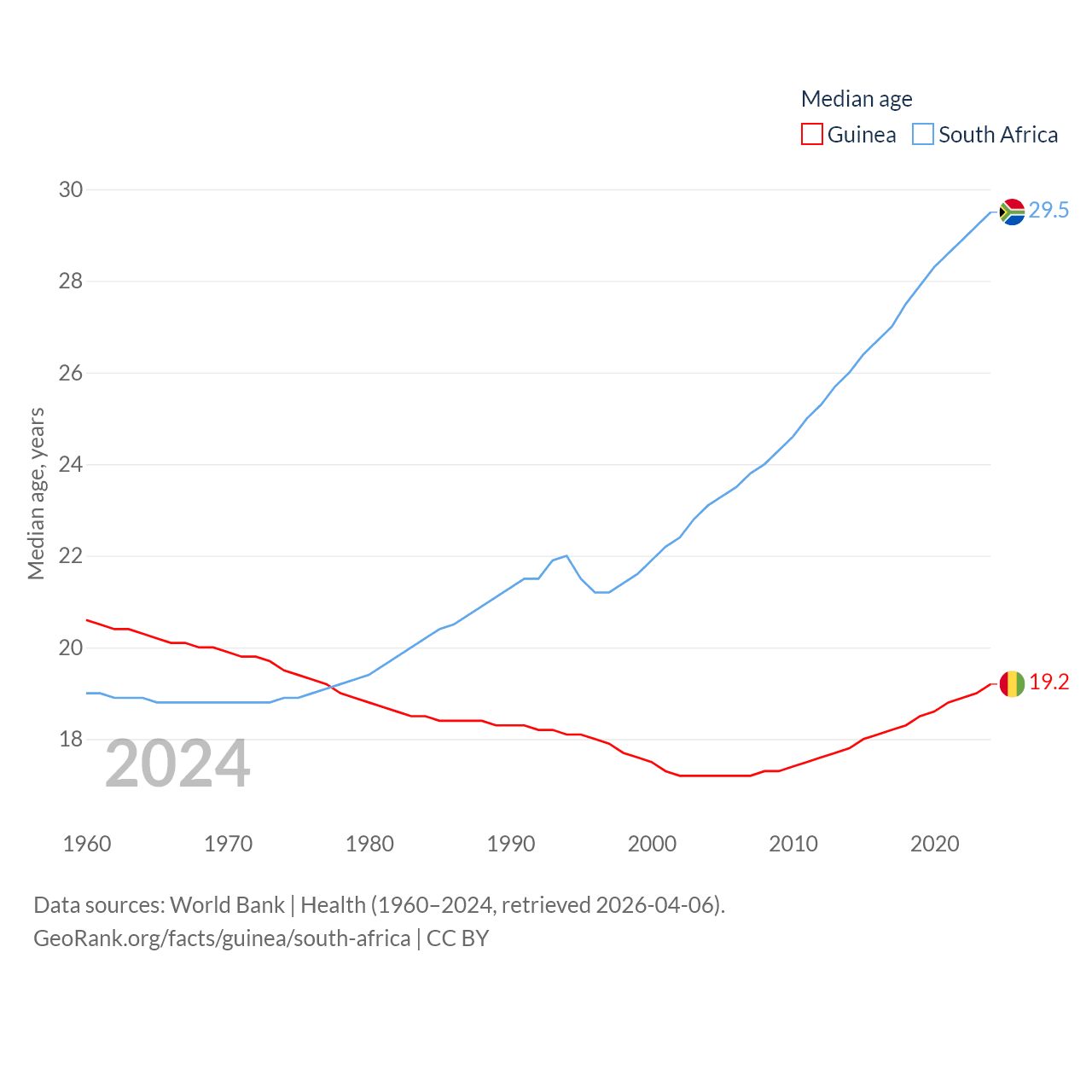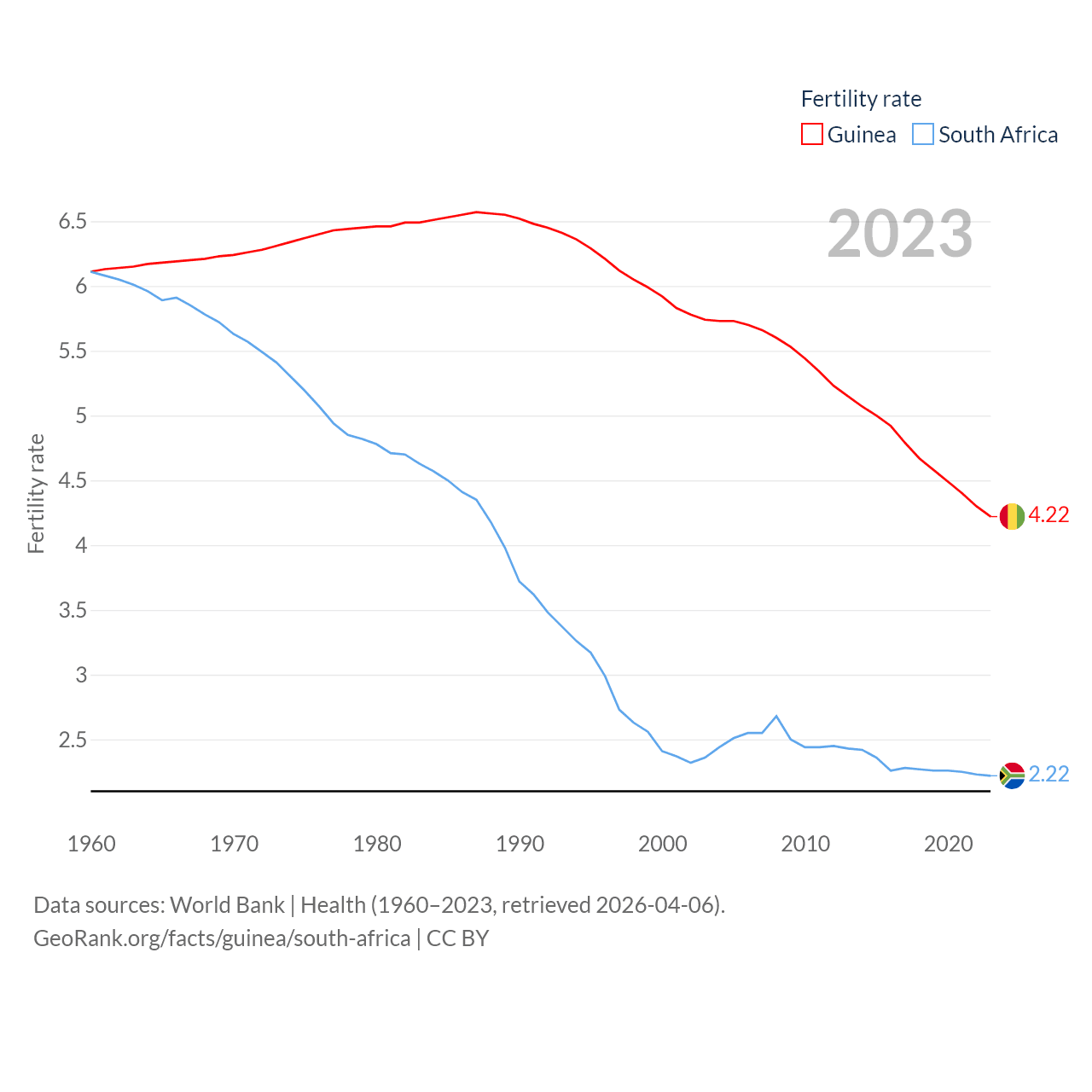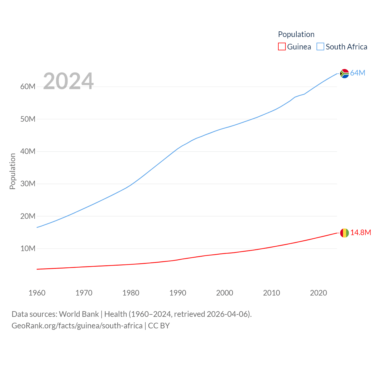 Guinea has a population of 14.8M (ranked 75/197), compared with 64M in South Africa (ranked 24/197). Guinea's land area is 94,873 sq mi versus 468,377 sq mi for South Africa (ranked 77th vs. 24th).