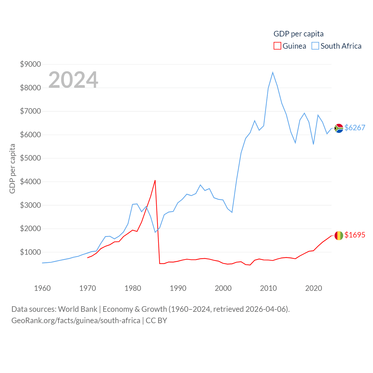 By GDP, Guinea ranks 118/197 ($25B) and South Africa ranks 40/197 ($401B). By GDP per capita, Guinea ranks 160/197 ($1,695), while South Africa ranks 111/197 ($6,267).
