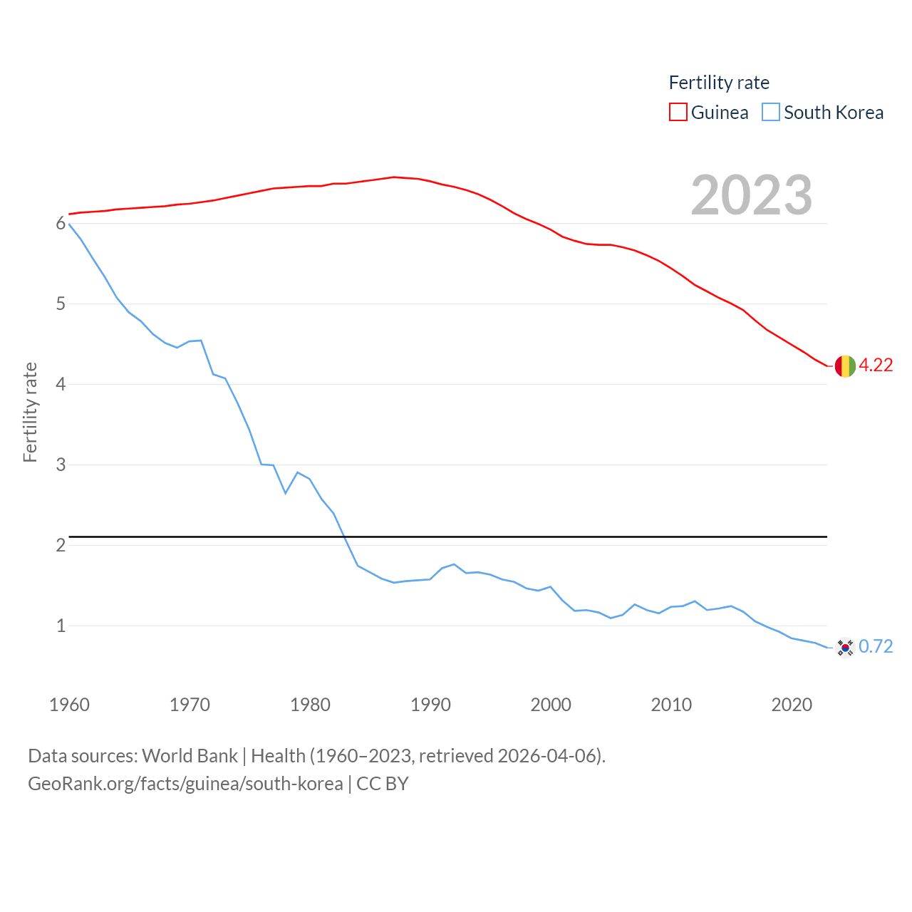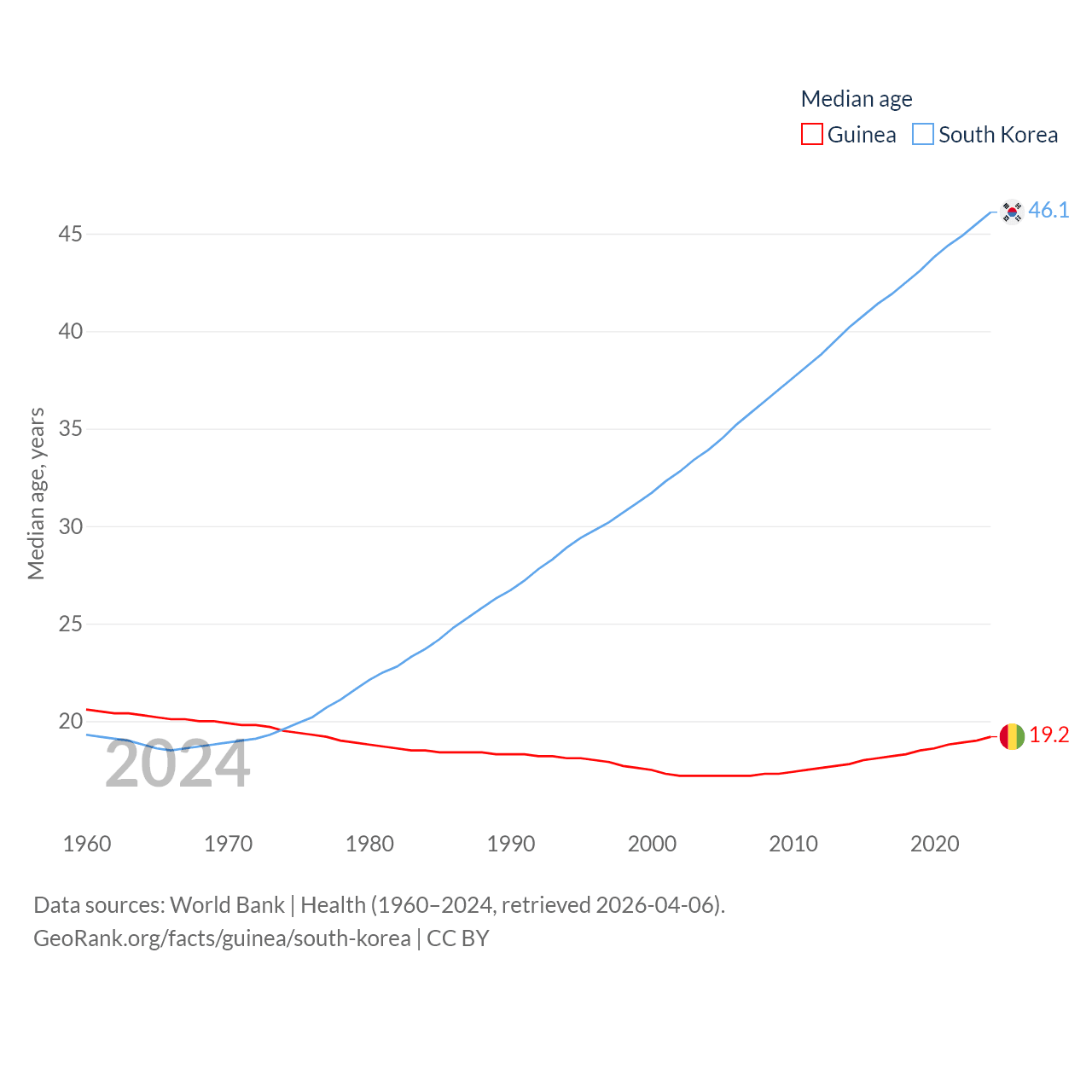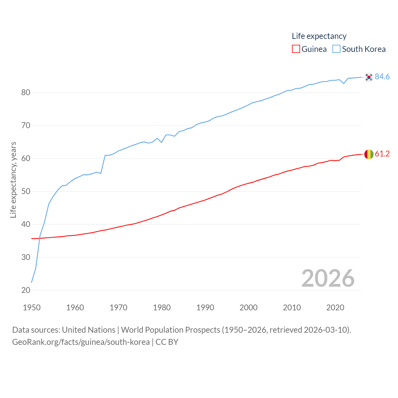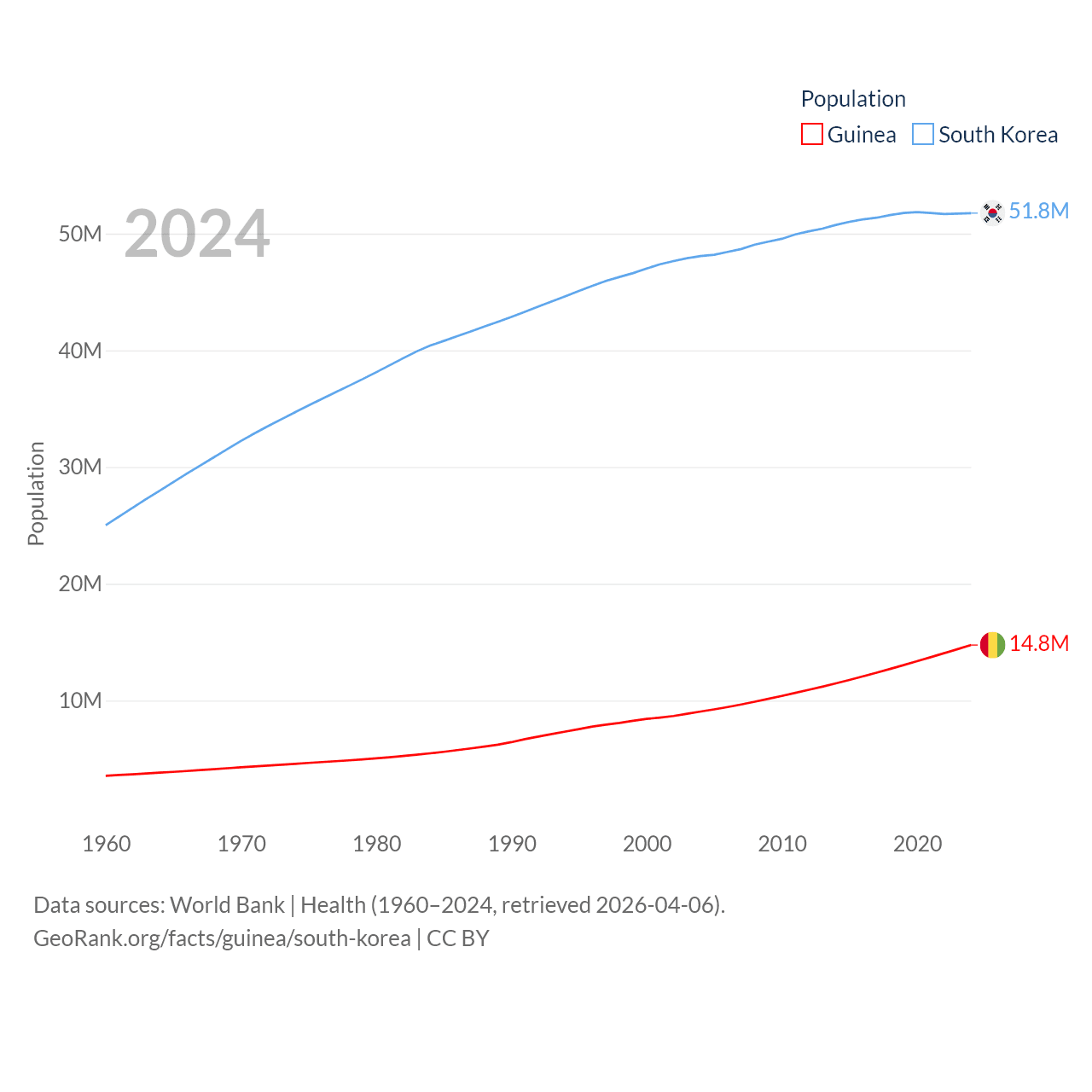 Guinea has a population of 14.8M (ranked 75/197), compared with 51.8M in South Korea (ranked 29/197). Guinea's land area is 94,873 sq mi versus 37,684 sq mi for South Korea (ranked 77th vs. 105th).