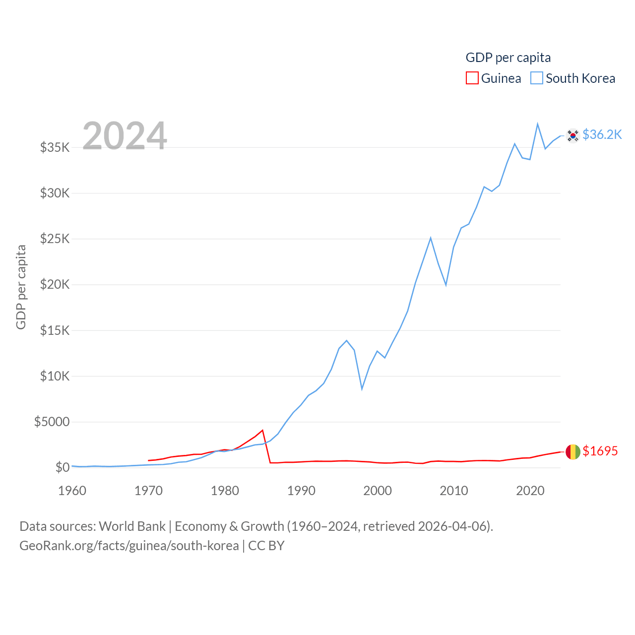 By GDP, Guinea ranks 118/197 ($25B) and South Korea ranks 12/197 ($1.88T). By GDP per capita, Guinea ranks 160/197 ($1,695), while South Korea ranks 31/197 ($36,239).
