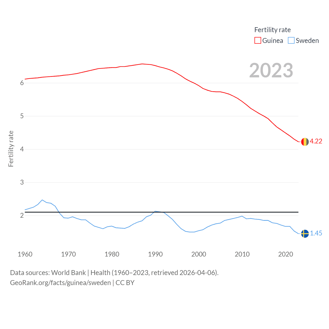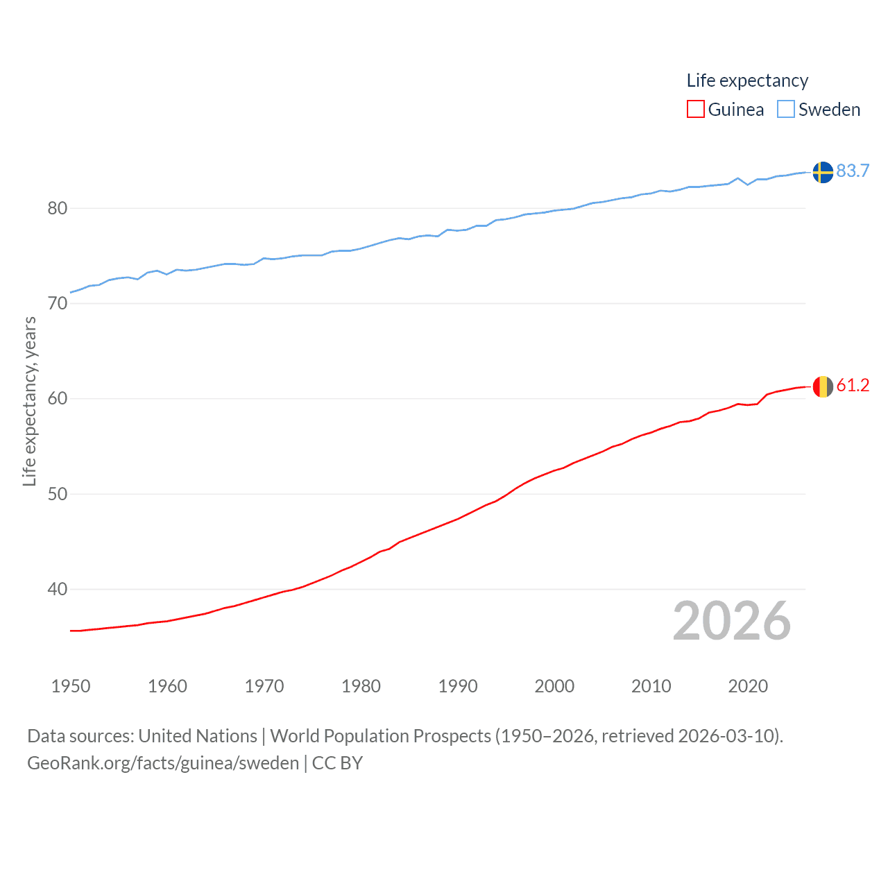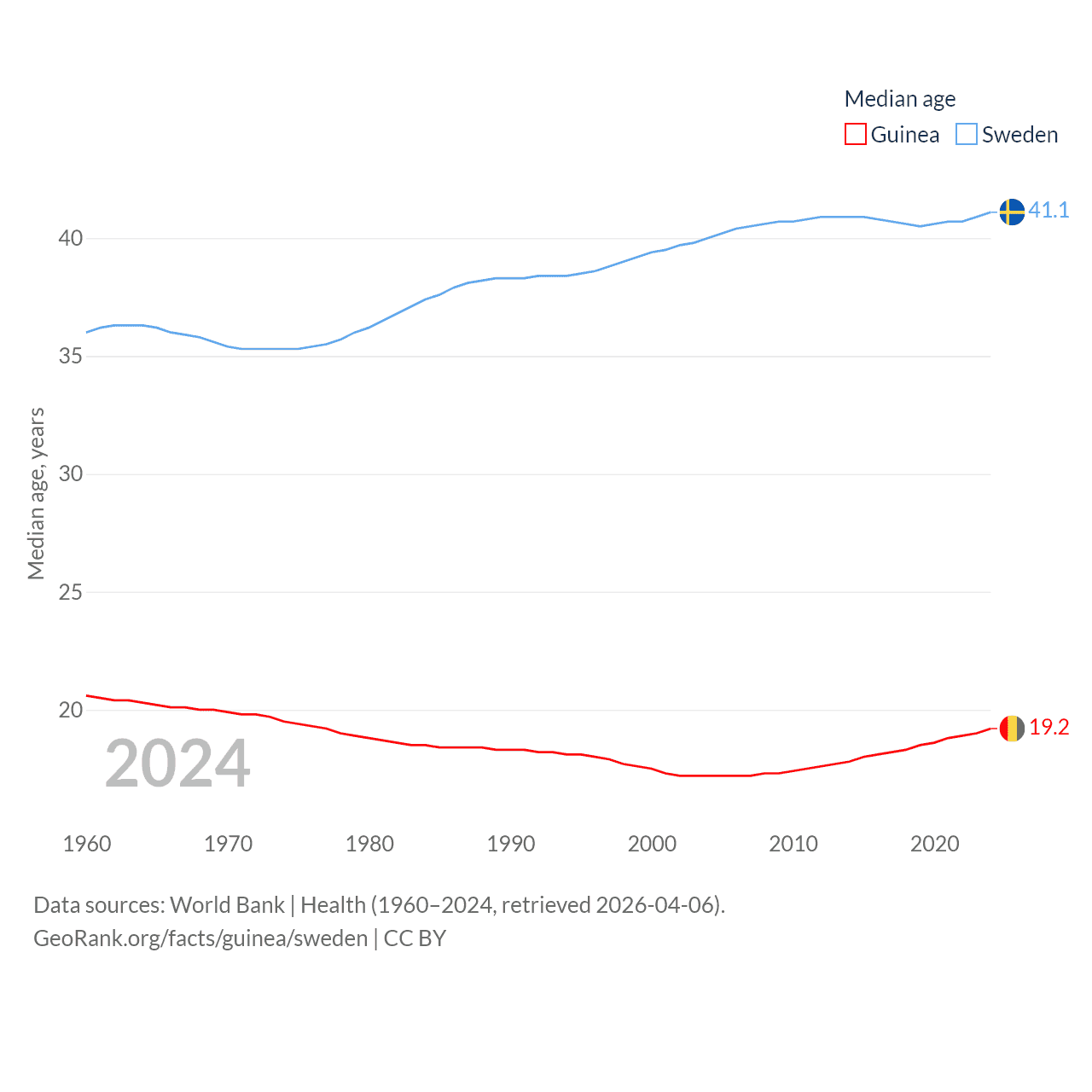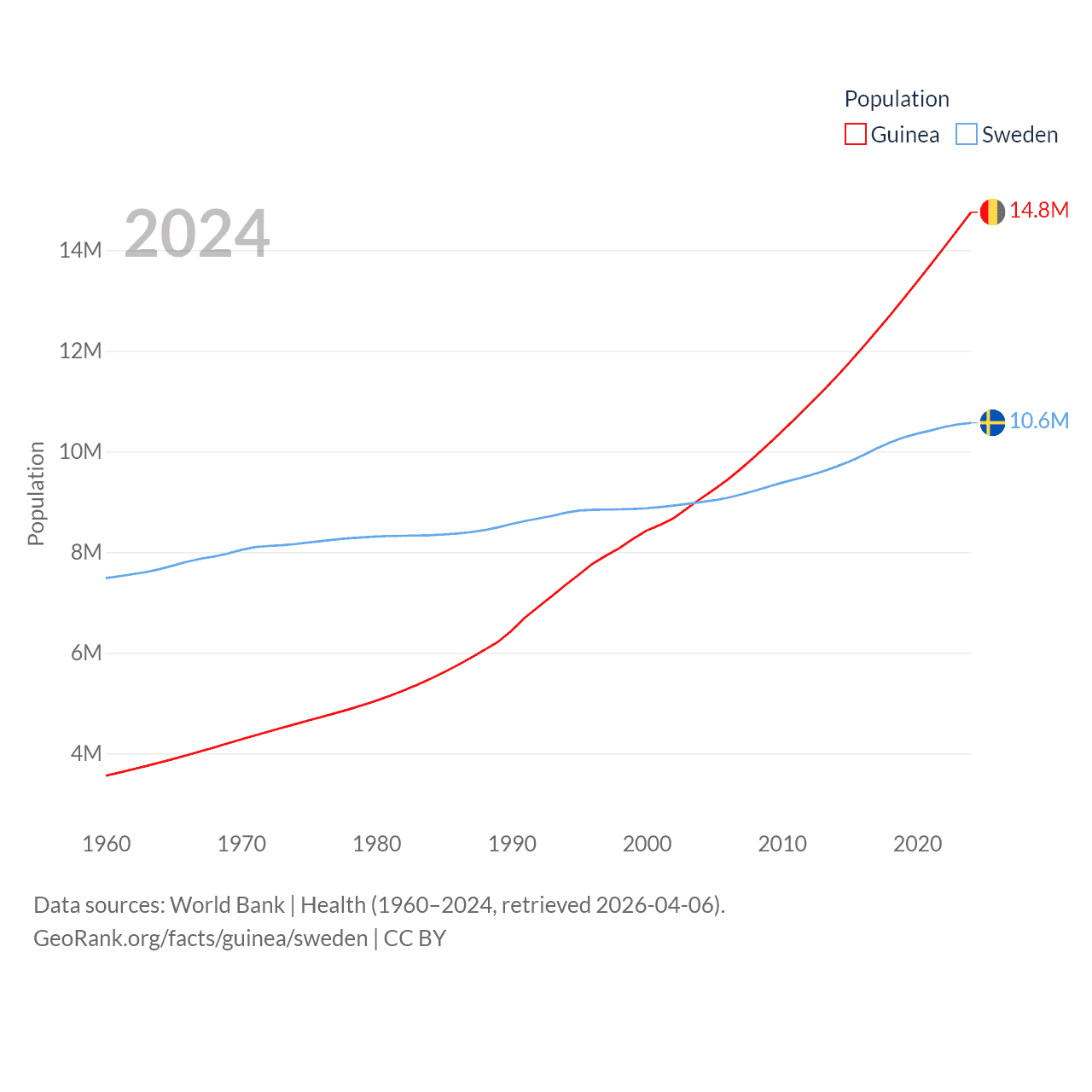 Guinea has a population of 14.8M (ranked 75/197), compared with 10.6M in Sweden (ranked 93/197). Guinea's land area is 94,873 sq mi versus 157,248 sq mi for Sweden (ranked 77th vs. 58th).