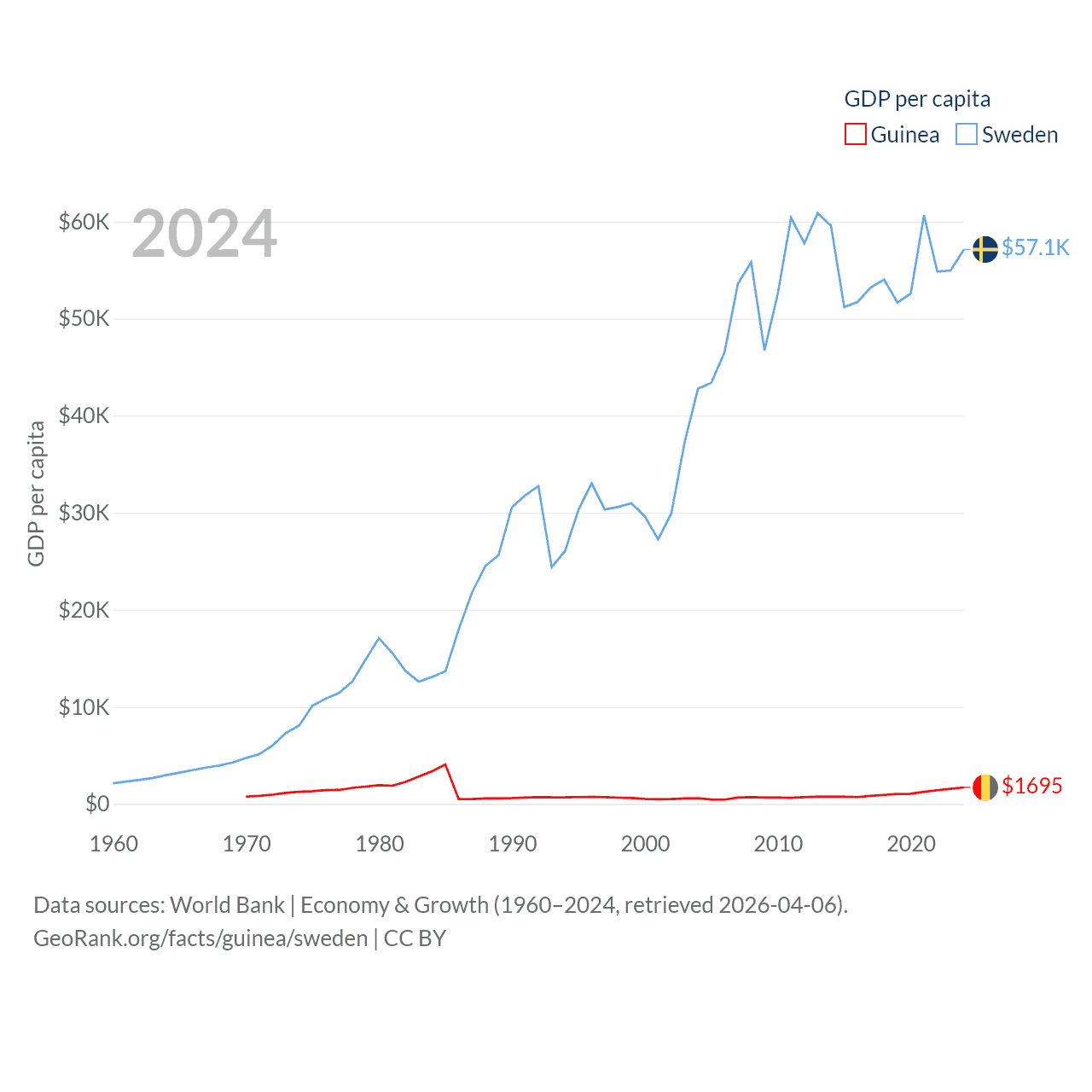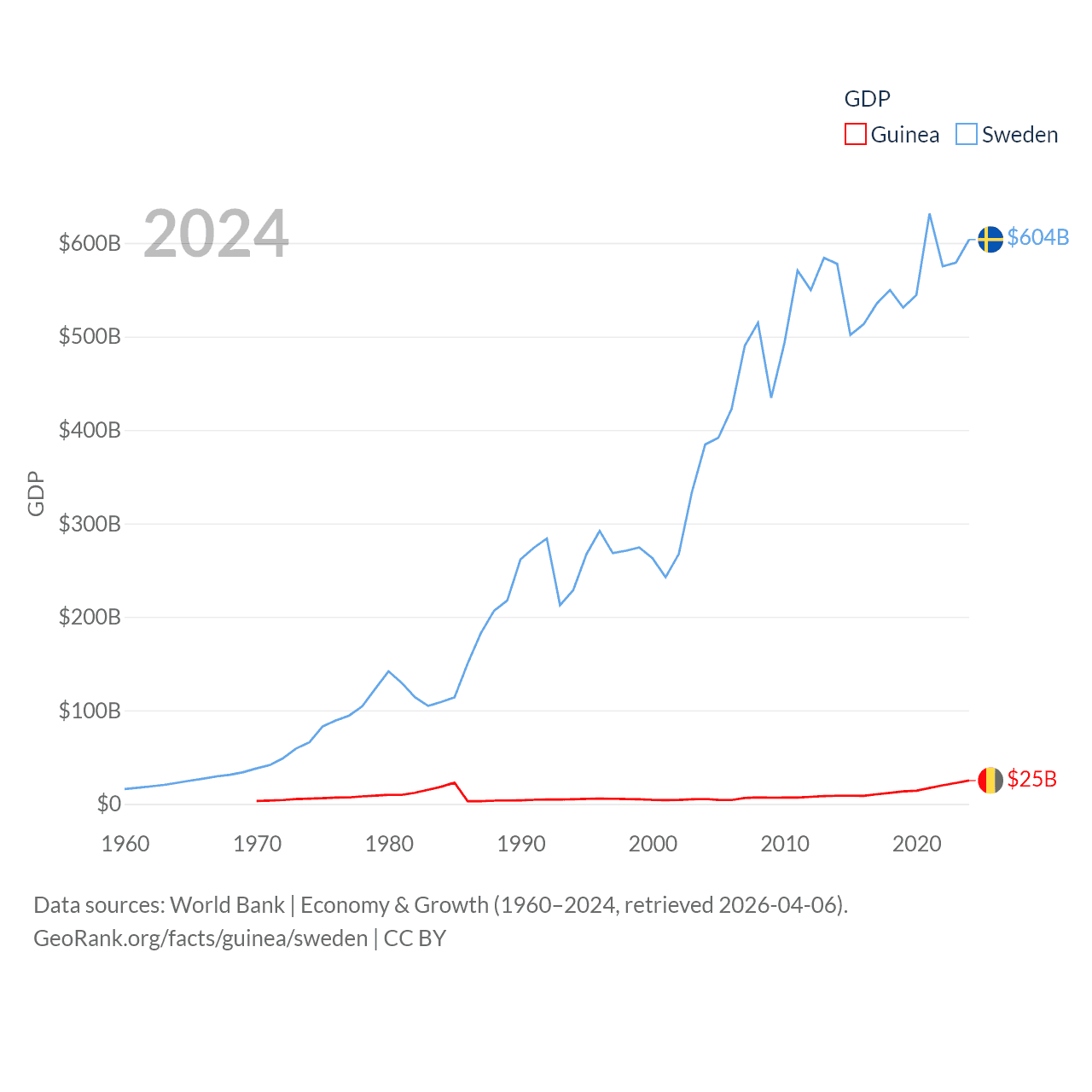 By GDP, Guinea ranks 118/197 ($25B) and Sweden ranks 26/197 ($604B). By GDP per capita, Guinea ranks 160/197 ($1,695), while Sweden ranks 17/197 ($57,117).